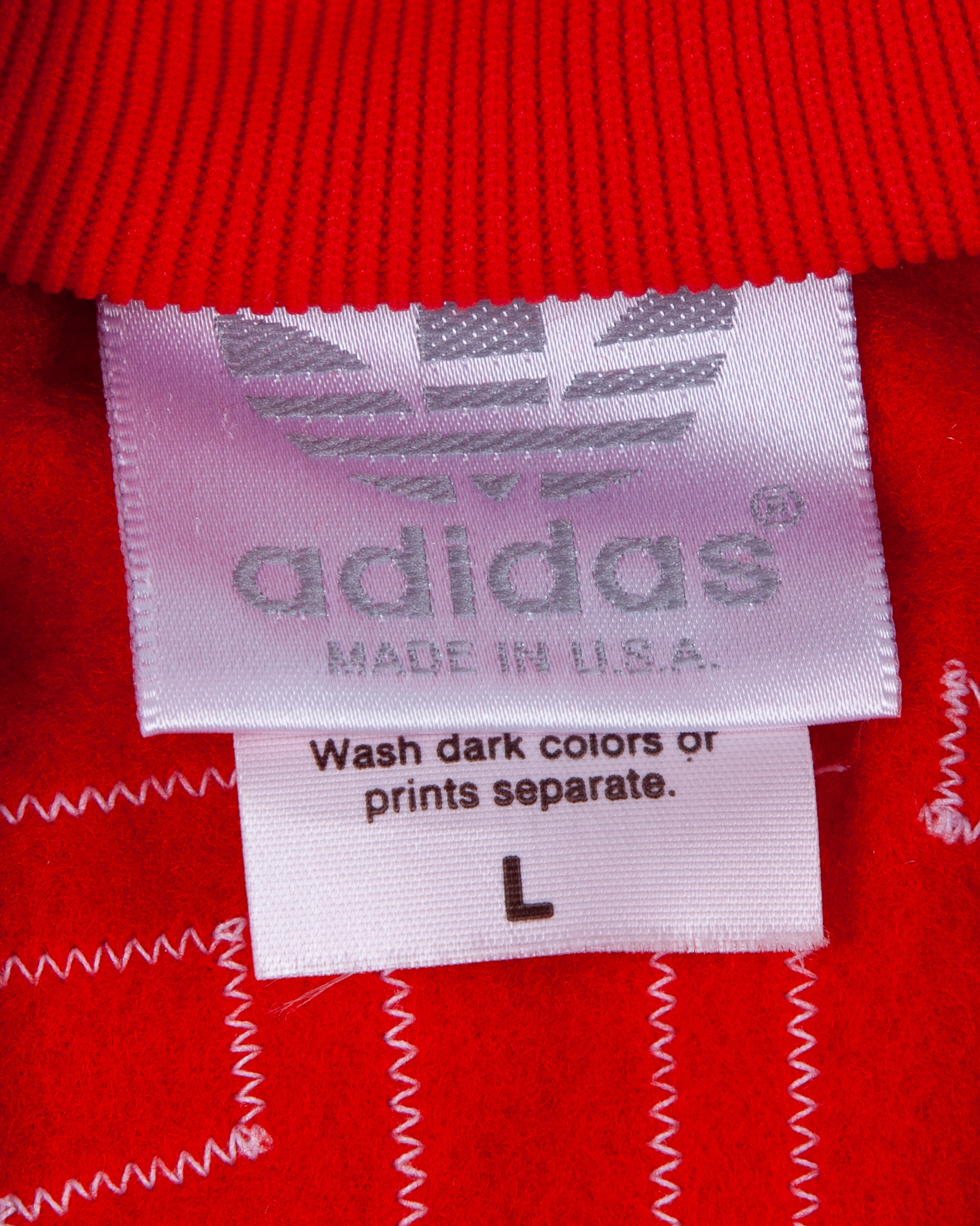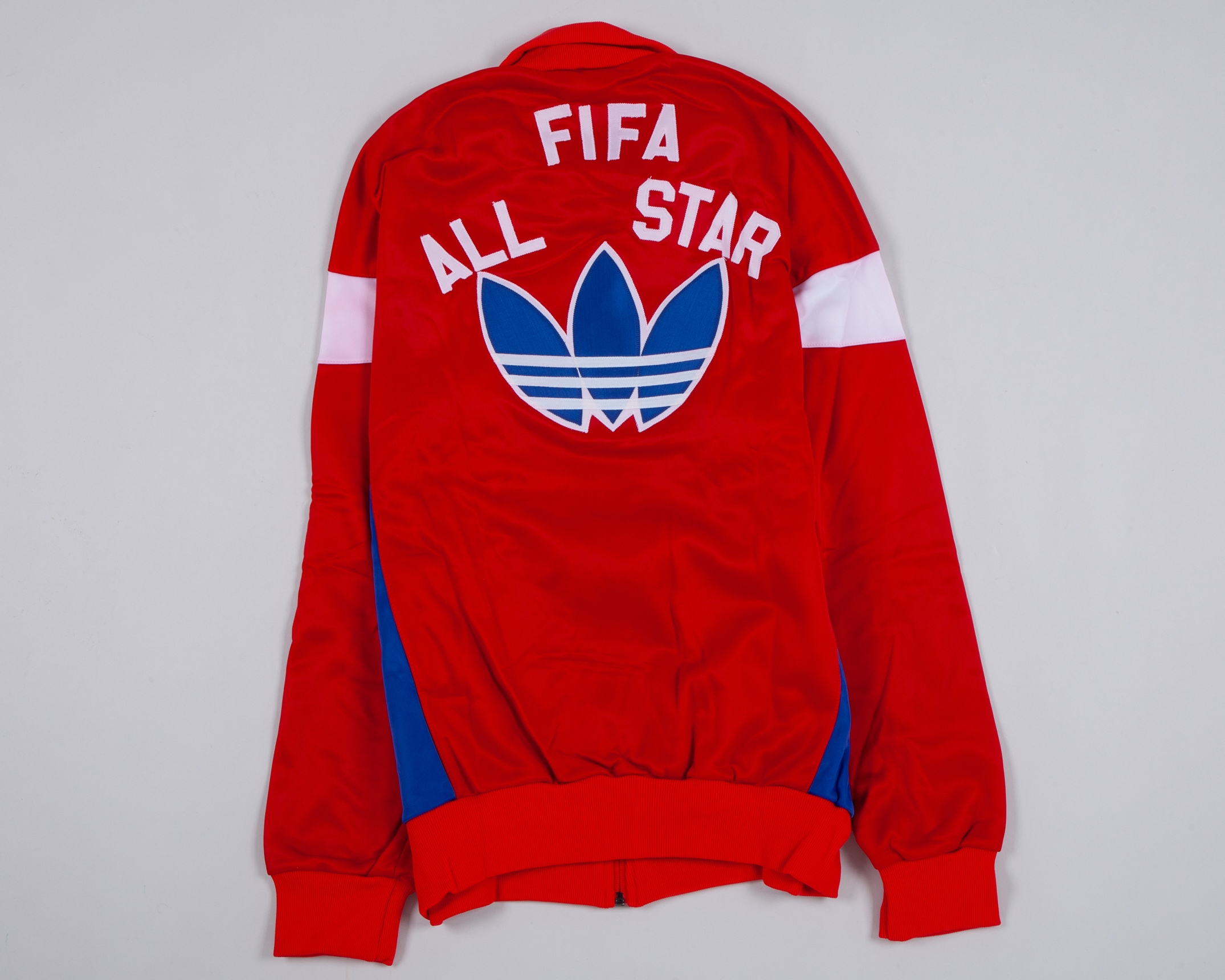 Pat Jennings red and white FIFA/UNICEF ALL STAR Game tracksuit top and bottoms, 1986, Adidas, L, with zip-up front and embroidered badge inscribed FIFA/UNICEF WORLD ALL-STAR GAME 1986, the reverse lettered FIFA ALL STAR, with Pat Jennings Collection autographed COA
