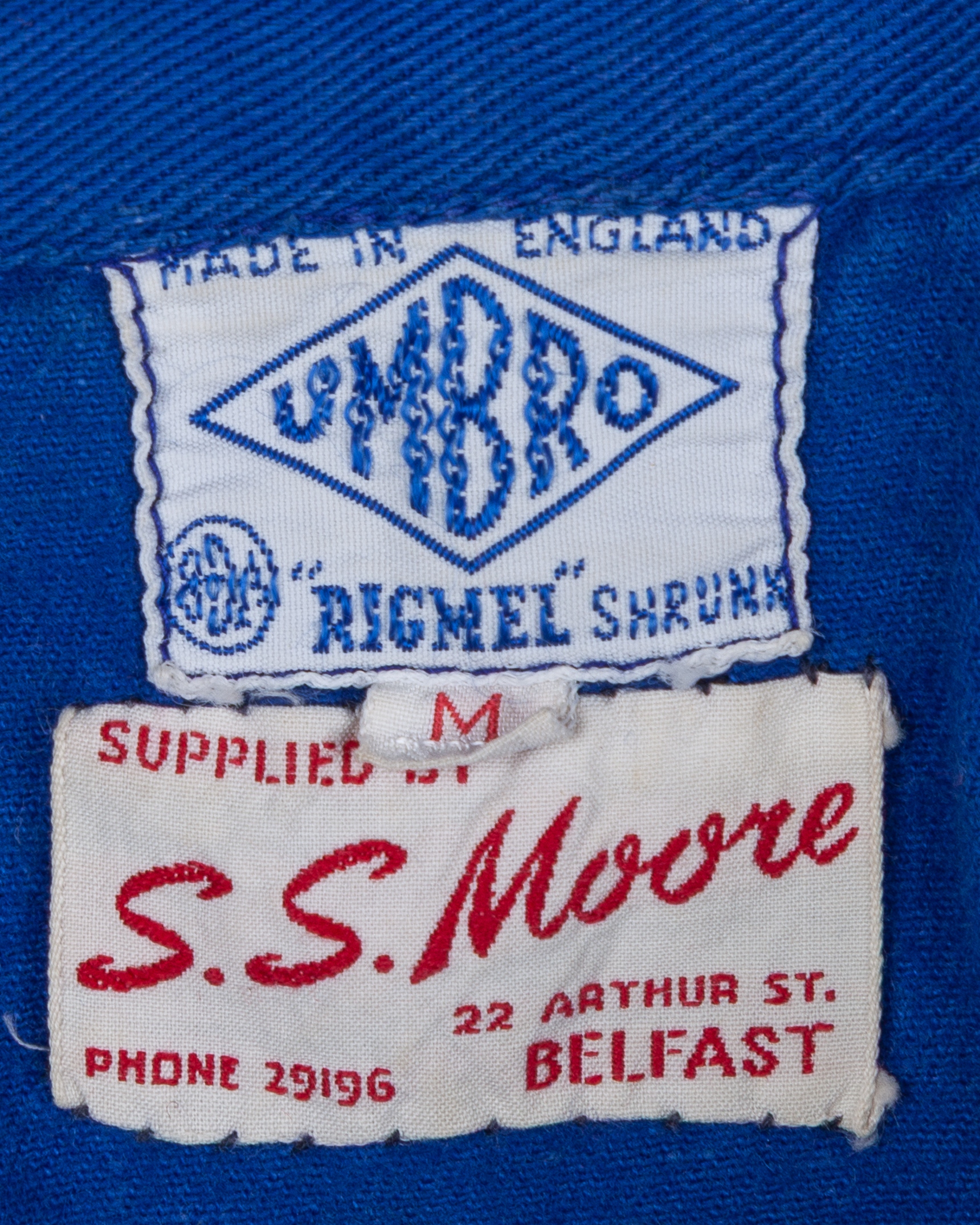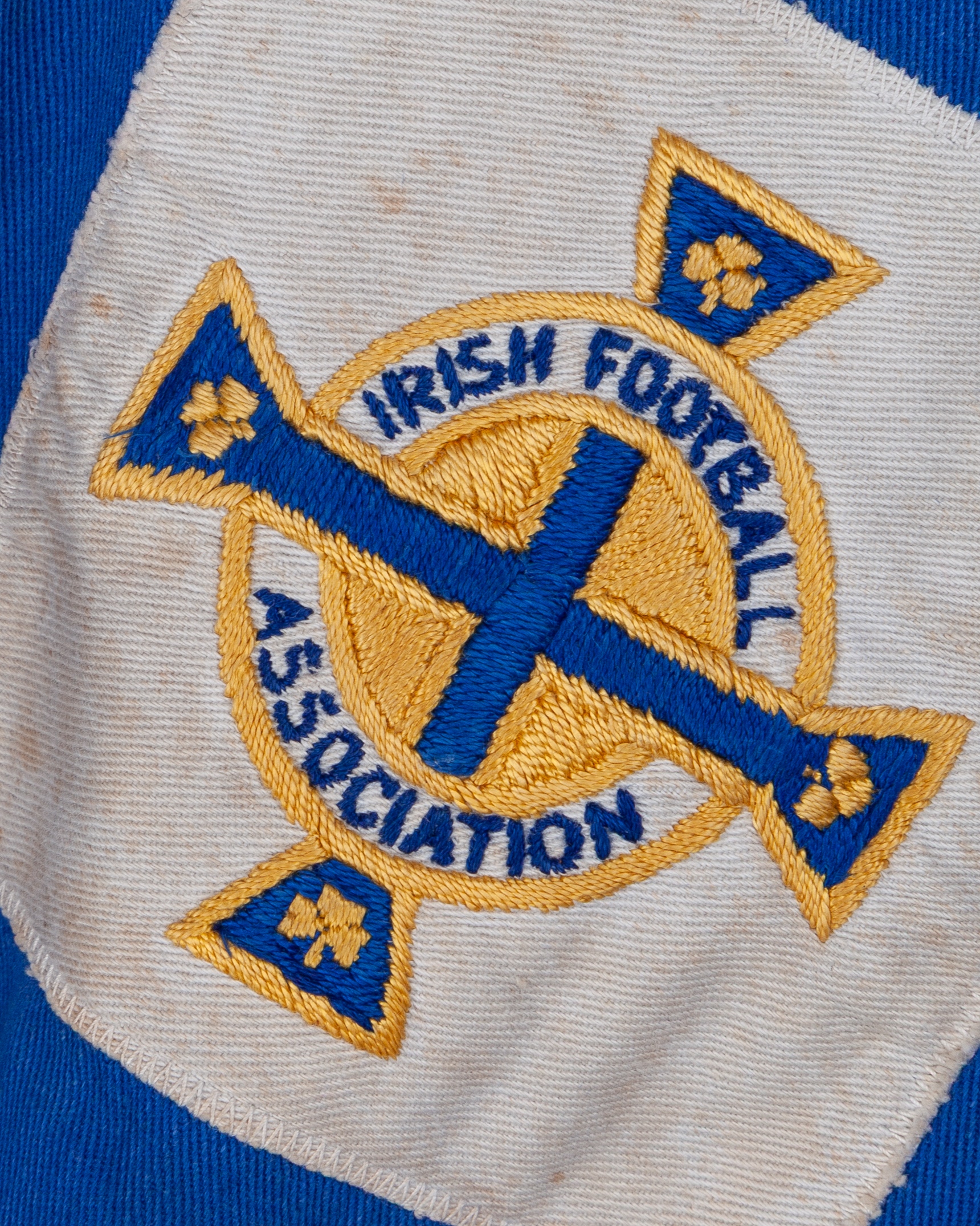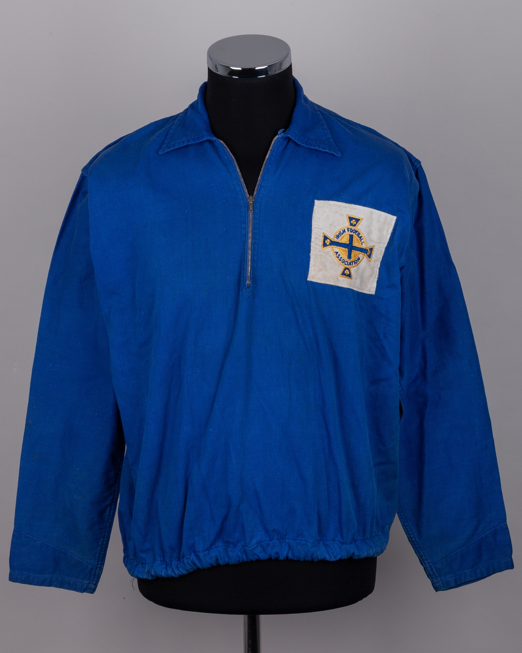 Pat Jennings blue Northern Ireland International track suit top, Umbro, M, with half zip front and embroidered cloth badge inscribed IRISH FOOTBALL ASSOCOIATION, with Pat Jennings Collection autographed COA