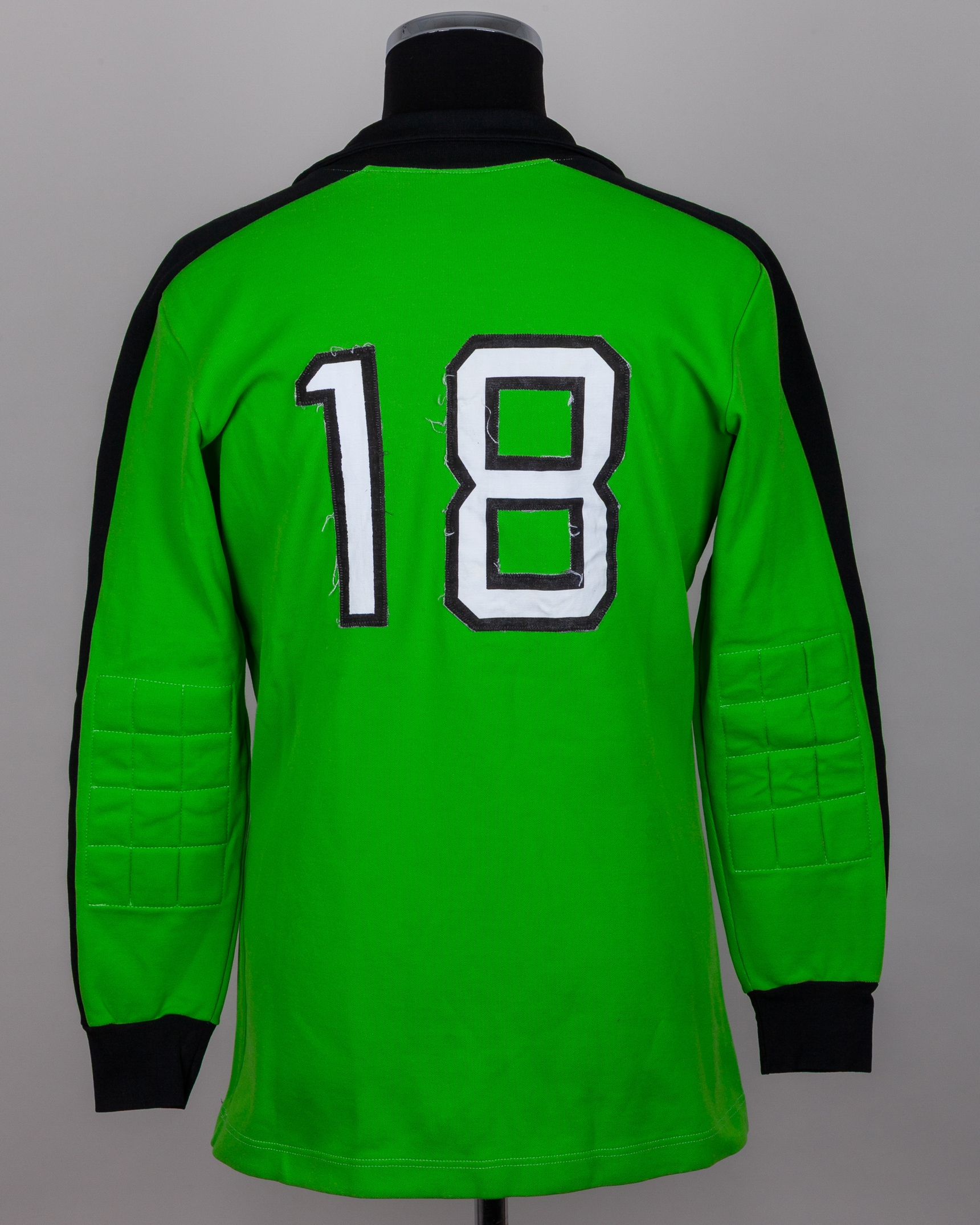 Pat Jennings green and black No.18 Bulova v. Liverpool goalkeepers shirt, 1983