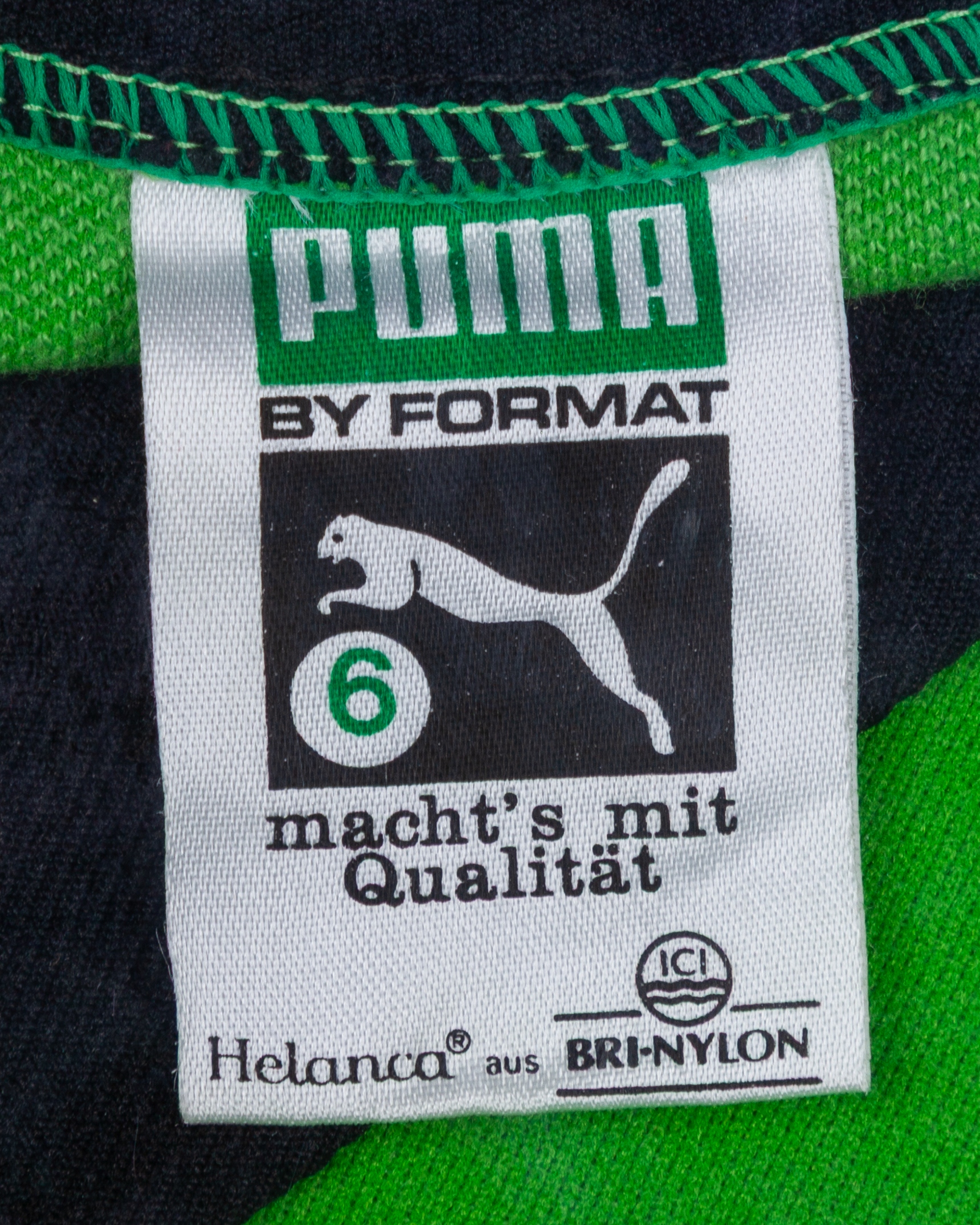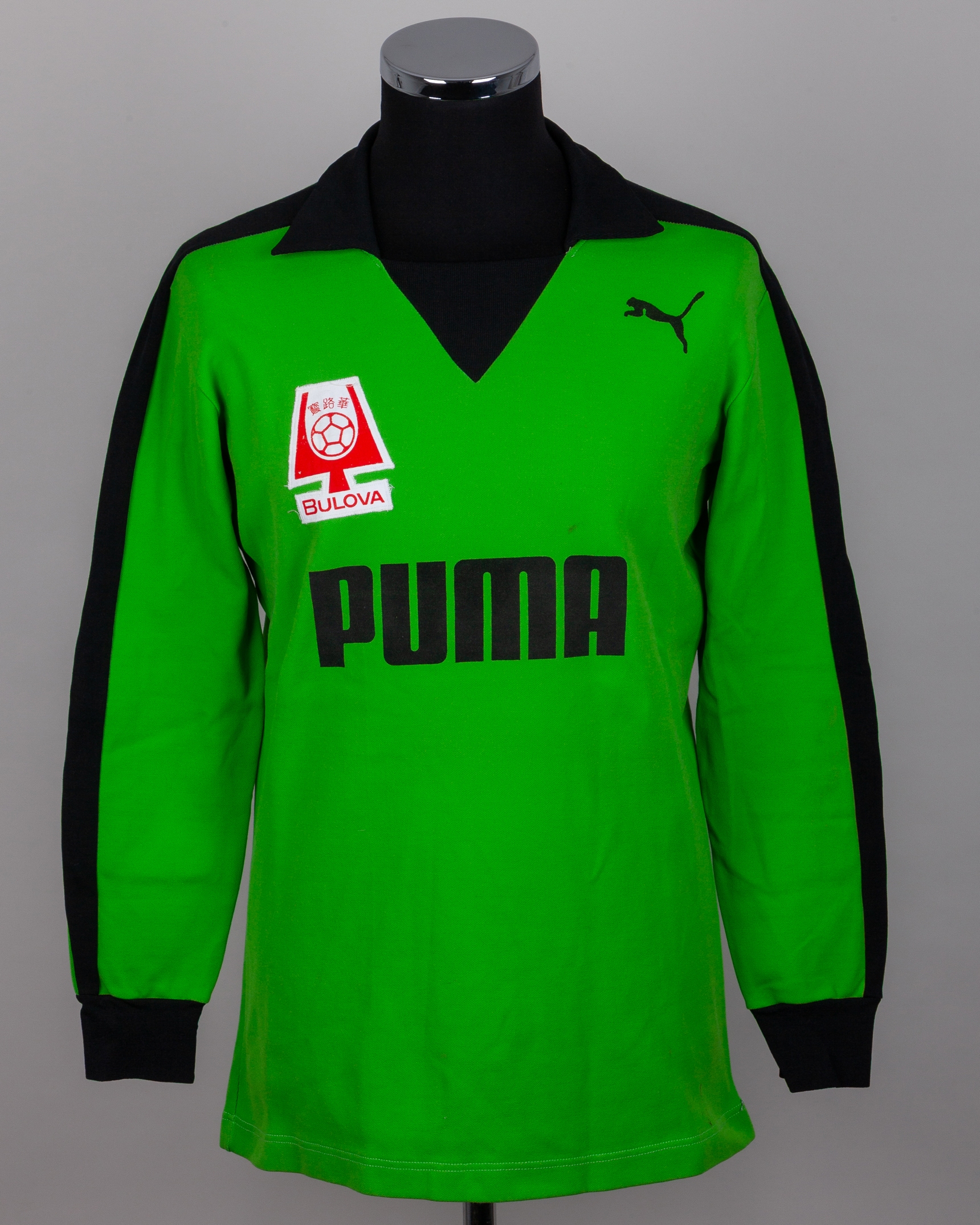 Pat Jennings green and black No.18 Bulova v. Liverpool goalkeepers shirt, 1983, Puma, 6, with v-neck collar and embroidered cloth badge inscribed BULOVA, with Pat Jennings Collection autographed COA