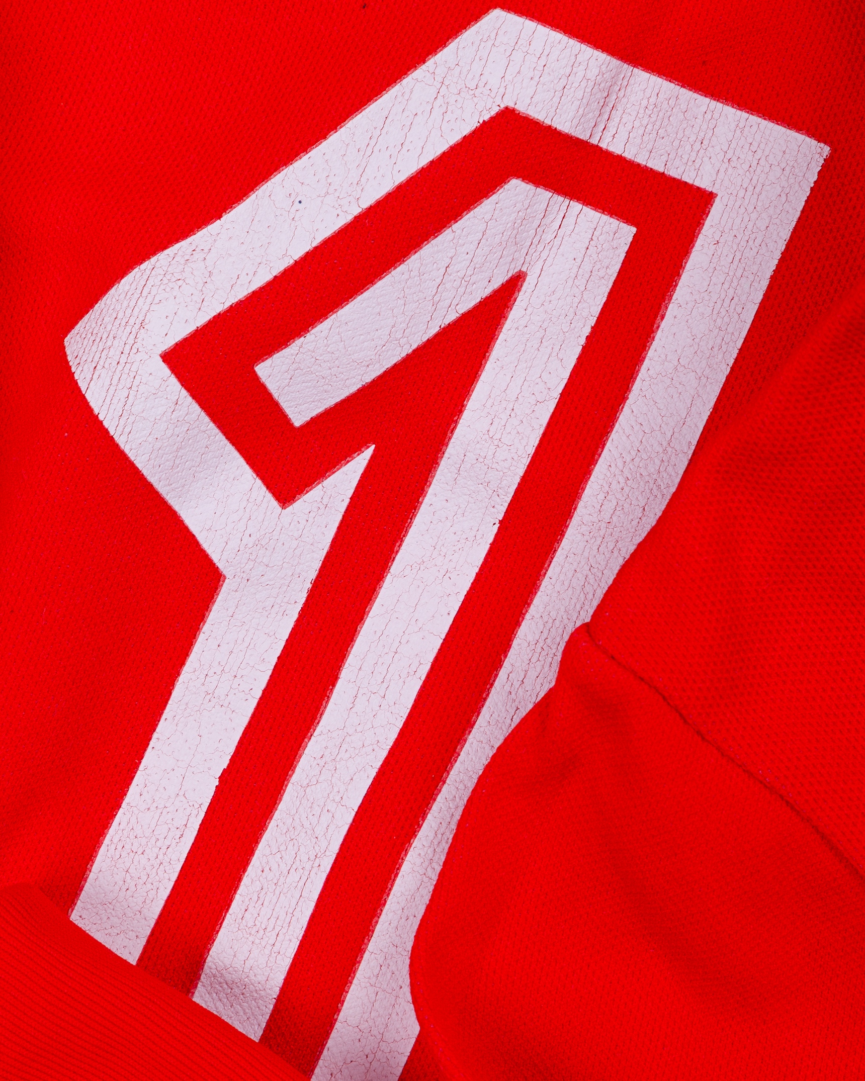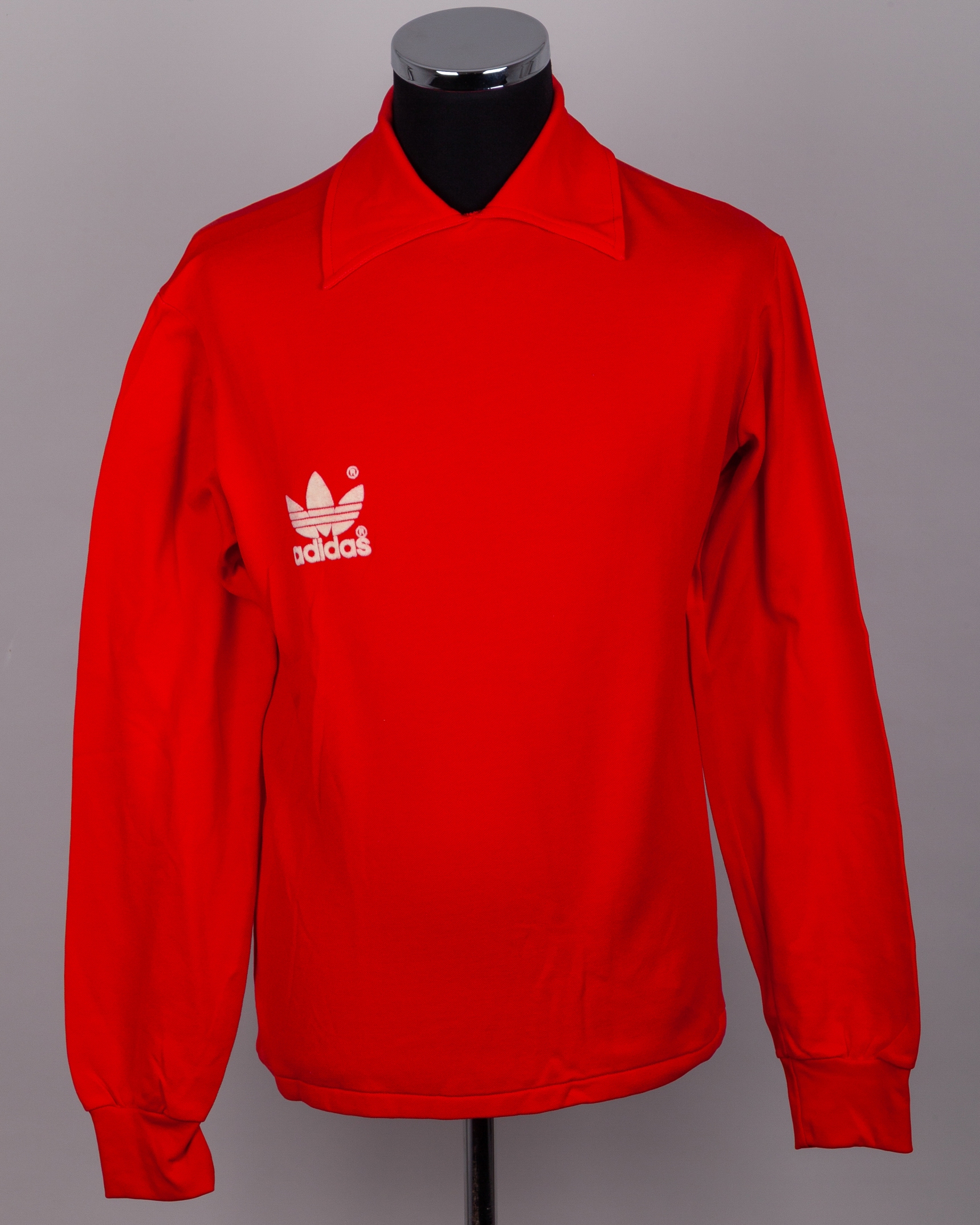 Pat Jennings red No.1 Northern Ireland goalkeepers match worn shirt, Adidas, L, with crew-neck collar, with Pat Jennings Collection autographed COA