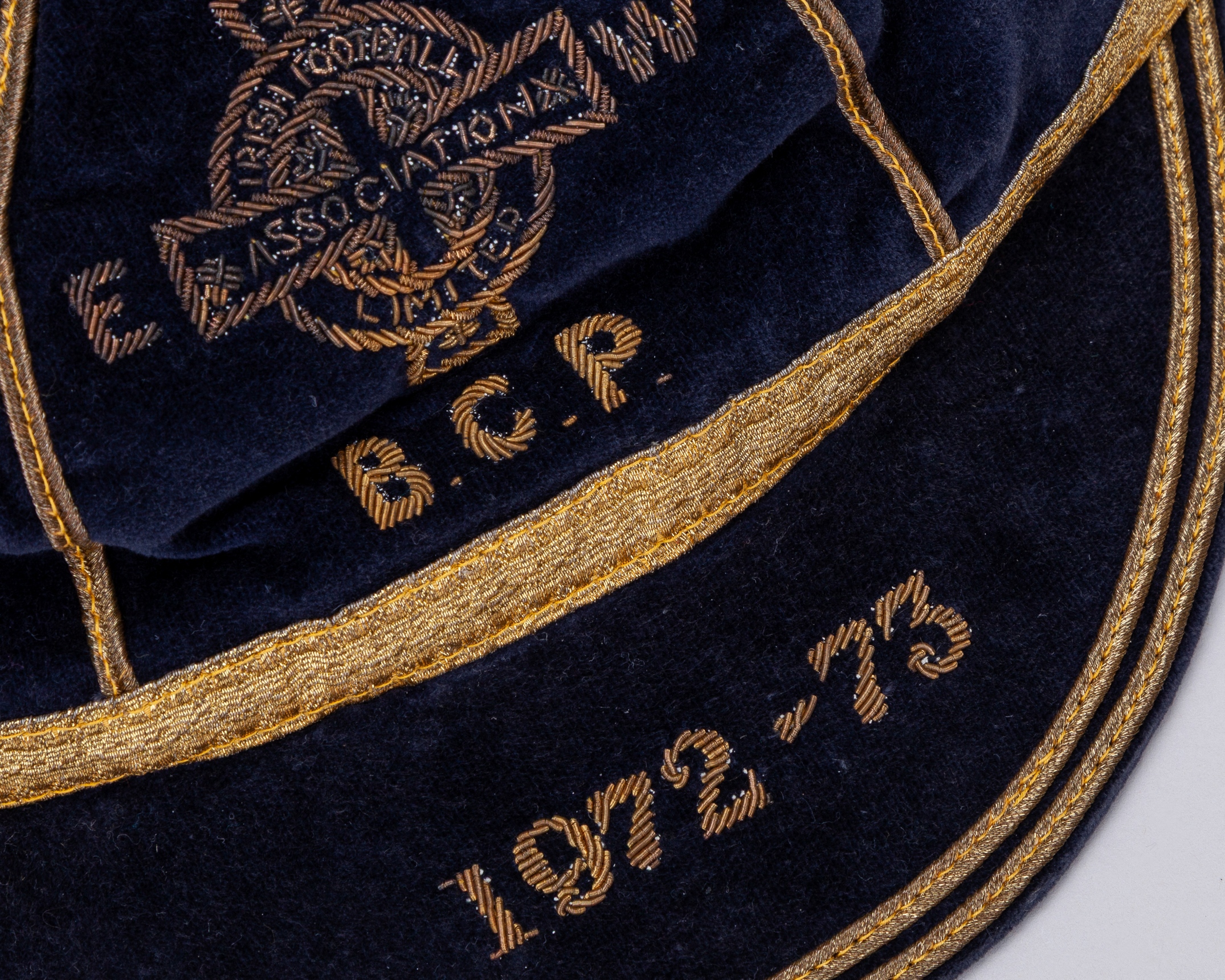The above cap represents Pat's 39th, 40th, 41st, 42nd, 43rd and 44th International appearances. In the World Cup qualifying match against Bulgaria played on 18th October 1972 in Sofia, Bulgaria defeated Northern Ireland 3-0, in the World Cup qualifying match against Cyprus played on 14th February 1973, Cyprus defeated Northern Ireland 1-0, in the match against England played on 12th May 1973 at Goodison Park, England defeated Northern Ireland 2-1, in the match against Scotland played on 16th May 1973 at Hampden Park, Northern Ireland defeated Scotland 2-1 and in the match against Wales played on 19th May at Goodison Park, Northern Ireland defeated Wales 1-0