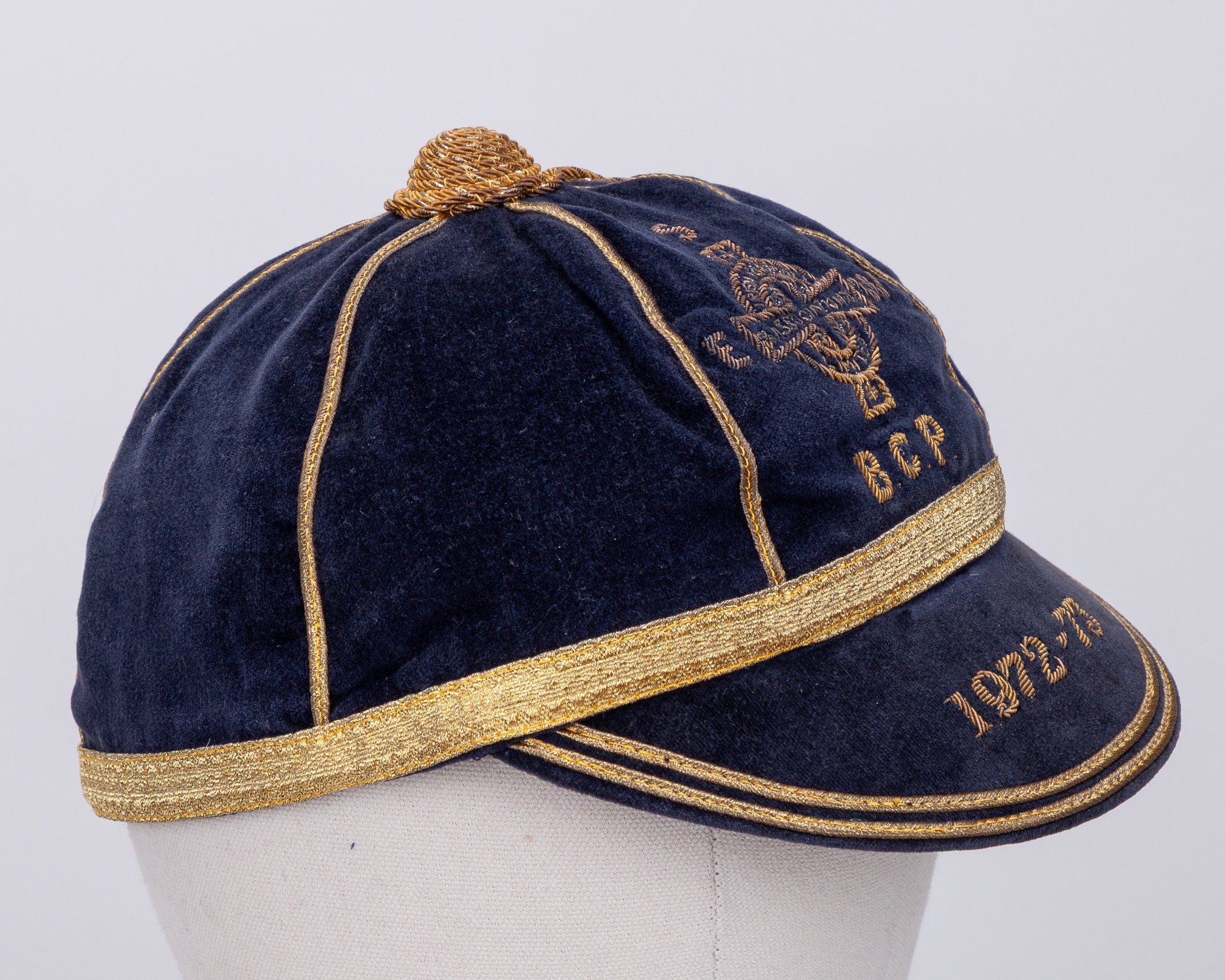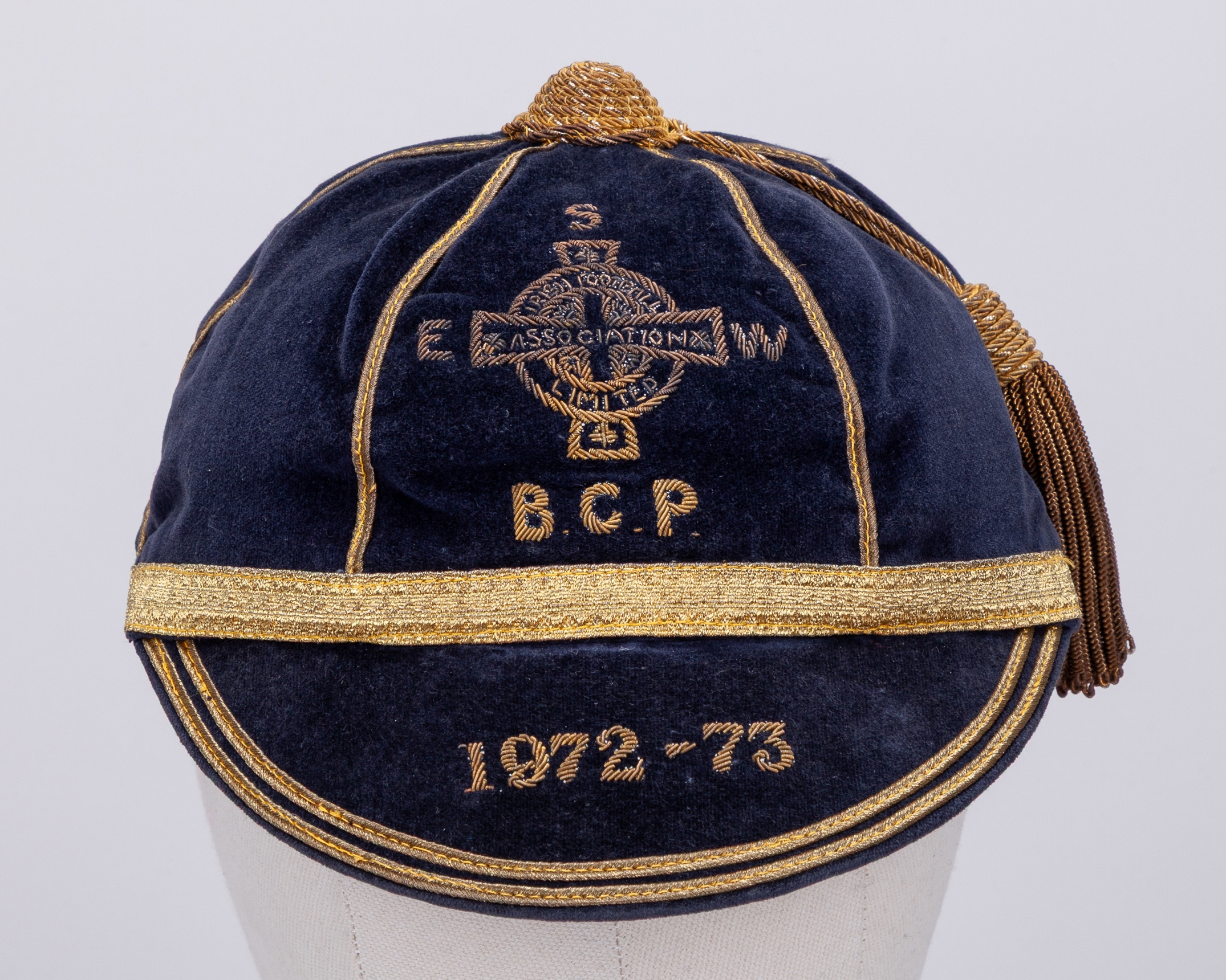 Pat Jennings blue Northern Ireland v. Bulgaria, Cyprus, Portugal, England Scotland and Wales International cap, 1972-73, blue velvet cap with gilt tassel and braiding inscribed B.C.P. S E W 1970-71, the interior inscribed in ink Pat Jennings, with Pat Jennings Collection autographed COA