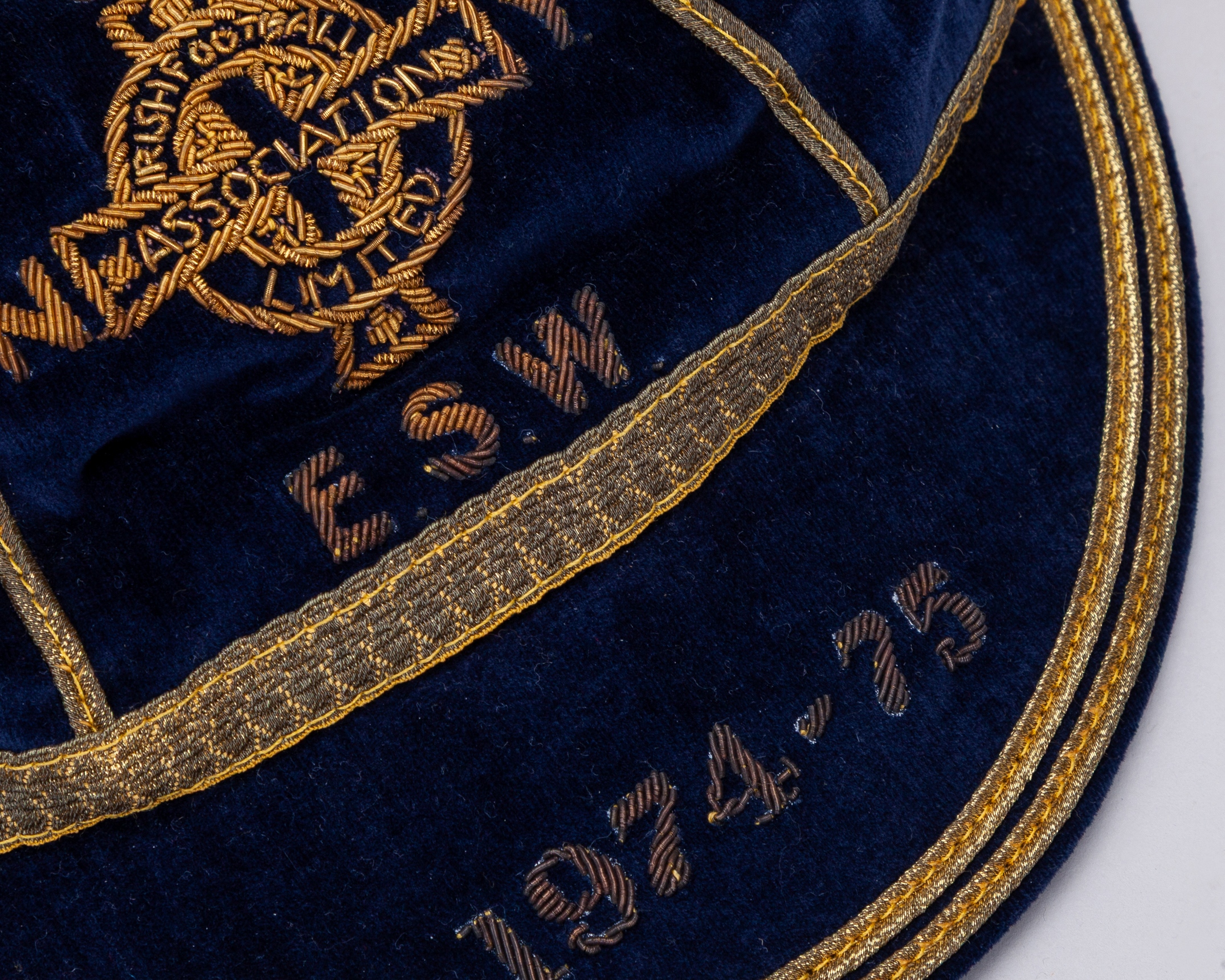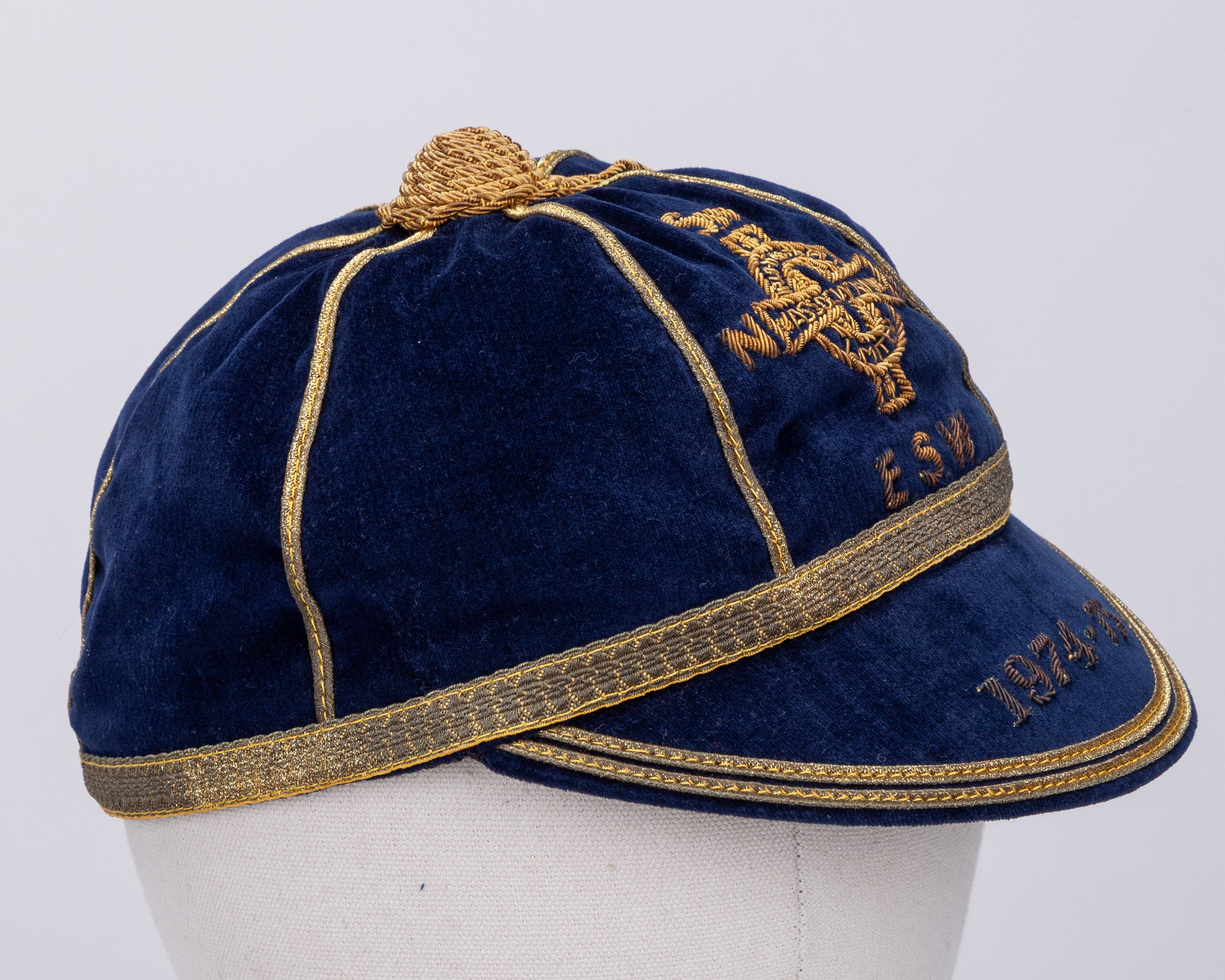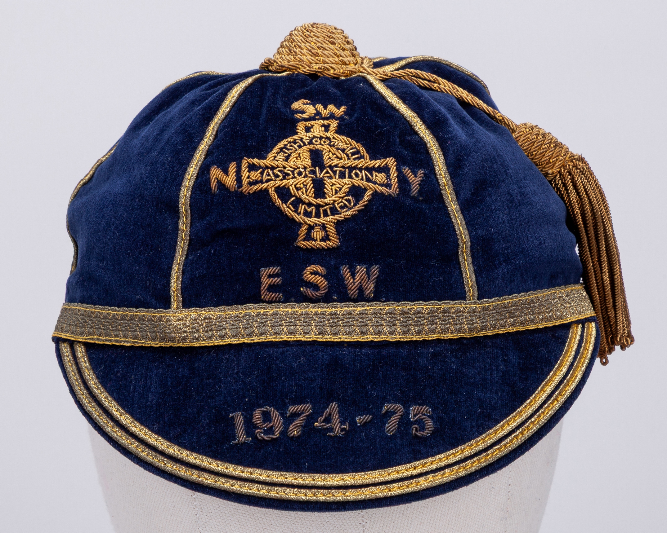 Pat Jennings blue Northern Ireland v. Norway, Sweden, Yugoslavia, England, Scotland and Wales International cap, 1974-75, blue velvet cap with gilt tassel and braiding inscribed N Sw Y E.S.W. 1974-75, the interior inscribed in ink Pat Jennings, with Pat Jennings Collection autographed COA