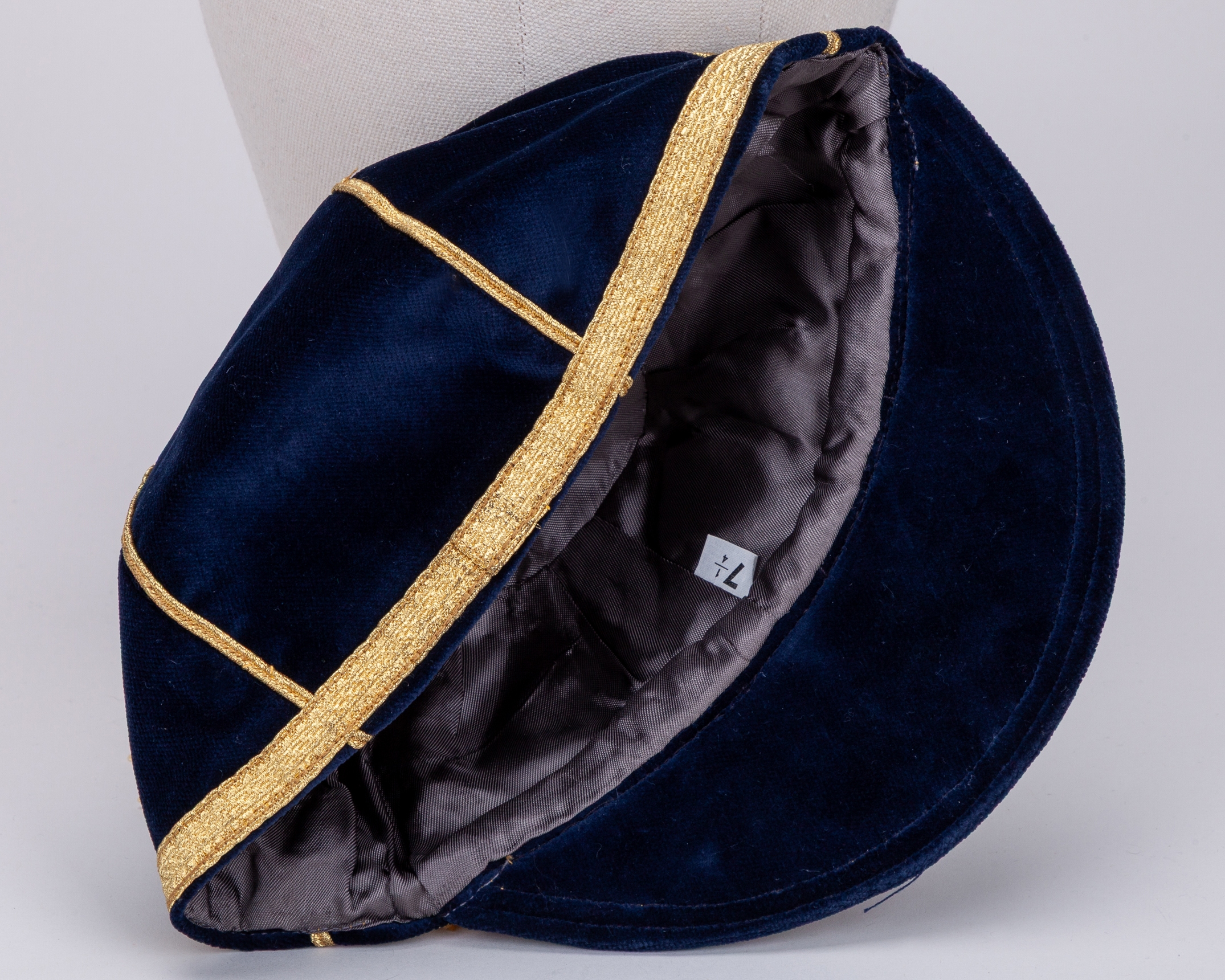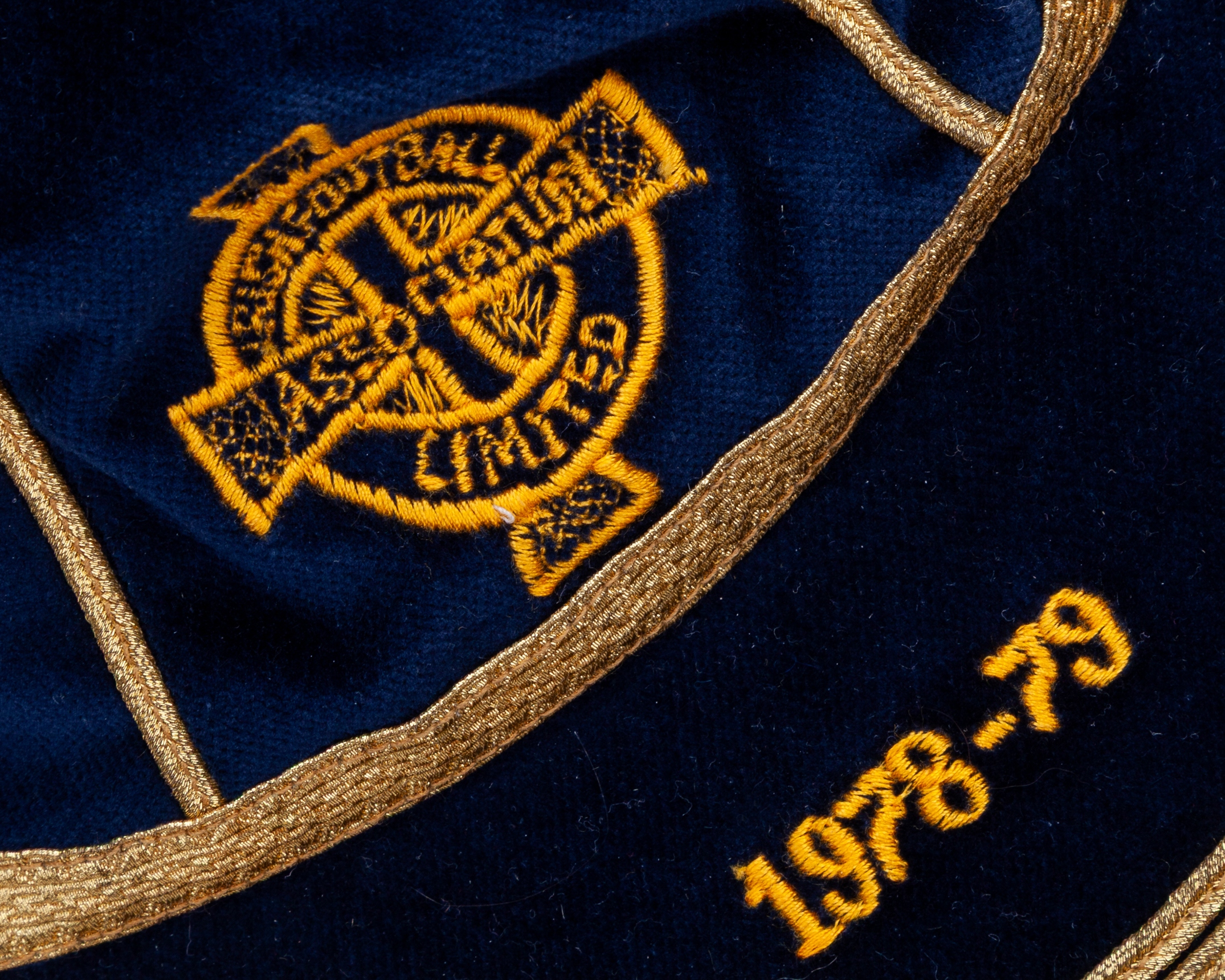 Pat Jennings blue Northern Ireland v. Republic of Ireland, Denmark, Bulgaria, England, Bulgaria, England, Scotland, Wales and Denmark International cap, 1978-79, blue velvet cap with yellow tassel and braiding inscribed 1978-79, with Pat Jennings Collection autographed COA