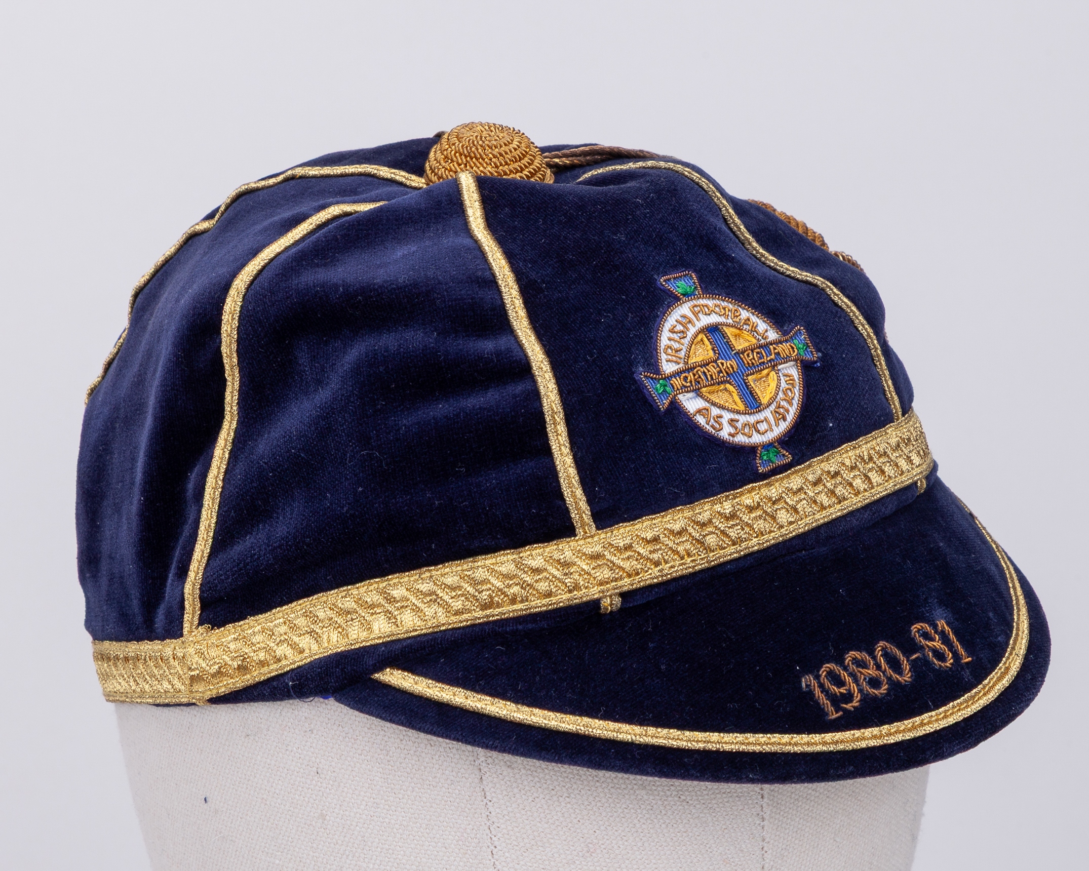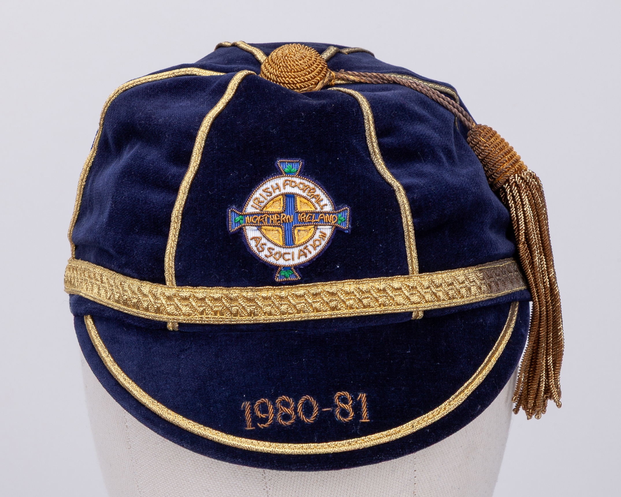 Pat Jennings blue Northern Ireland v. Scotland, Portugal, Scotland and Sweden International cap, 1980-81, blue velvet cap with gilt tassel and braiding inscribed 1980-81, with Pat Jennings Collection autographed COA