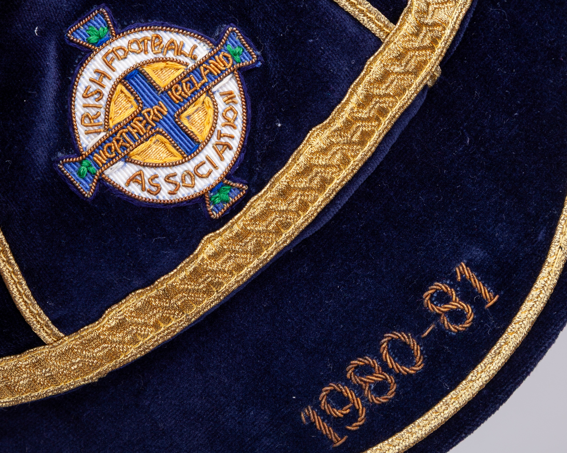 The above cap represents Pat's 84th, 85th, 86th and 87th International appearances. In the World Cup qualifying match against Scotland played on 25th March 1981 at Hampden Park, the teams drew the match 1-1, in the World Cup qualifying match against Portugal played on 29th April 1981 at Windsor Park, Northern Ireland defeated Portugal 1-0, in the match against Scotland played on 19th May 1981 at Hampden Park, Scotland defeated Northern Ireland 2-0 and in the World Cup qualifying match against Sweden played on 3rd June 1981 in Stockholm, Sweden defeated Northern Ireland 1-0