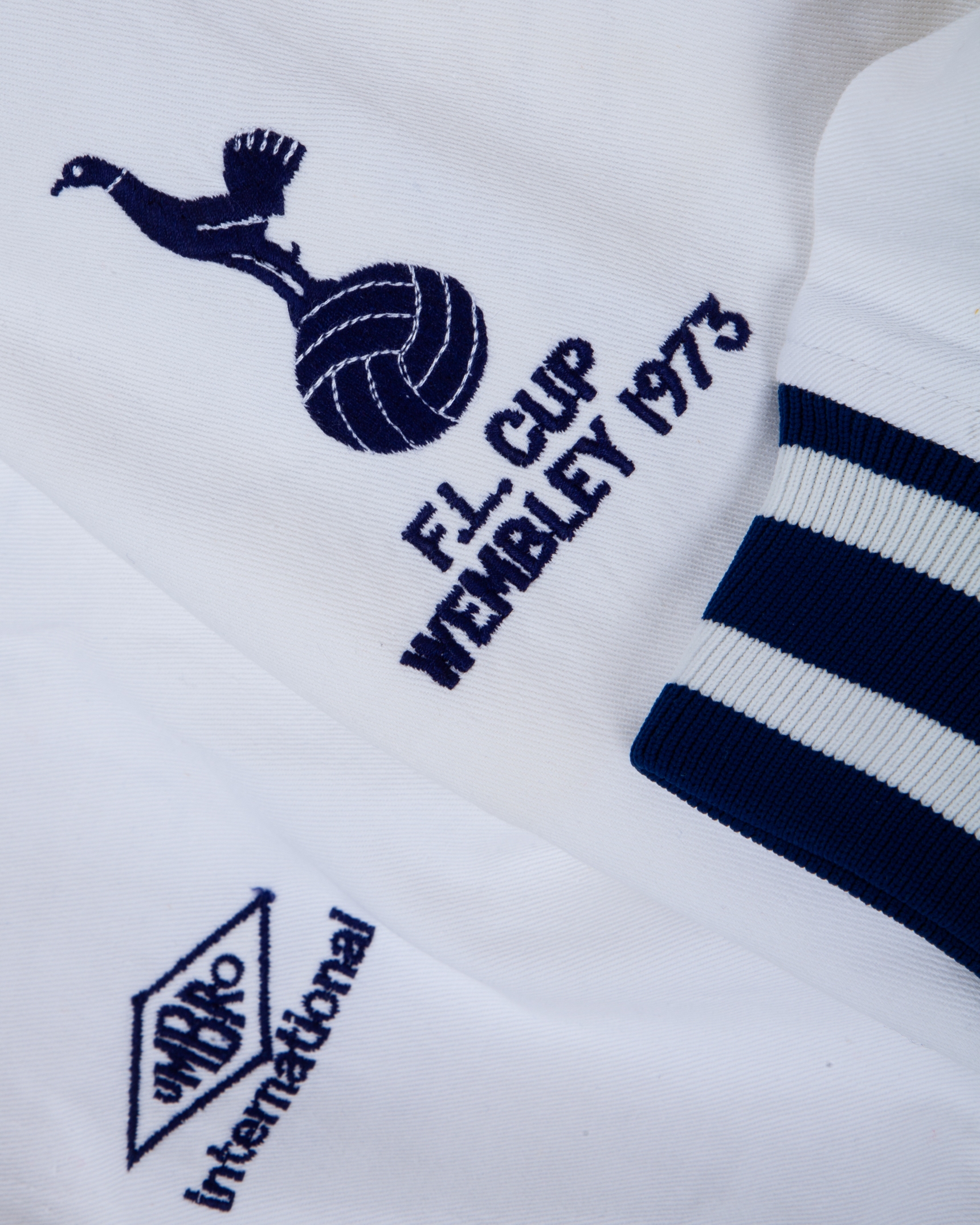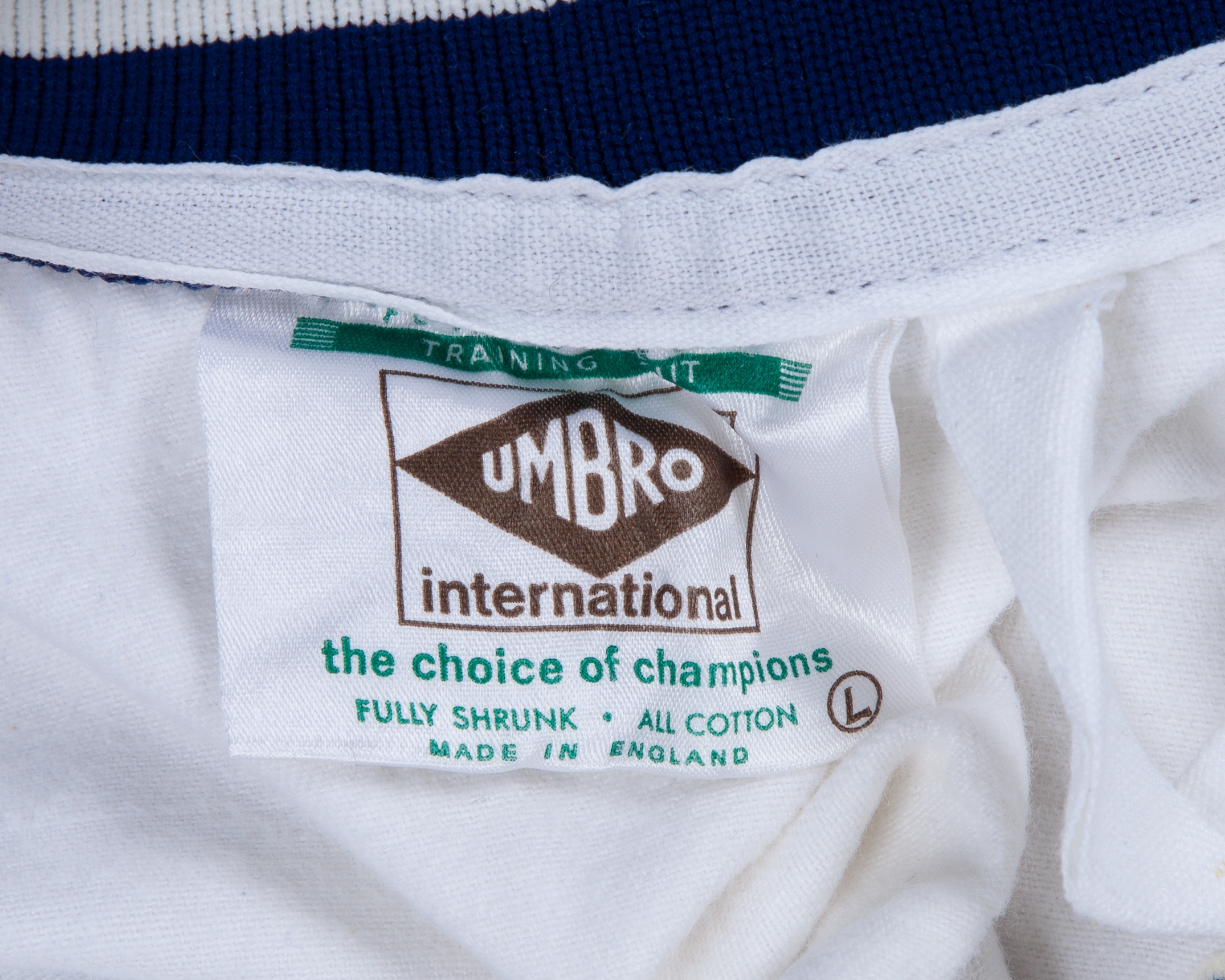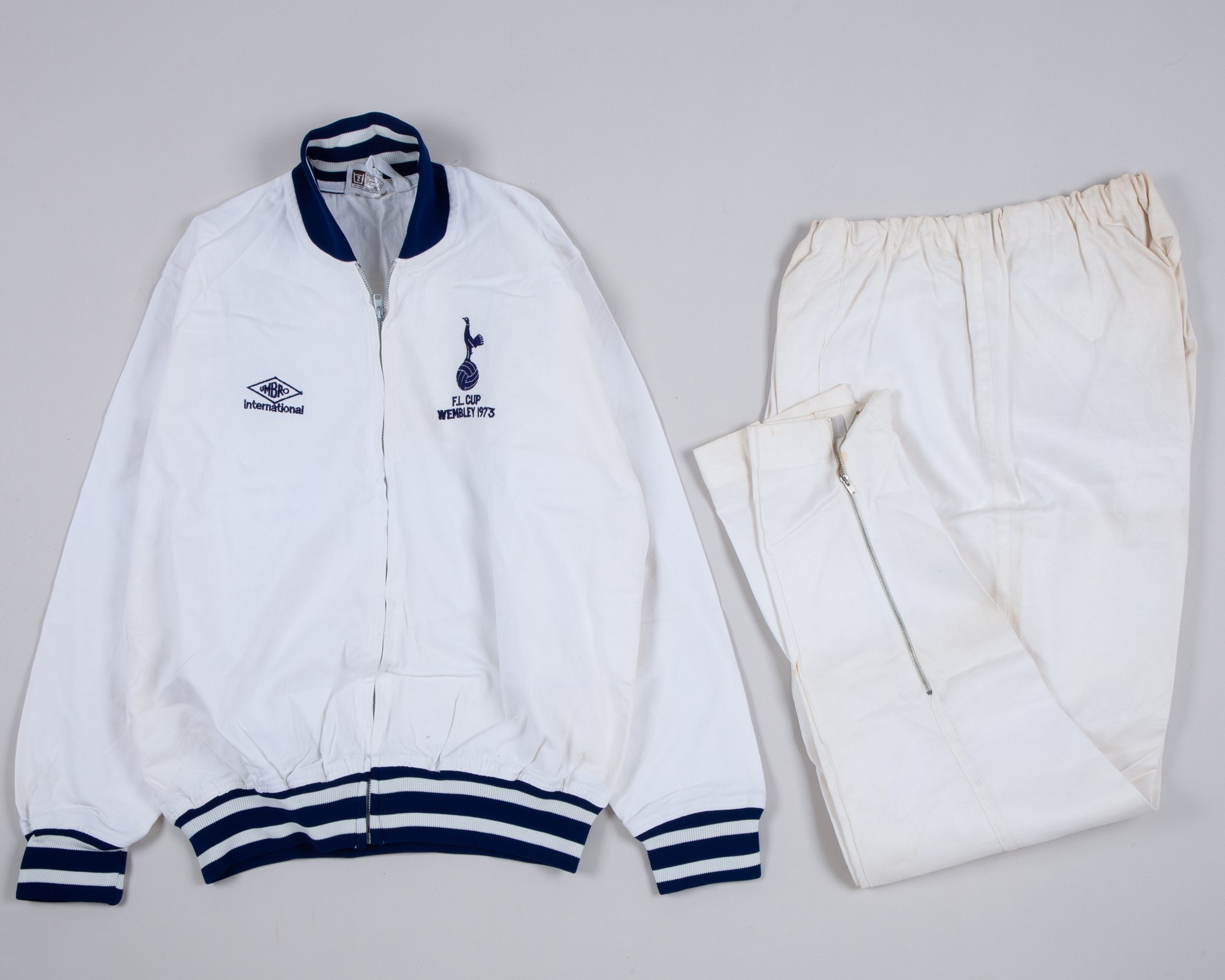 Pat Jennings white and blue Tottenham Hotspur v. Norwich City Football League Cup final tracksuit top and bottoms, 1973, Umbro, L, with zip-up front and embroidered badge inscribed F.L. CUP WEMBLEY 1973, the reverse lettered SPURS, areas of staining top and bottoms, with Pat Jennings Collection autographed COA