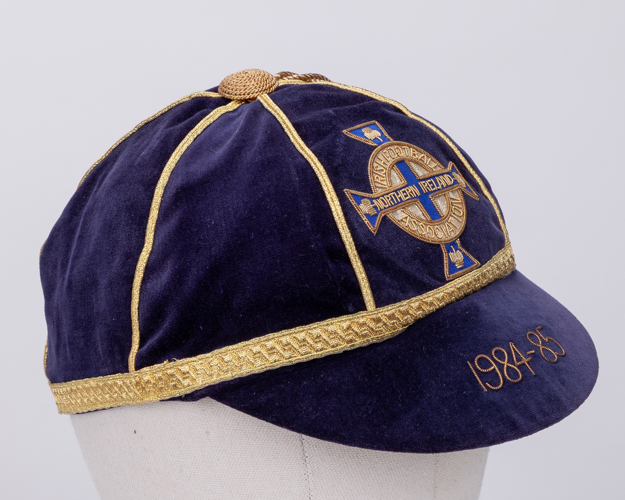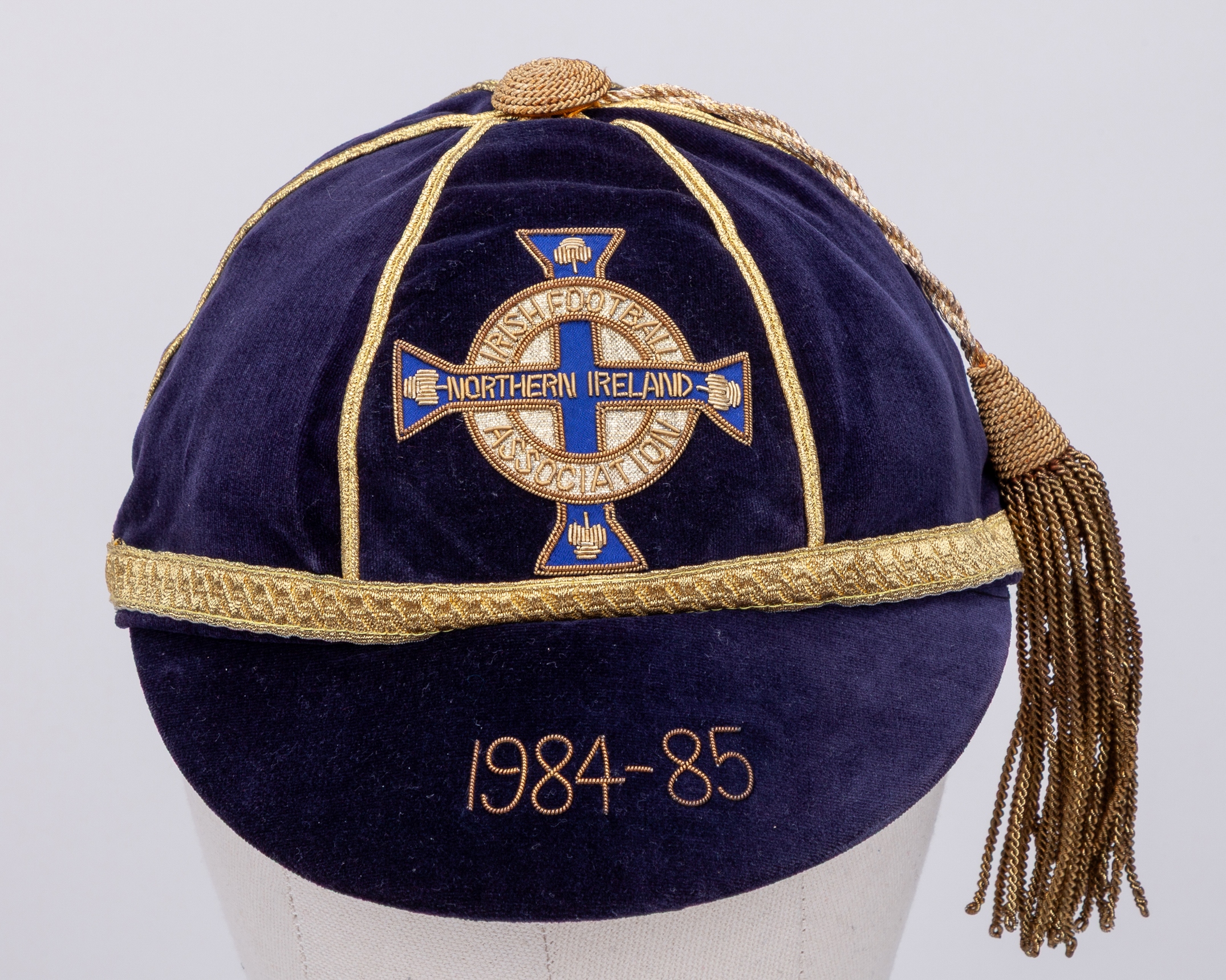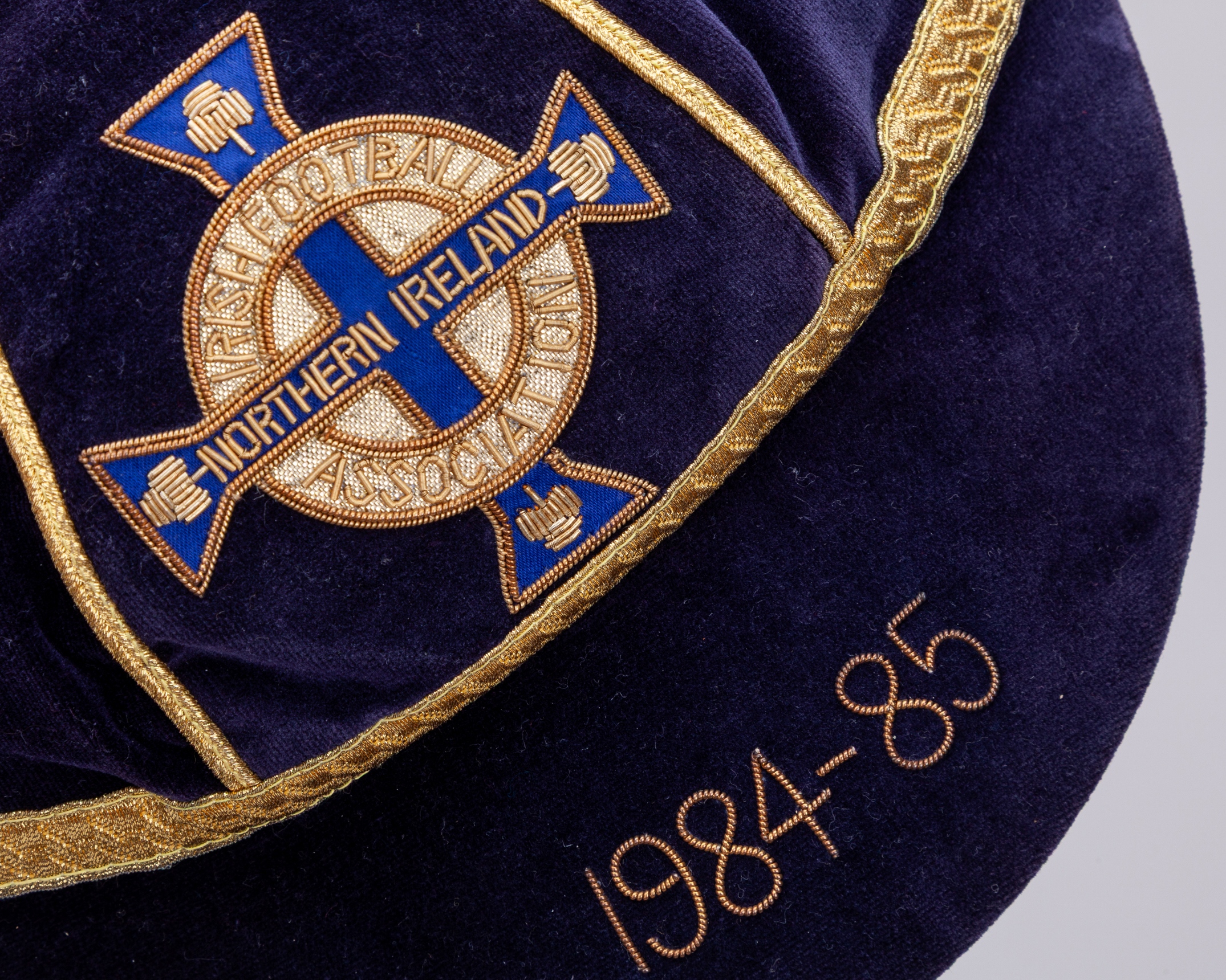 The above cap represents Pat's 106th, 107th, 108th, 109th and 110th International appearances. In the World Cup qualifying match against Romania played on 12th September 1984 at Windsor Park, Northern Ireland defeated Romania, in the World Cup qualifying match against Finland played on 14th November 1984 at Windsor Park, Northern Ireland defeated Finland 2-1, in the World Cup qualifying match against England played on 27th February 1985 at Windsor Park, England defeated Northern Ireland 1-0, in the friendly match against Spain played on 27th March in Majorca, the teams drew the match 0-0 and in the World Cup qualifying match against Turkey played on 1st May 1985 at Windsor Park, Northern Ireland defeated Turkey 2-0