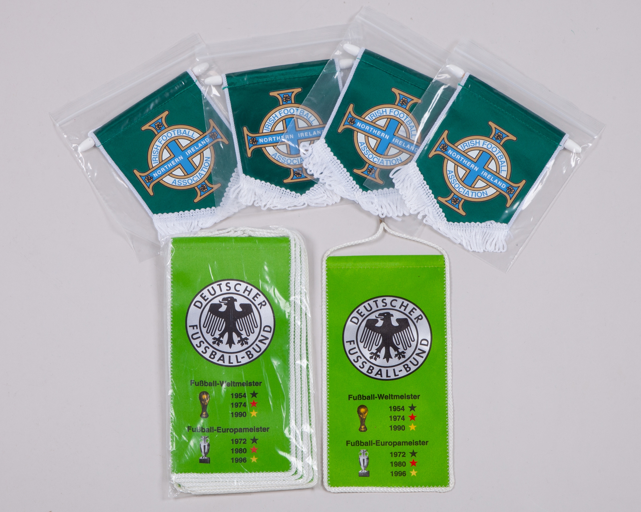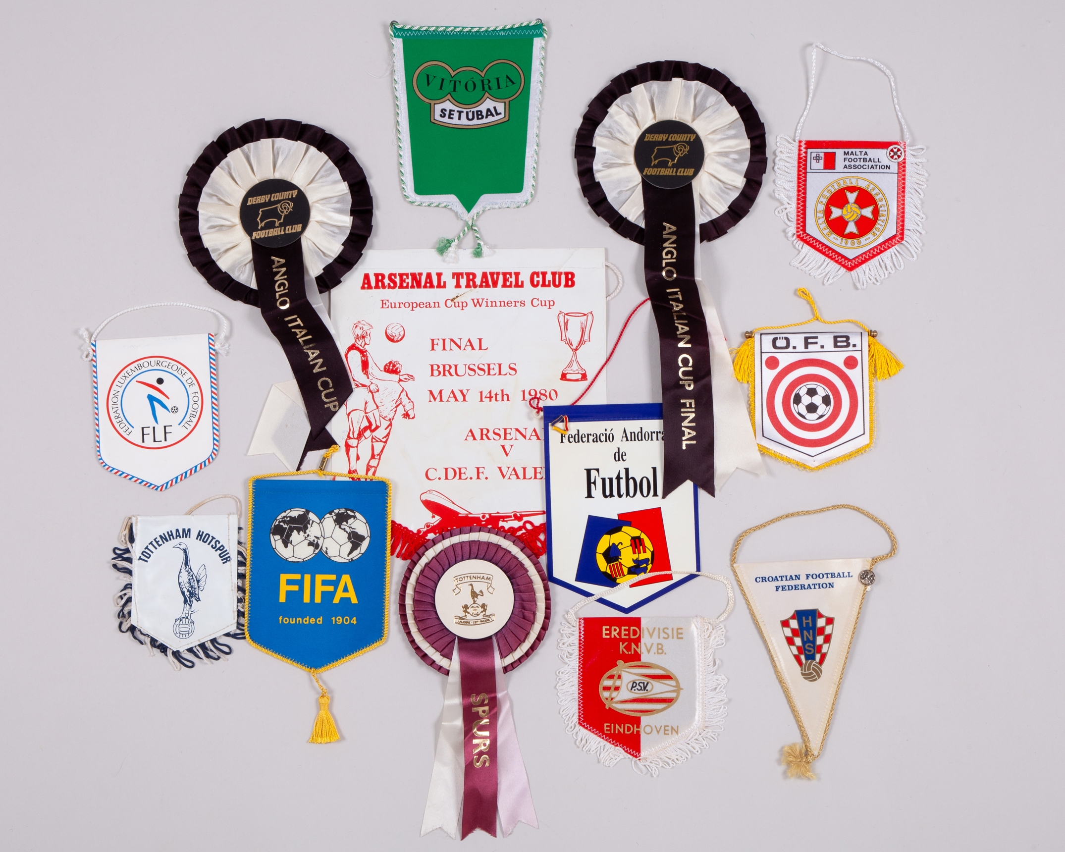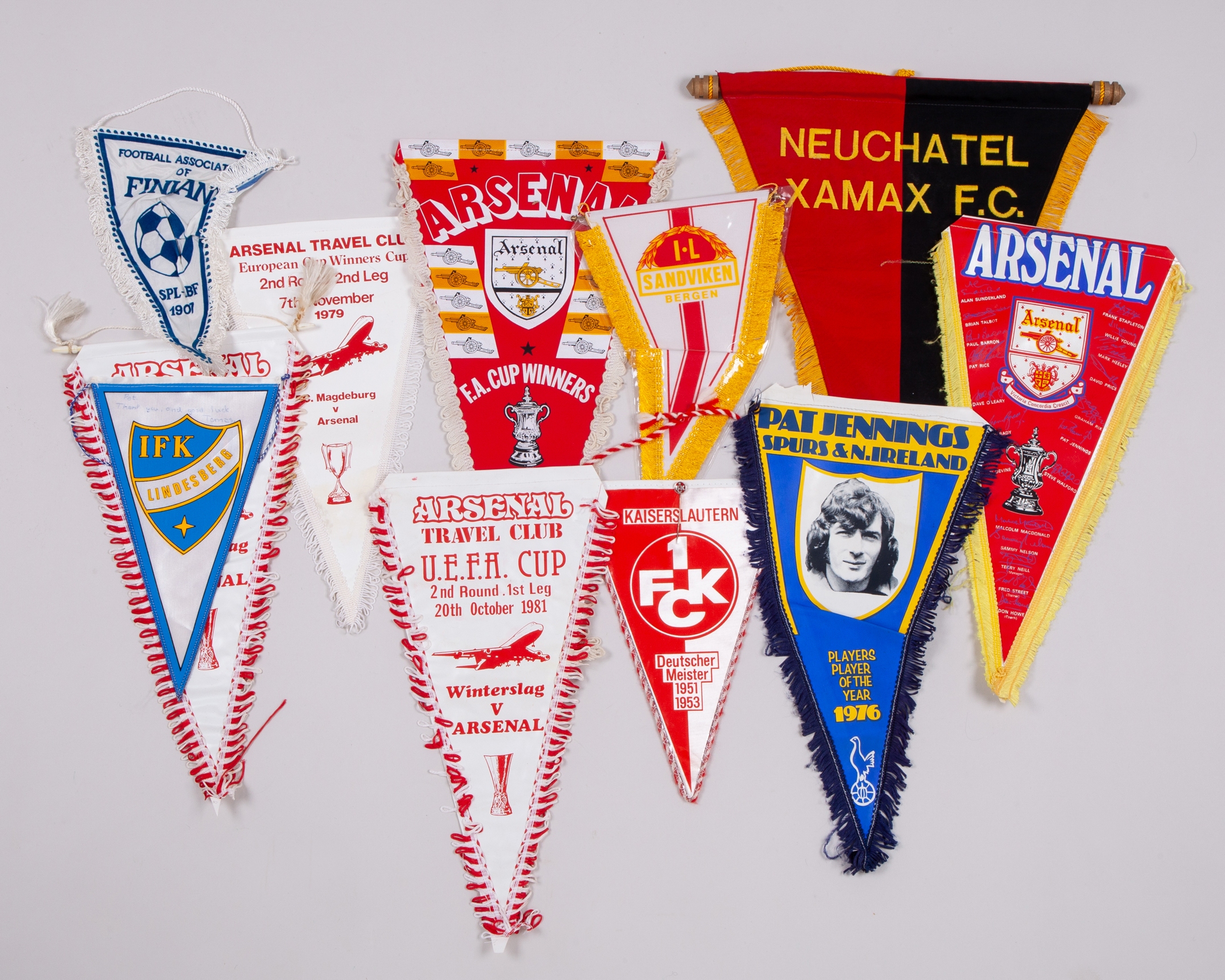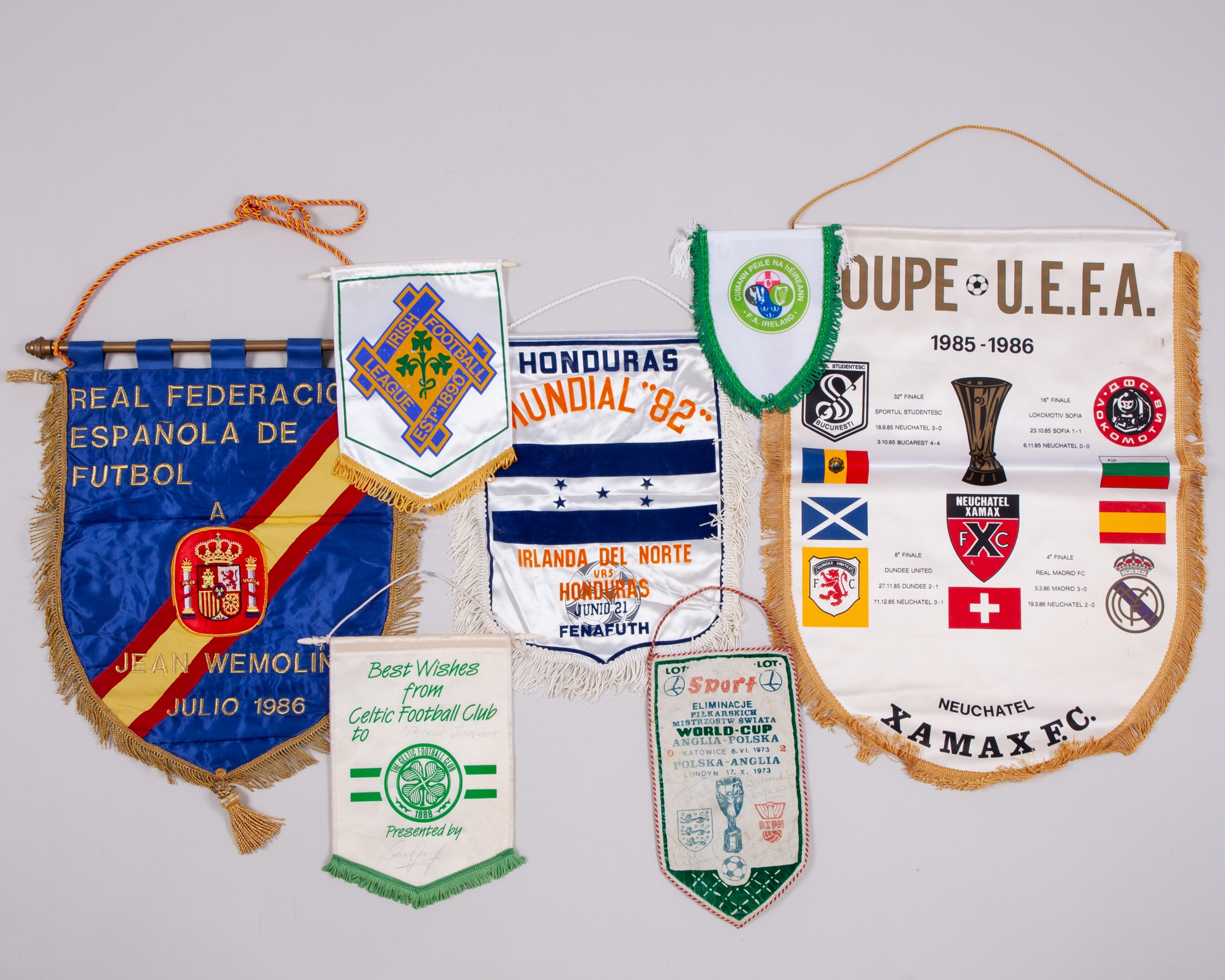 A nice collection of embroidered and commemorative pennants, including Royal Spanish Federation example, Honduras v. Northern Ireland 1982 World Cup pennant, Neuchatel Xamax pennant etc, with Pat Jennings Collection autographed COA, (a lot)