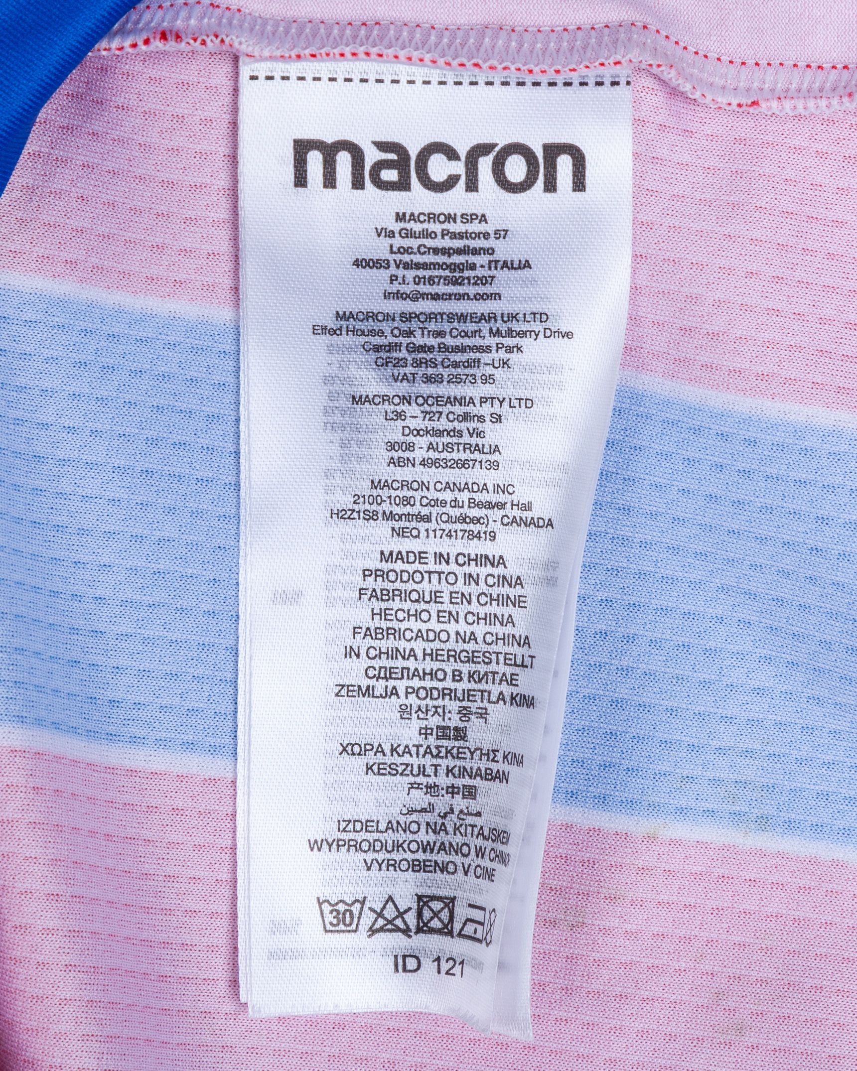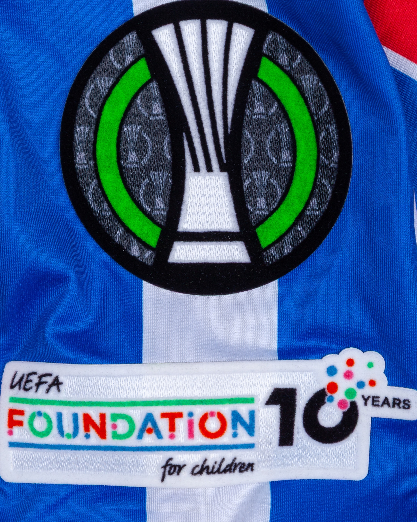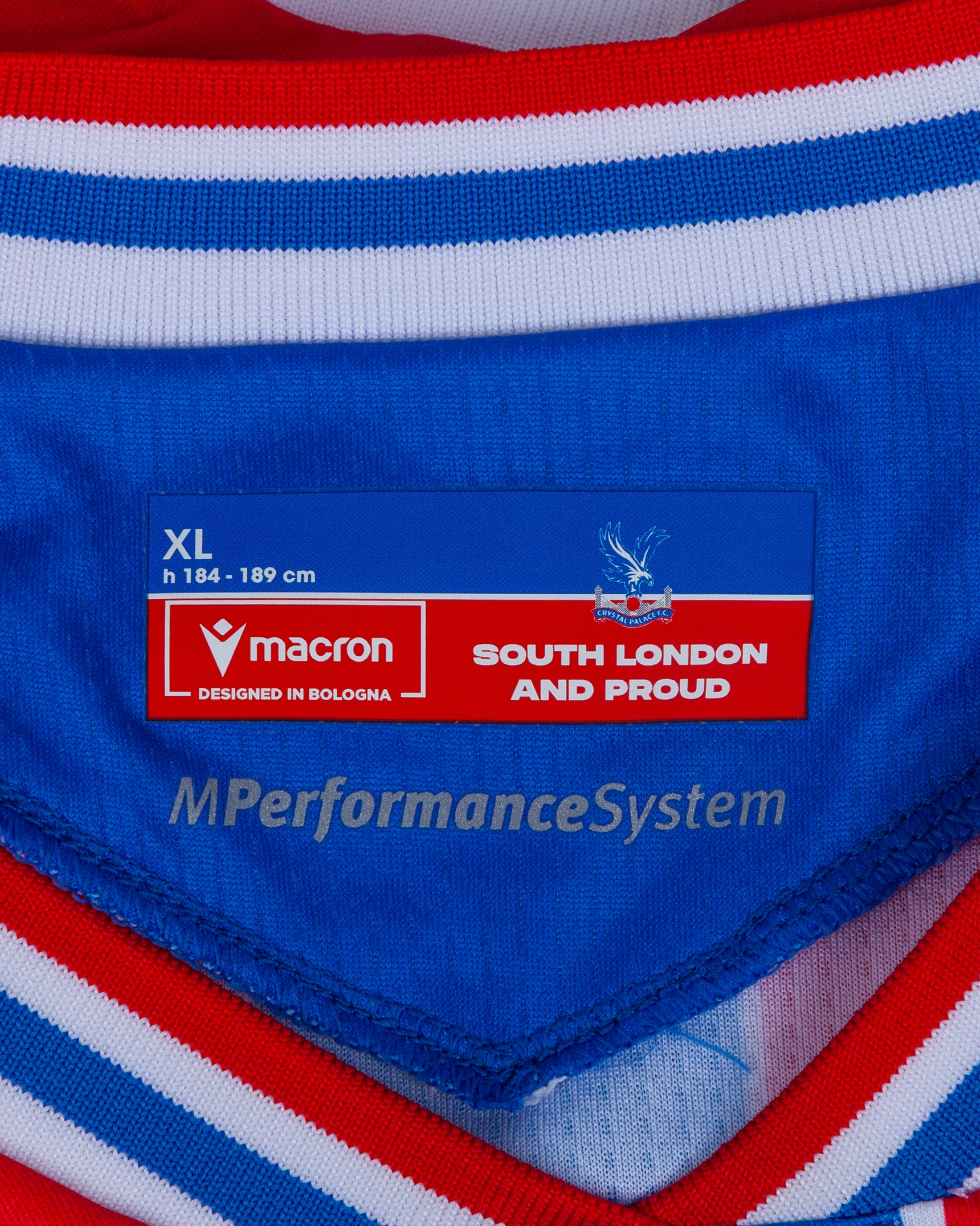 Marc Guéhi red and blue No.6 Crystal Palace v. AEK Larnaca match worn short-sleeved shirt, UEFA Conference League 2025, Macron, with crew-neck collar and printed badge, the reverse lettered GUÉHI, the right sleeve with UEFA flash
