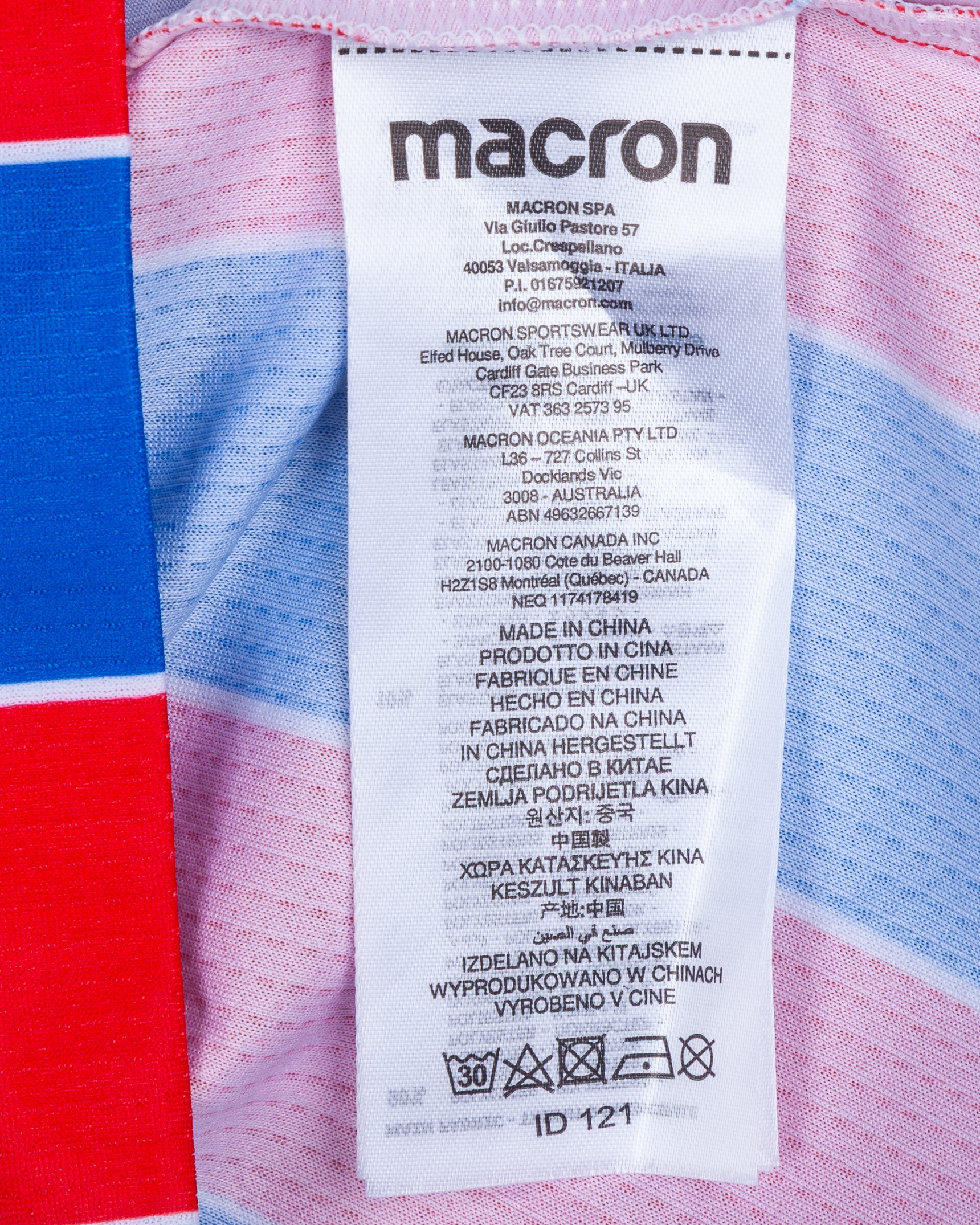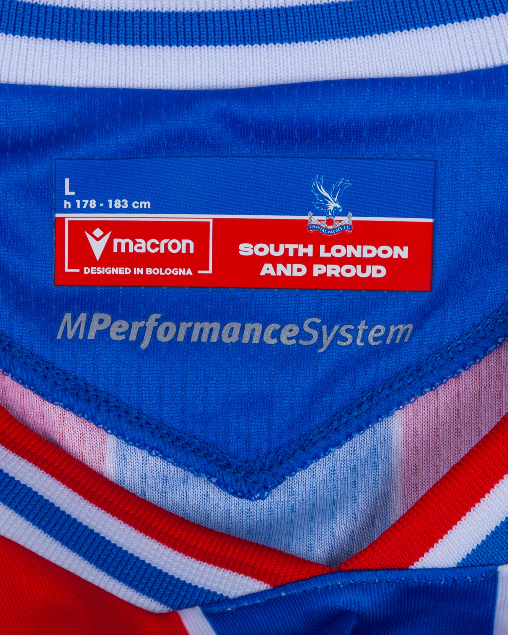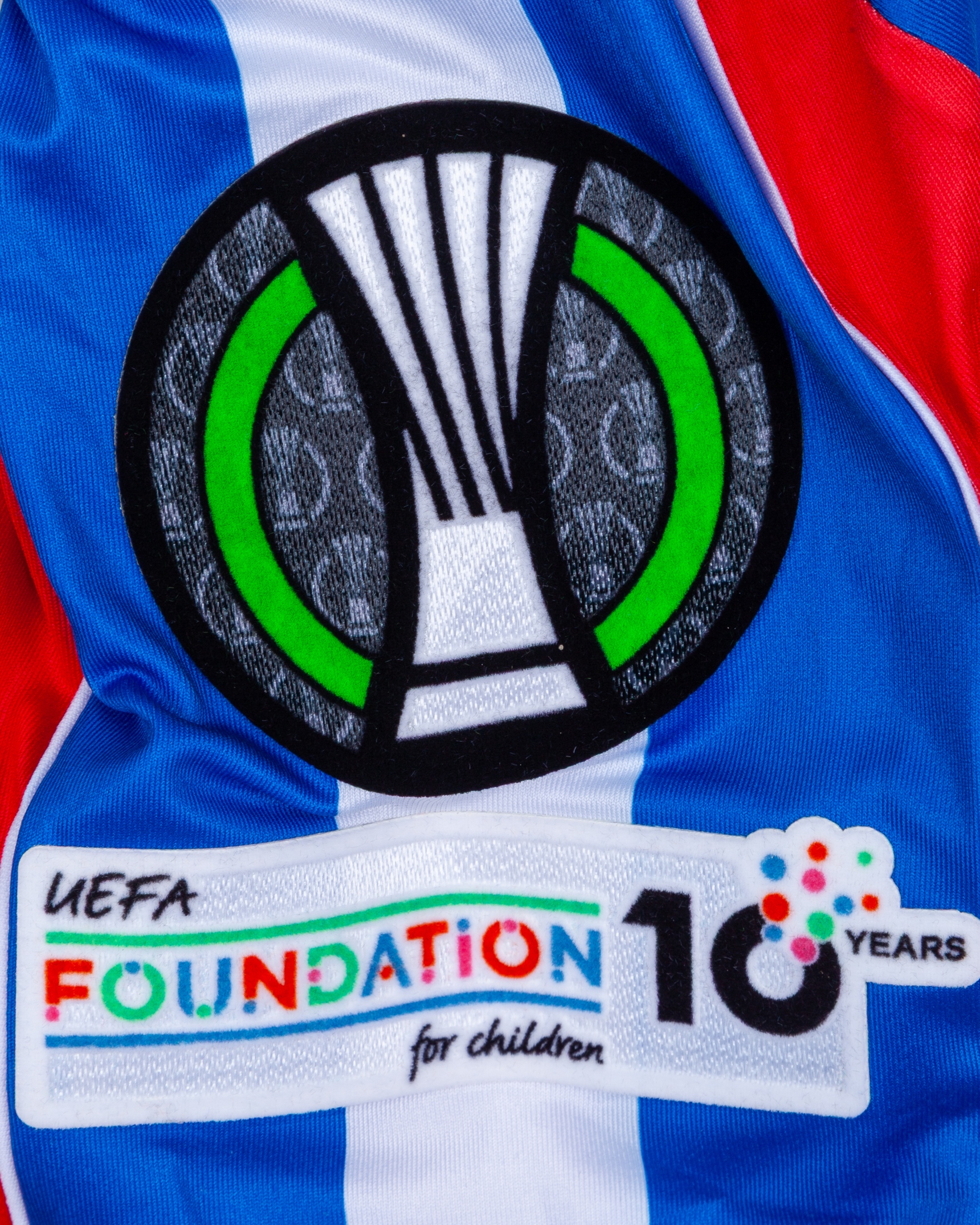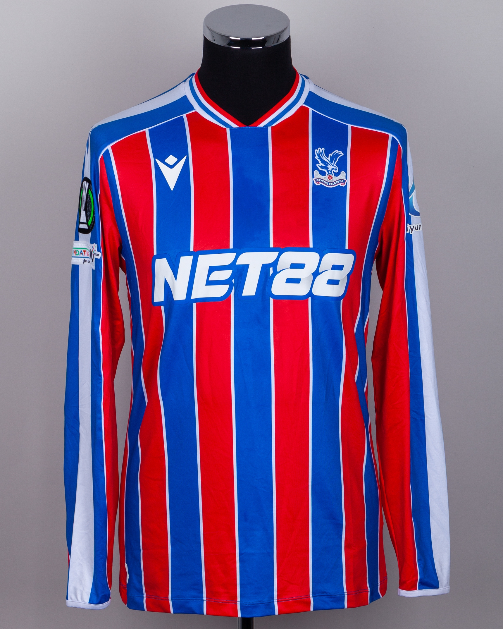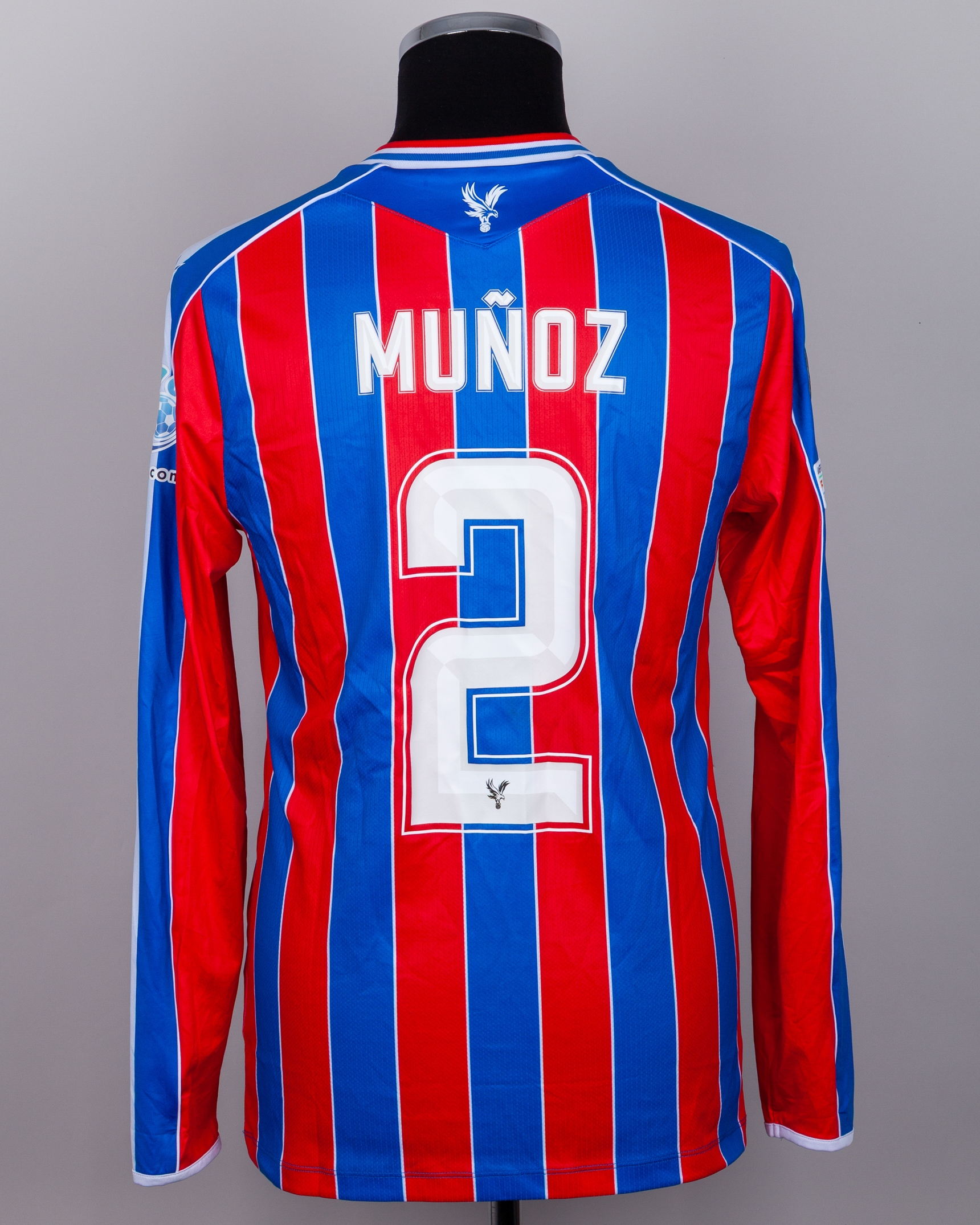 Daniel Muñoz red and blue No.2 Crystal Palace v. AEK Larnaca match worn long-sleeved shirt, UEFA Conference League 2025, Macron, with crew-neck collar and printed badge, the reverse lettered MUÑOZ, the right sleeve with UEFA flash