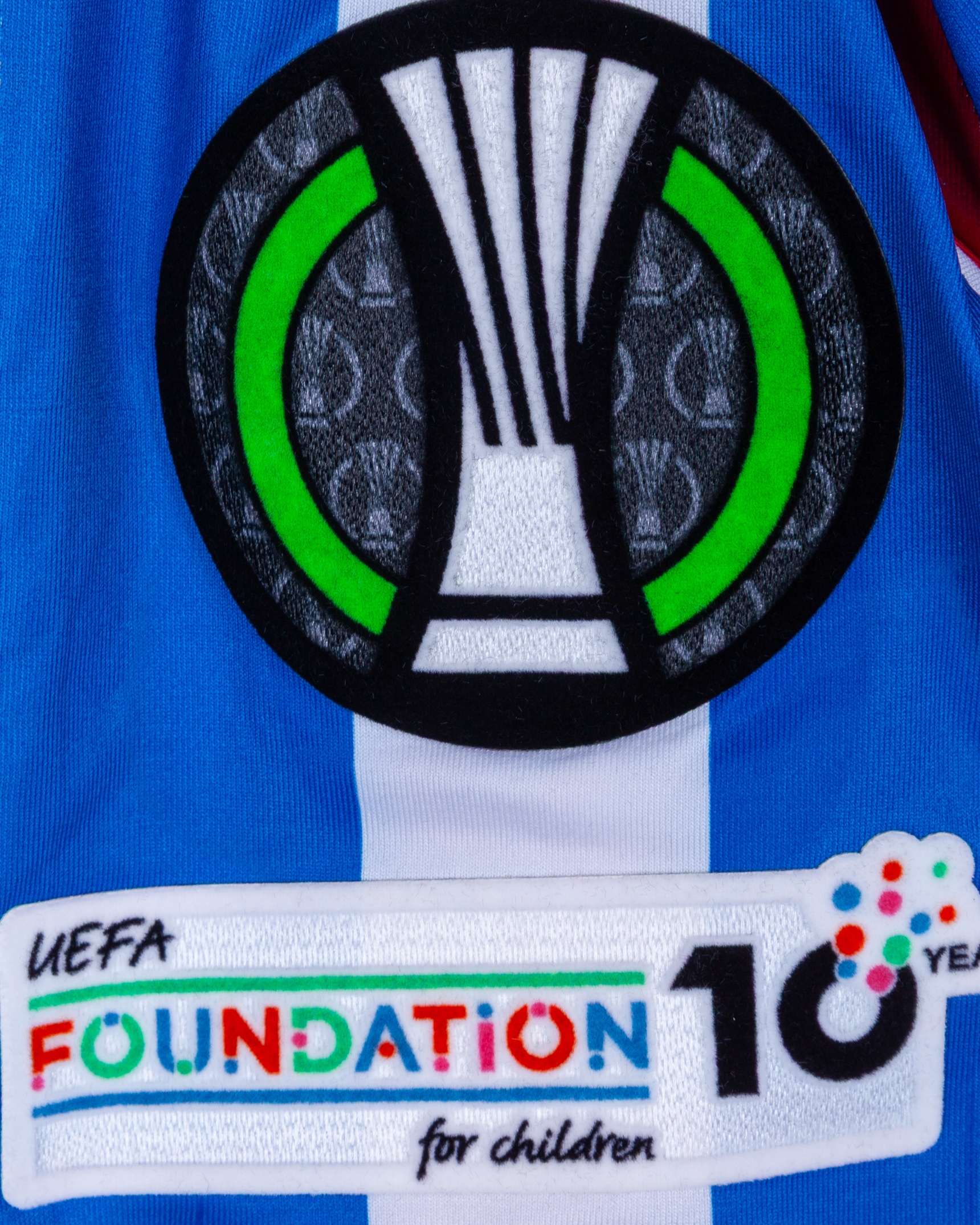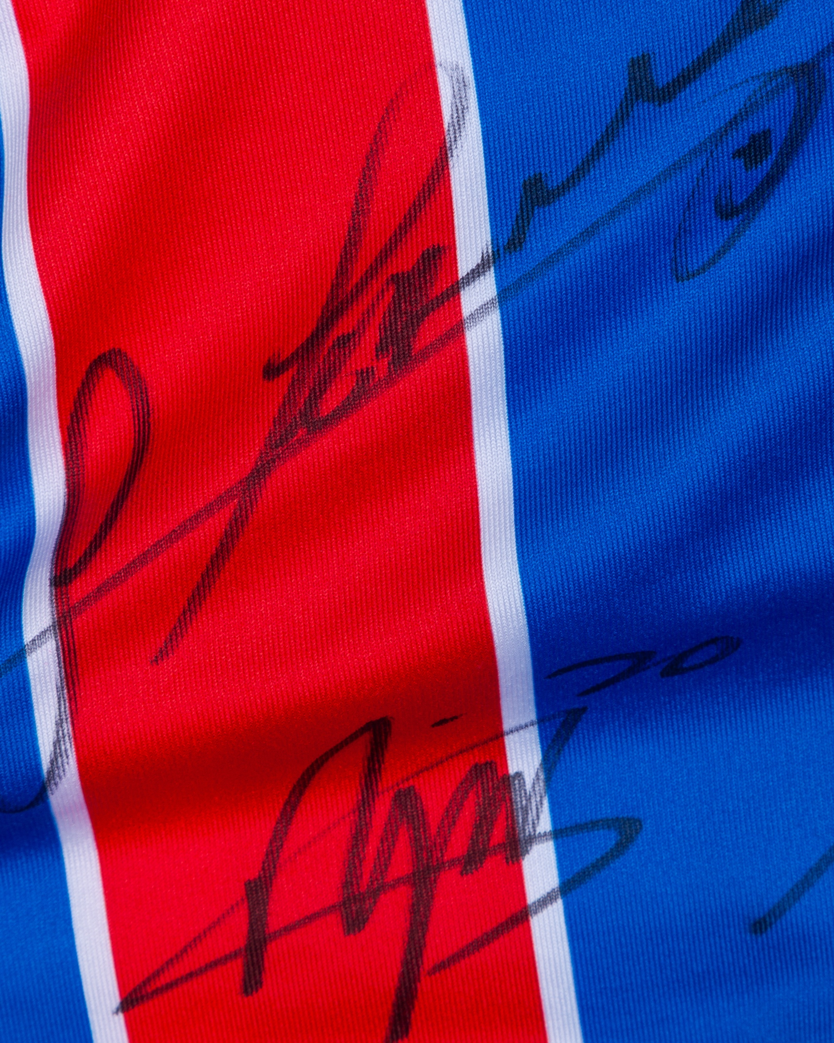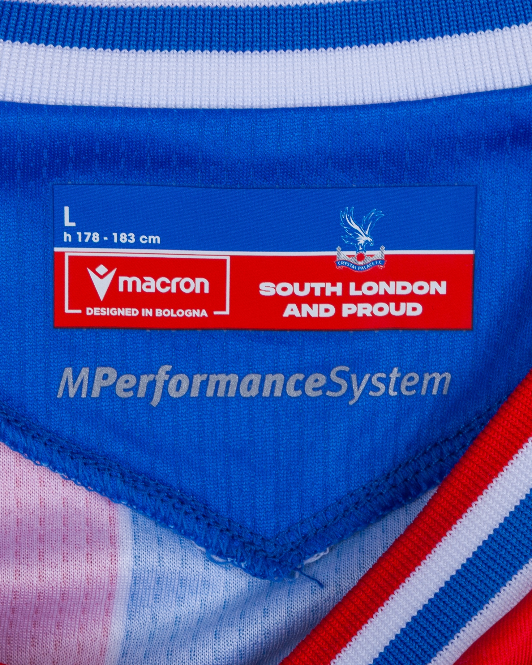 Red and blue Crystal Palace v. AEK Larnaca match issued squad signed shirt, UEFA Conference League 2025, Macron, with crew-neck collar and printed badge, the right sleeve with UEFA flash