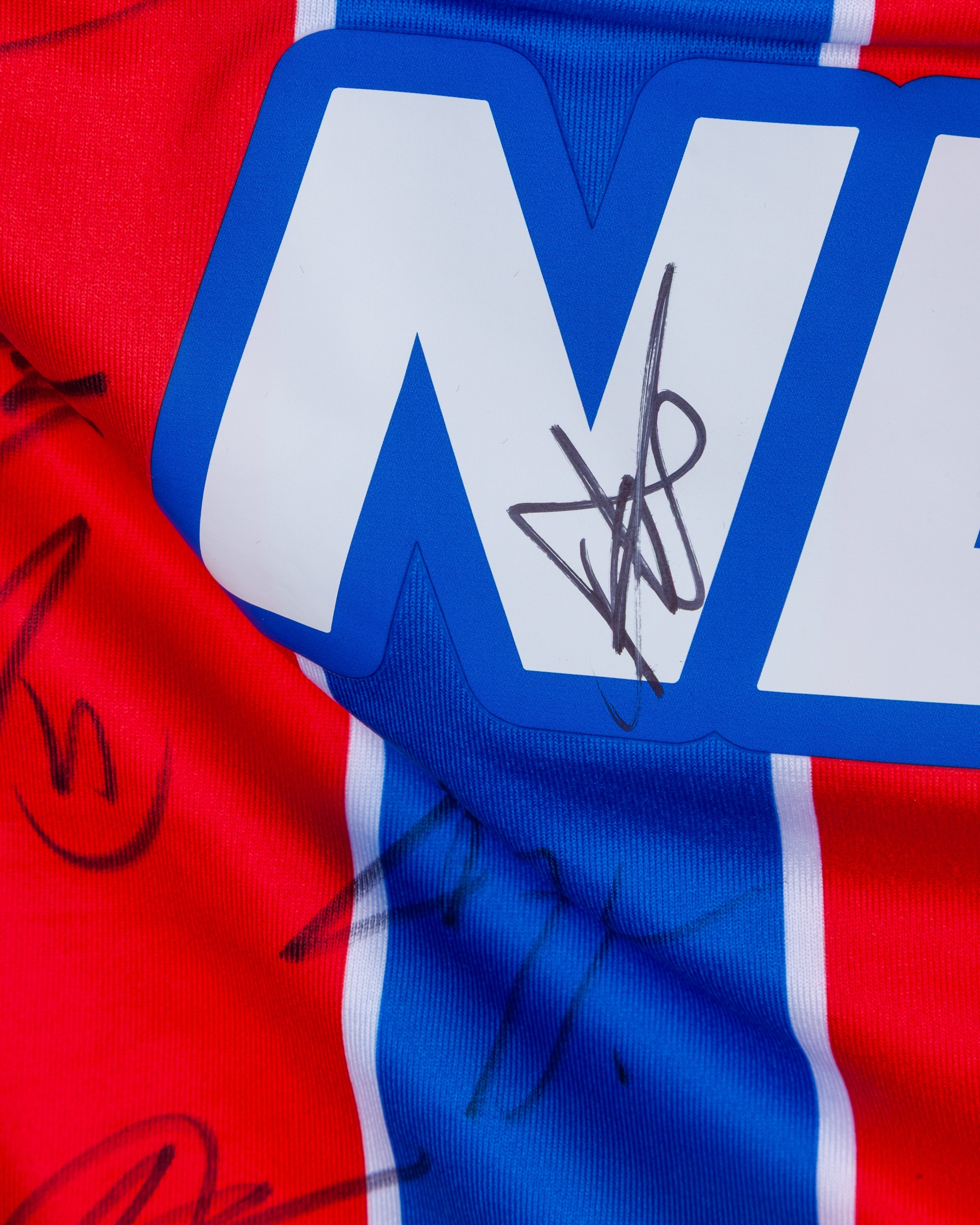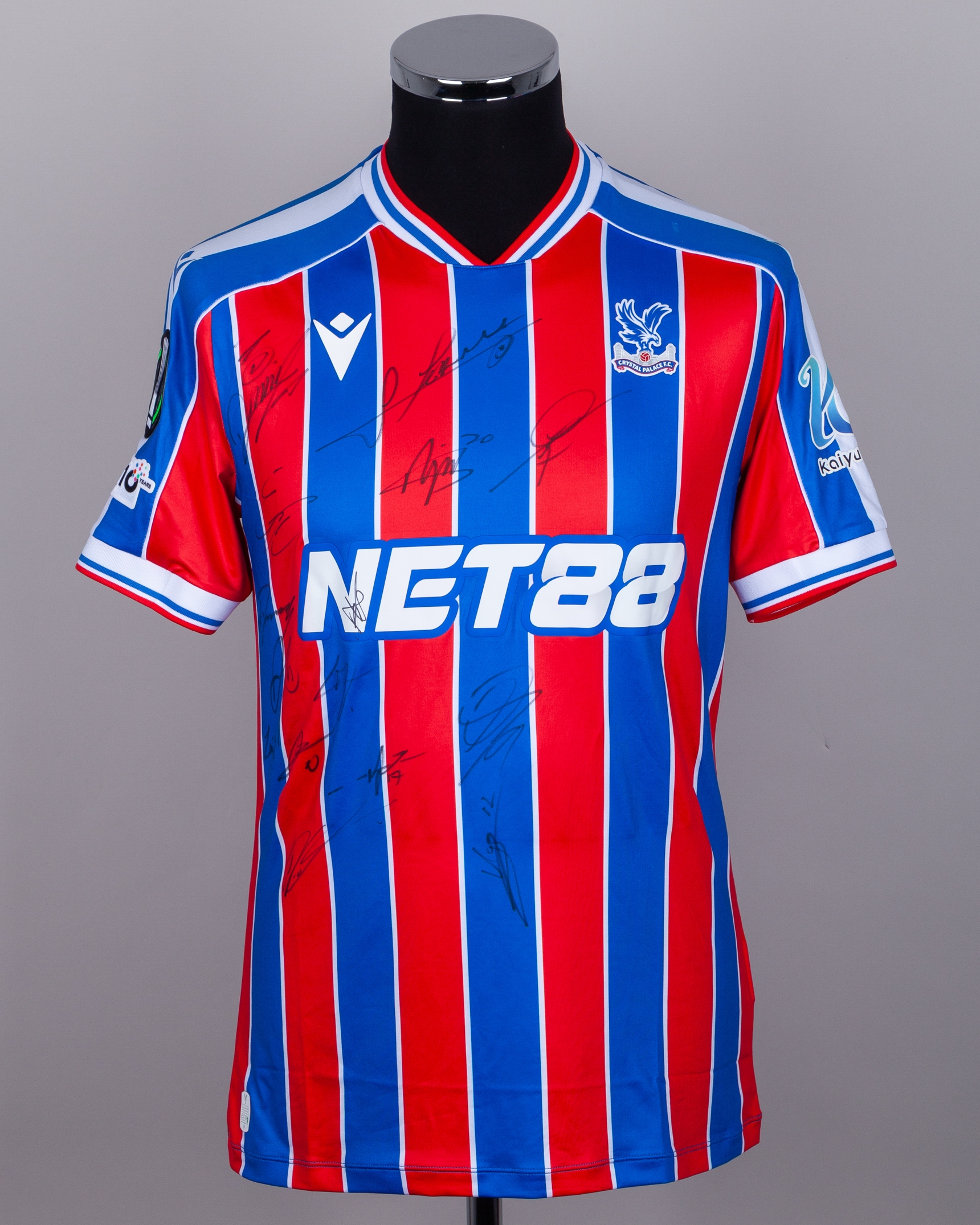 Red and blue Crystal Palace v. AEK Larnaca match issued squad signed shirt