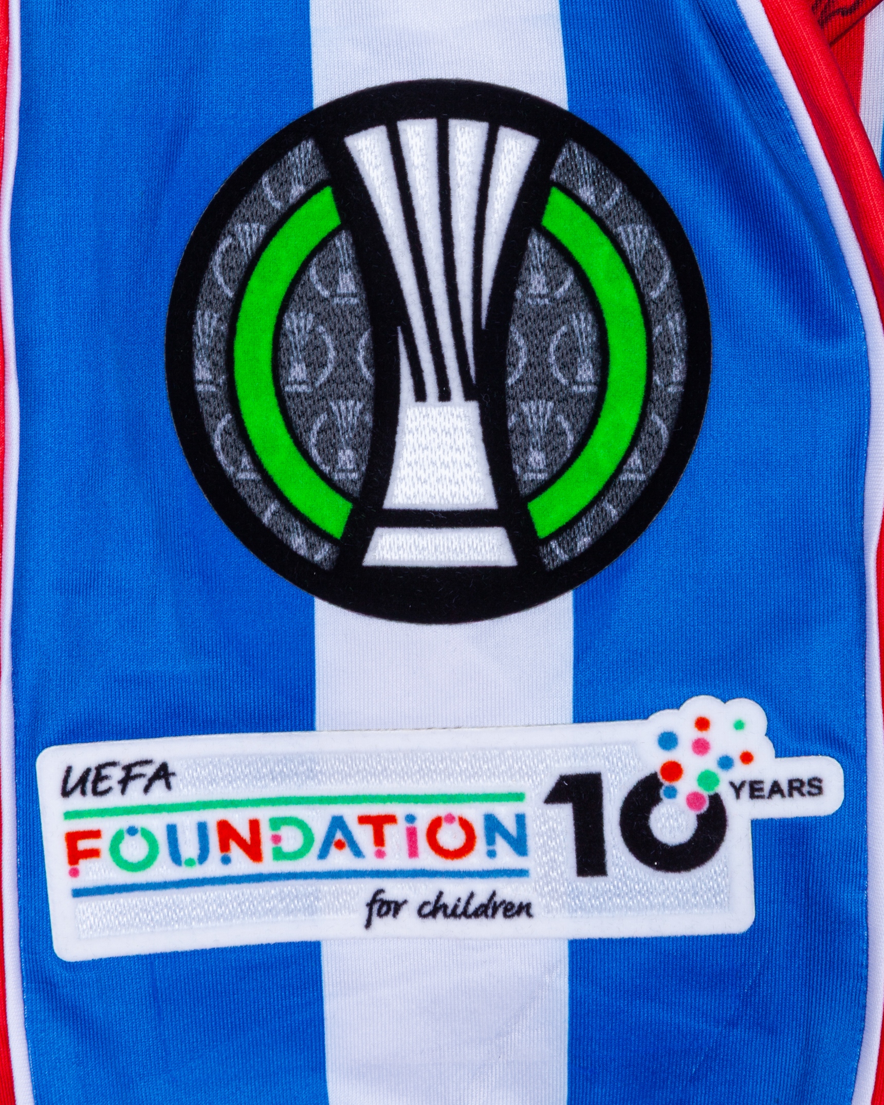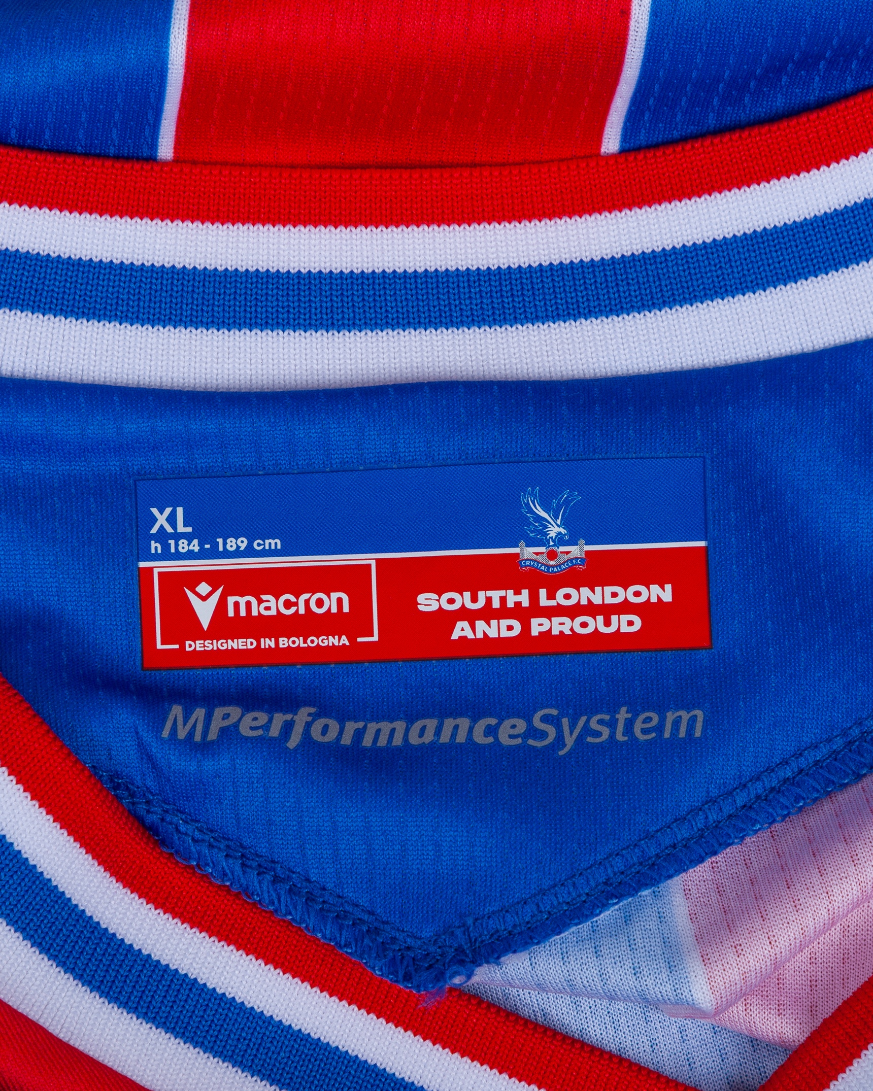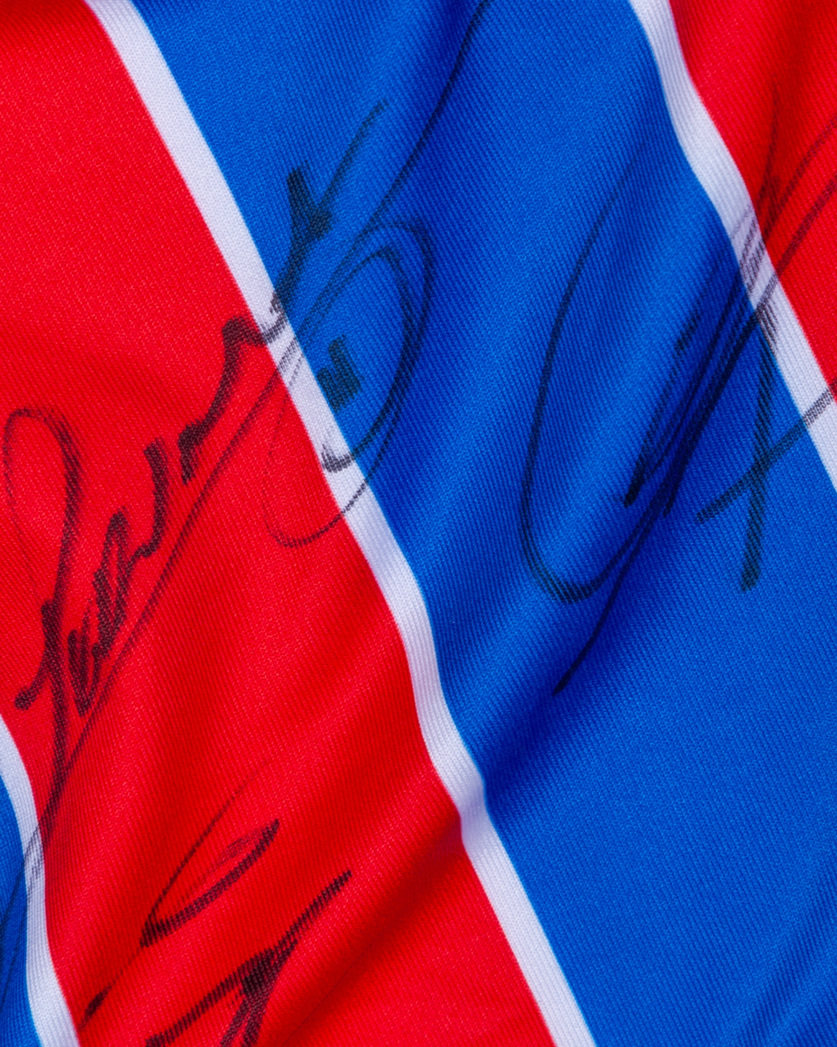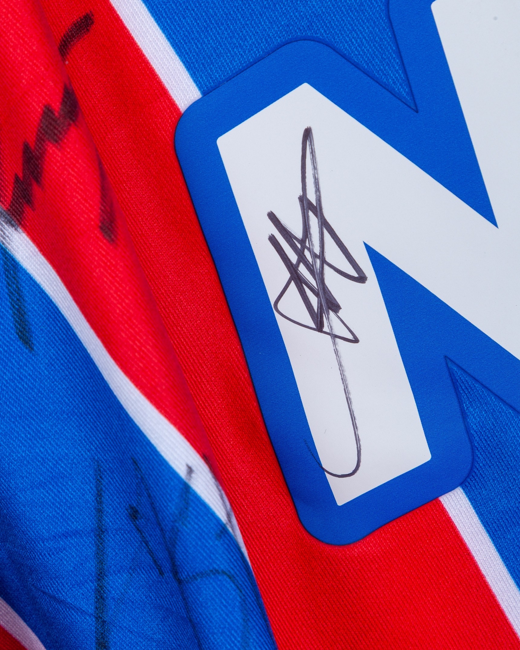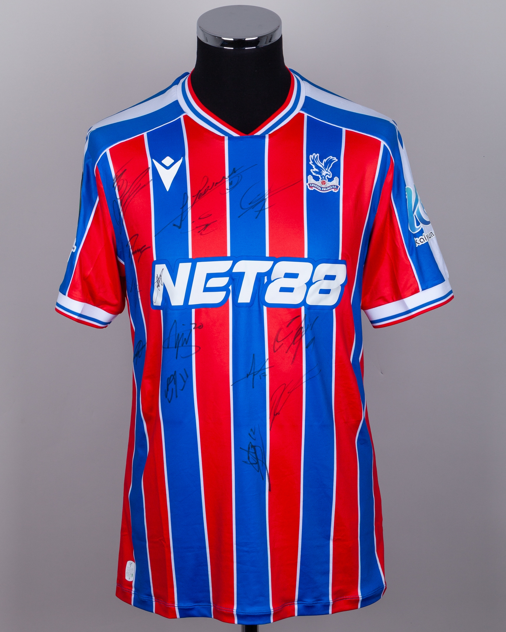 Red and blue Crystal Palace v. AEK Larnaca match issued squad signed shirt, UEFA Conference League 2025, Macron, with crew-neck collar and printed badge, the right sleeve with UEFA flash