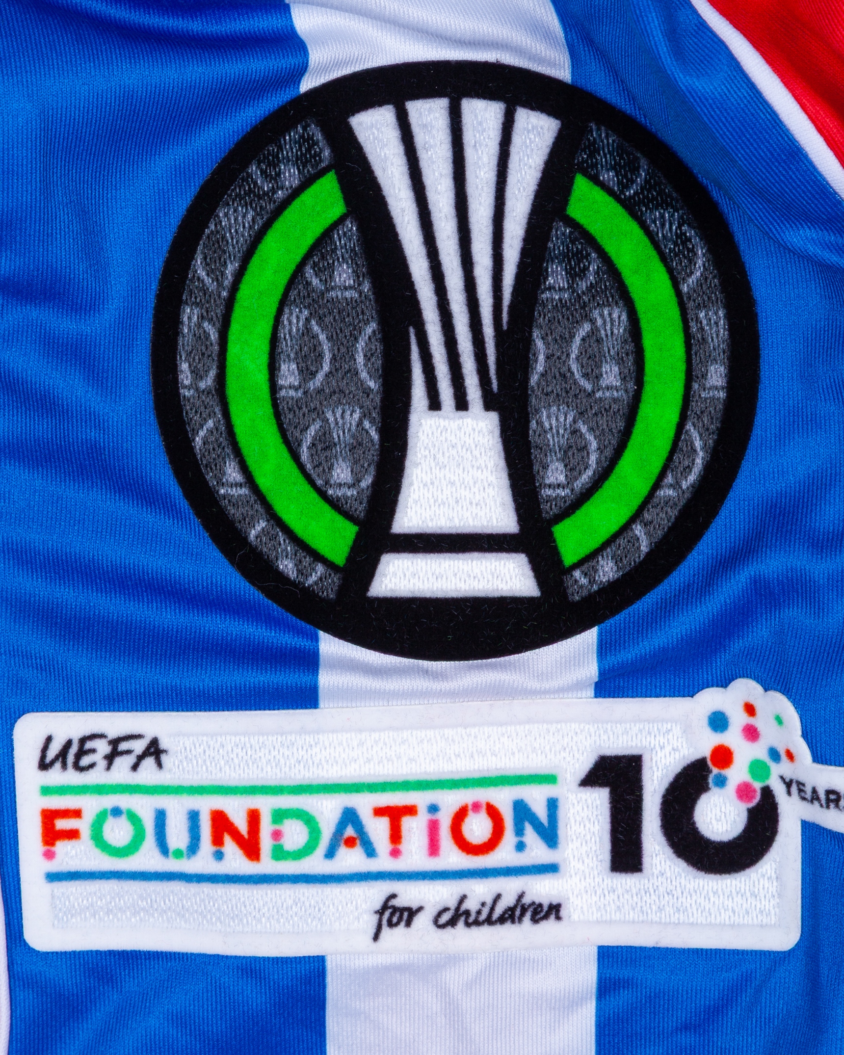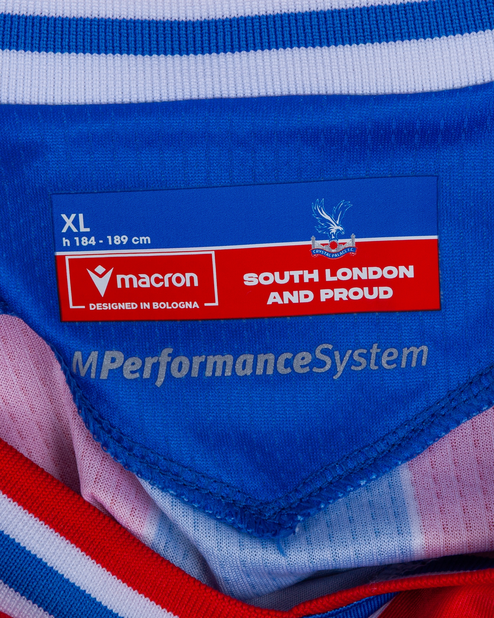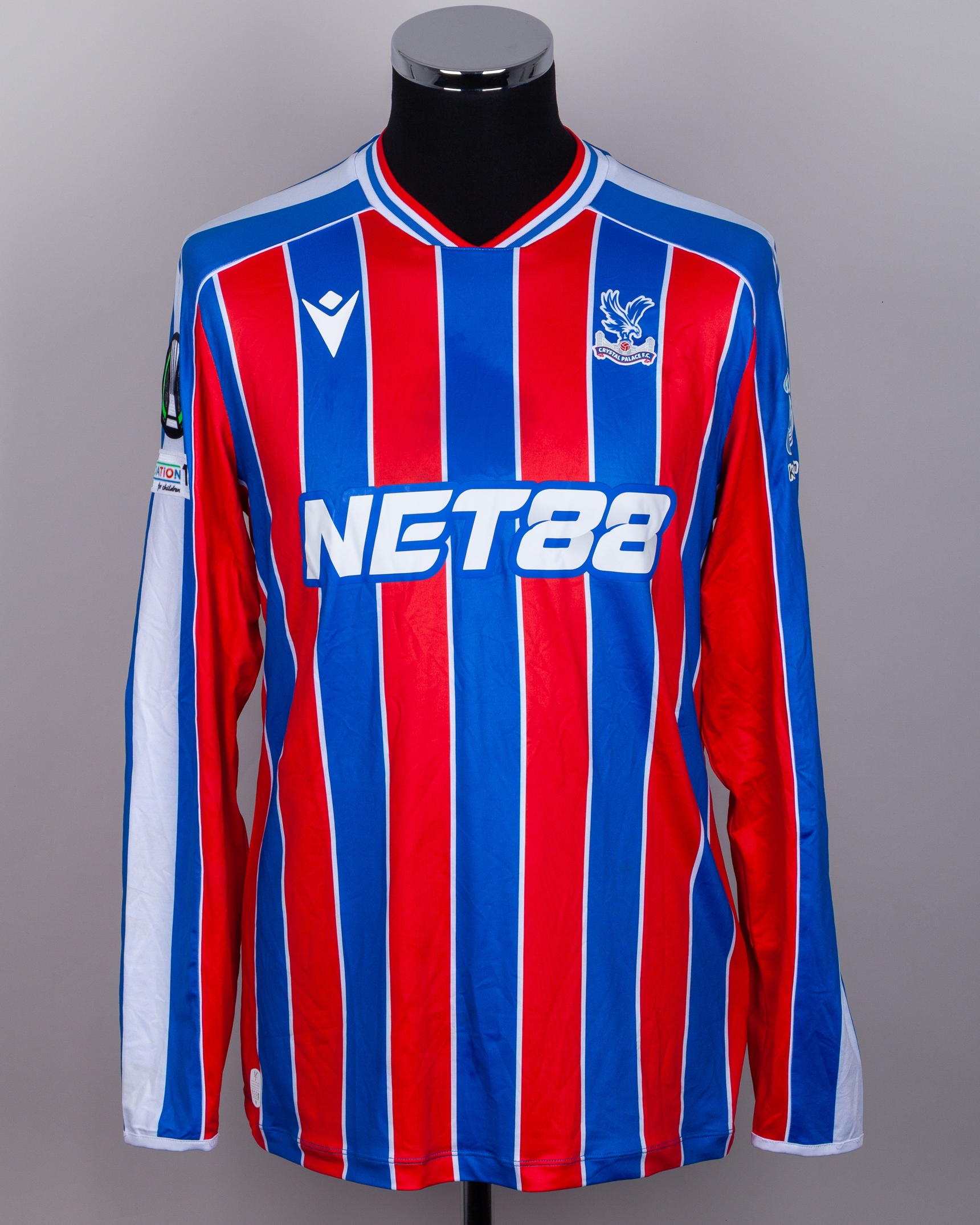 Jefferson Lerma red and blue No.8 Crystal Palace v. AEK Larnaca match worn long-sleeved shirt, UEFA Conference League 2025, Macron, with crew-neck collar and printed badge, the reverse lettered LERMA, the right sleeve with UEFA flash