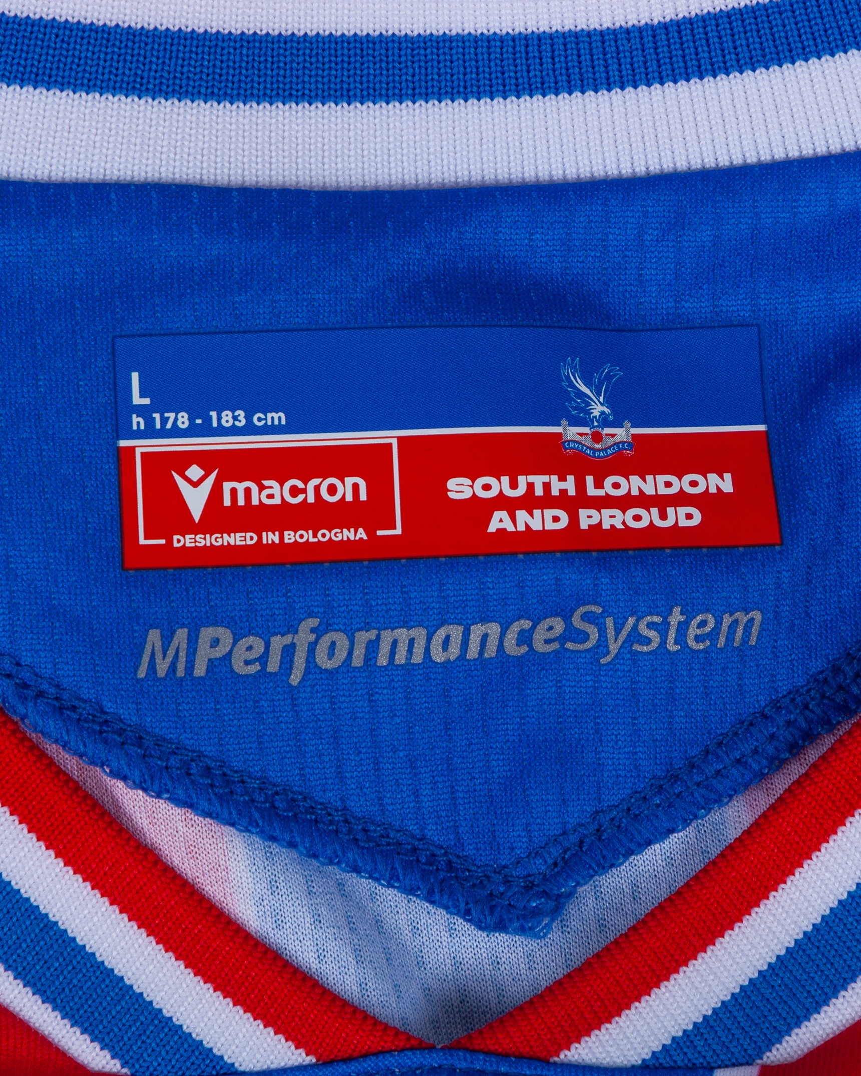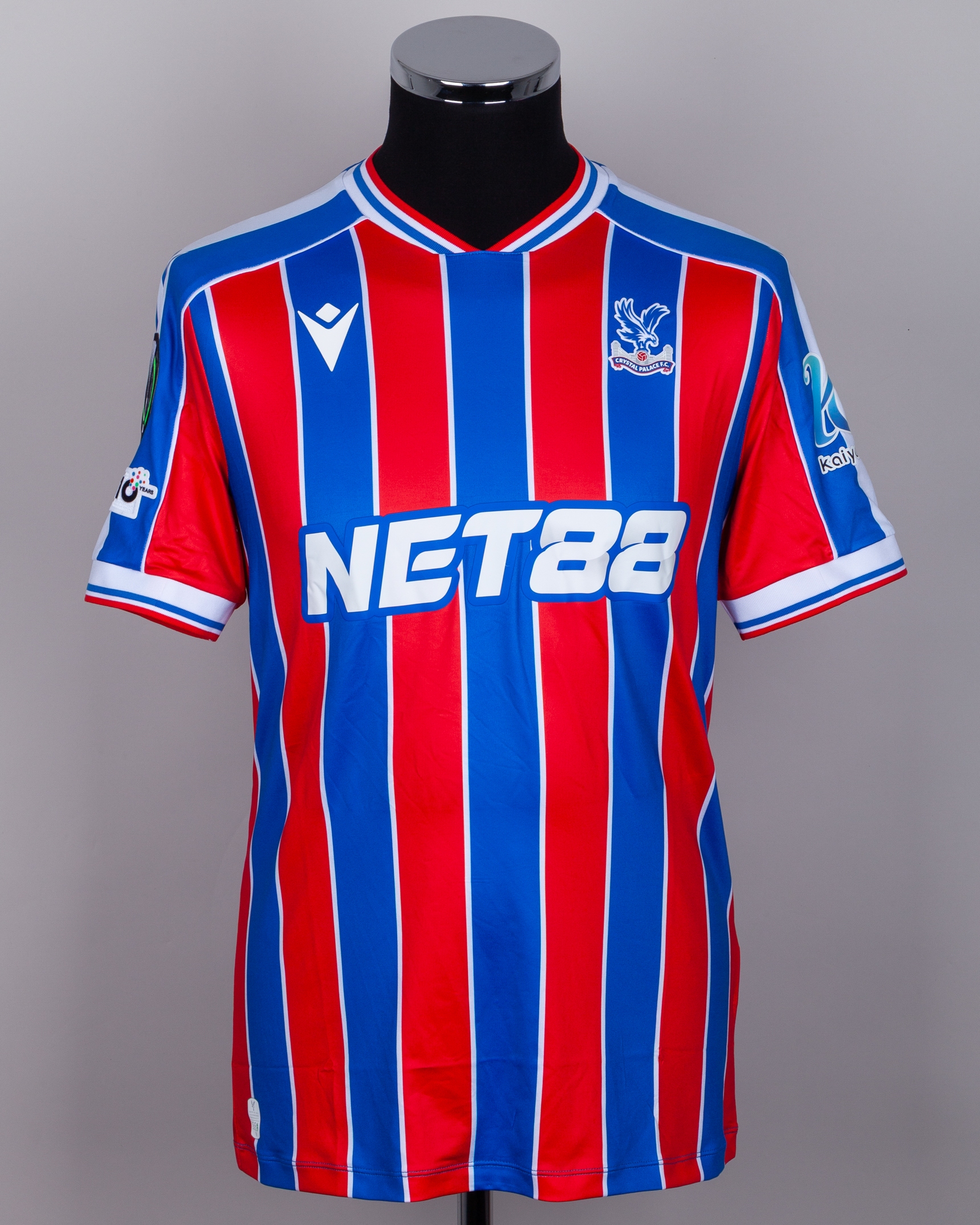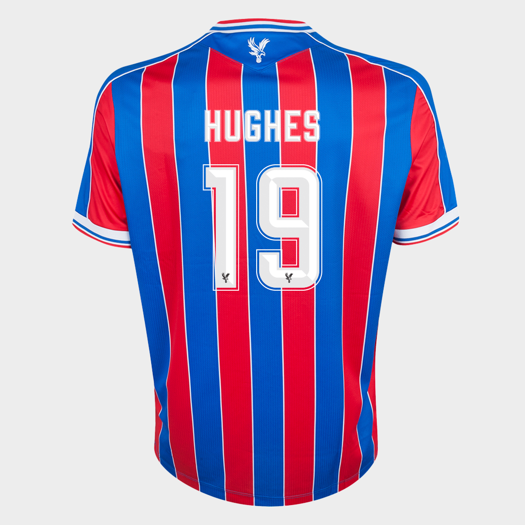 Will Hughes red and blue No.19 Crystal Palace v. AEK Larnaca match worn short-sleeved shirt, UEFA Conference League 2025, Macron, with crew-neck collar and printed badge, the reverse lettered HUGHES, the right sleeve with UEFA flash