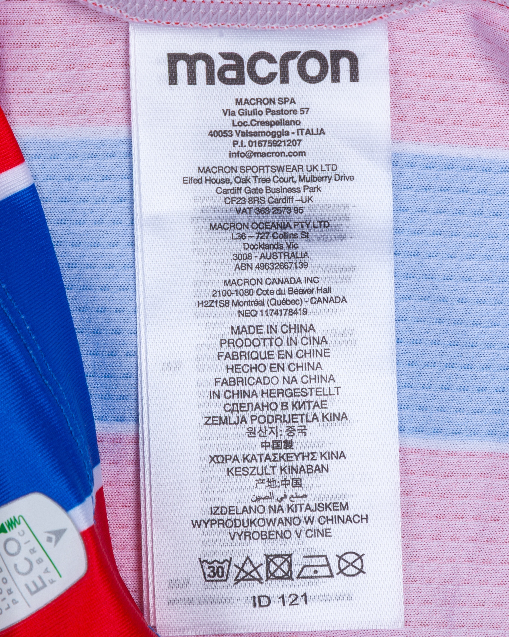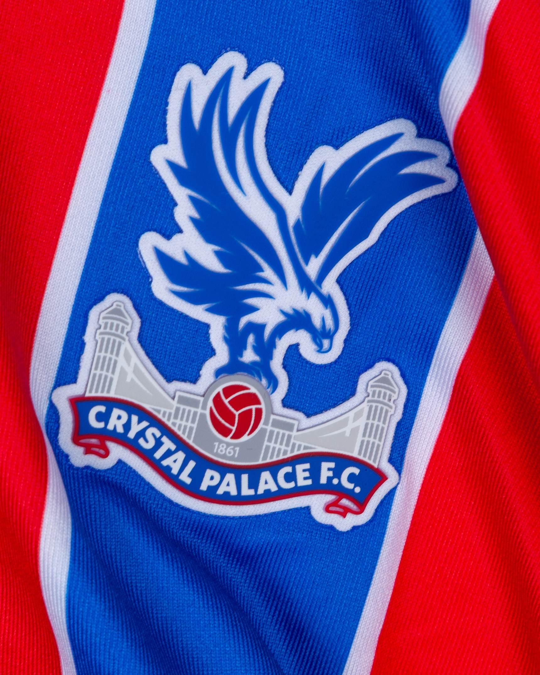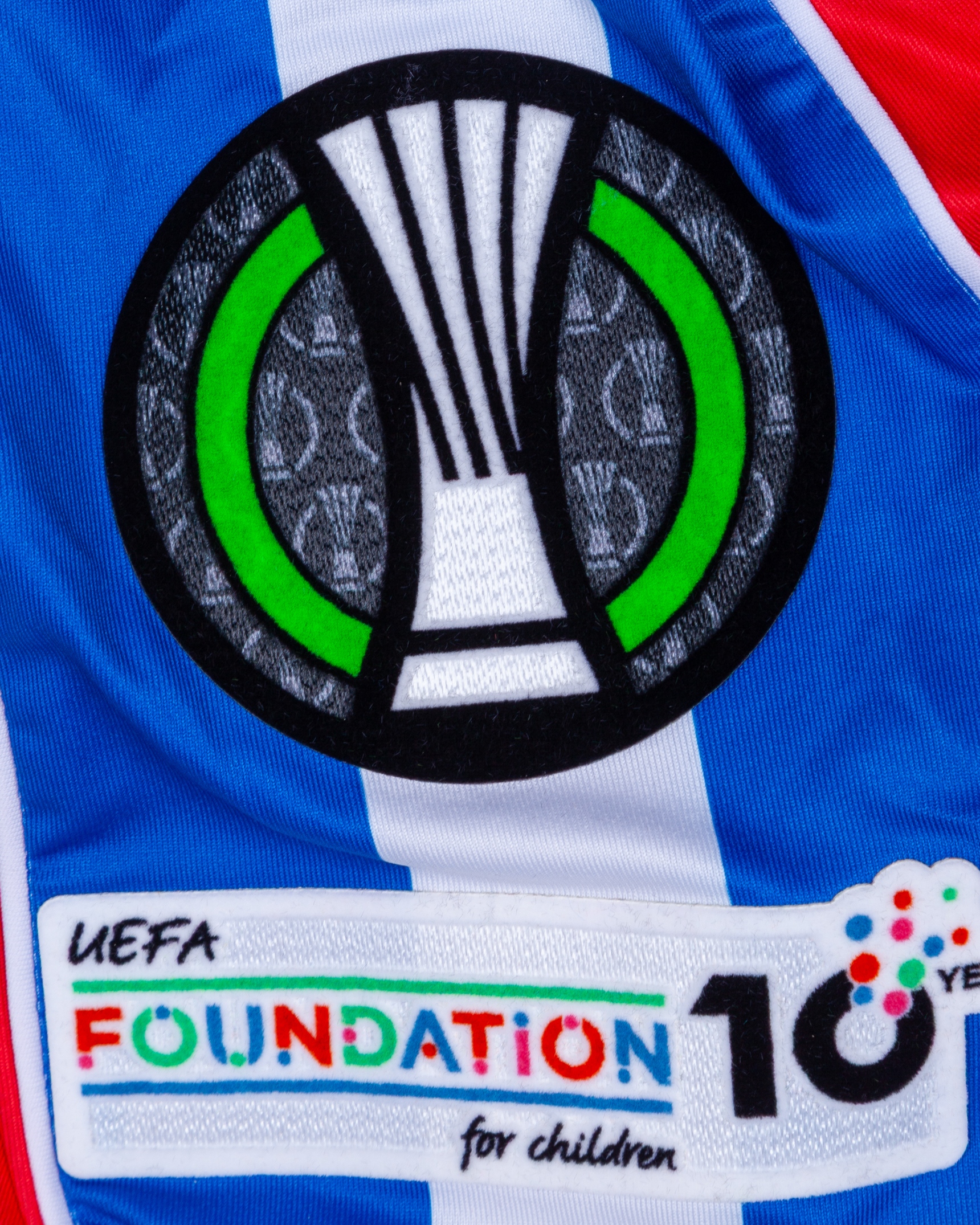 Will Hughes red and blue No.19 Crystal Palace v. AEK Larnaca match worn short-sleeved shirt, UEFA Conference League 2025, Macron, with crew-neck collar and printed badge, the reverse lettered HUGHES, the right sleeve with UEFA flash