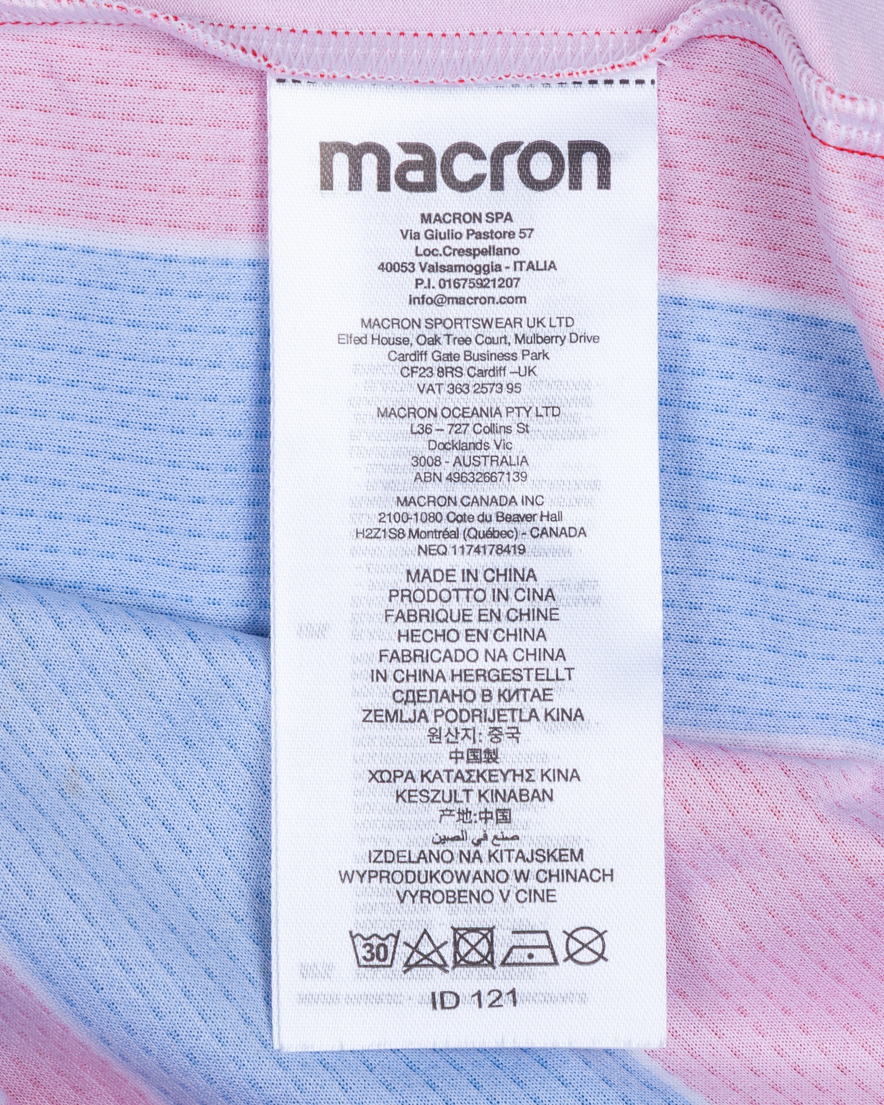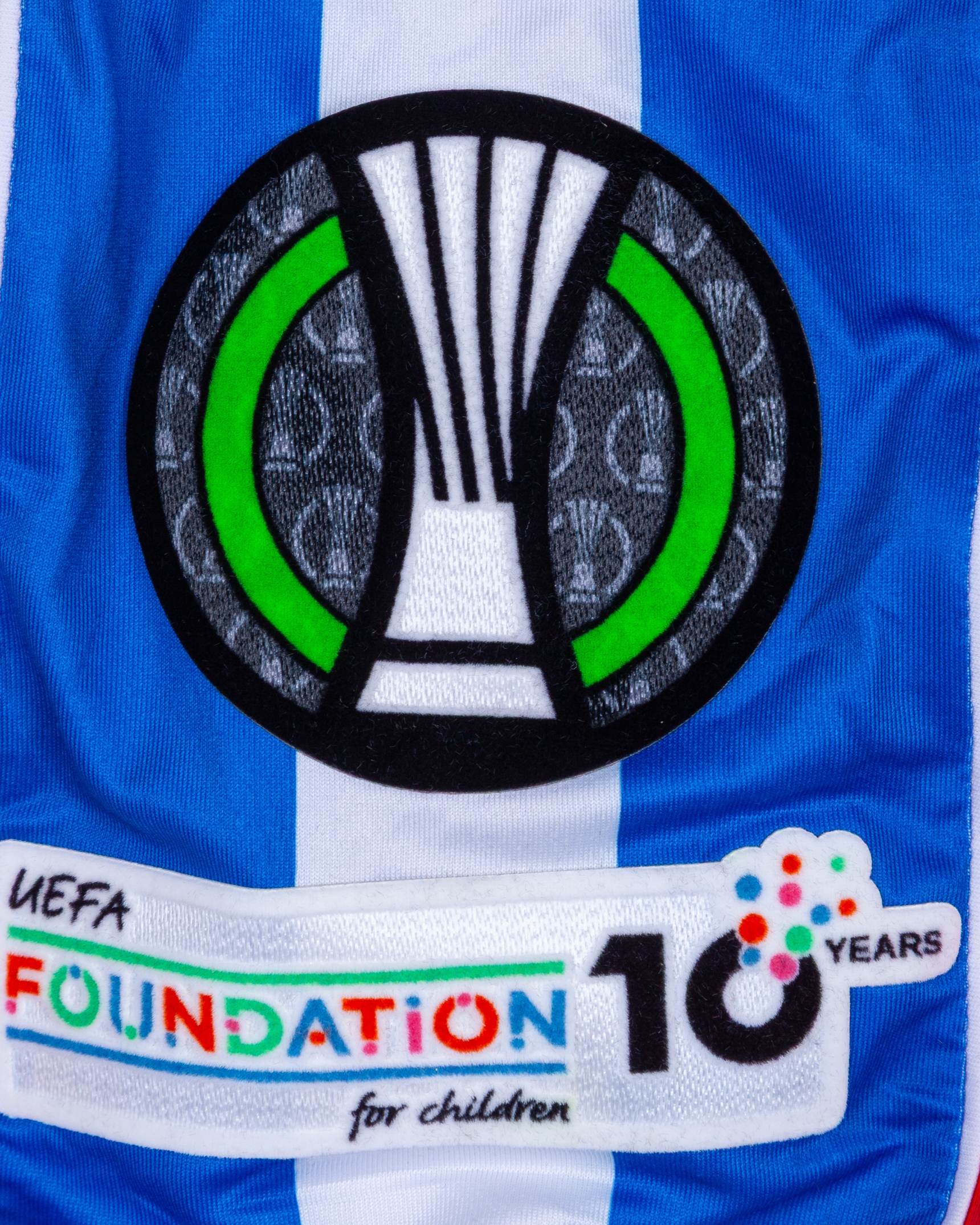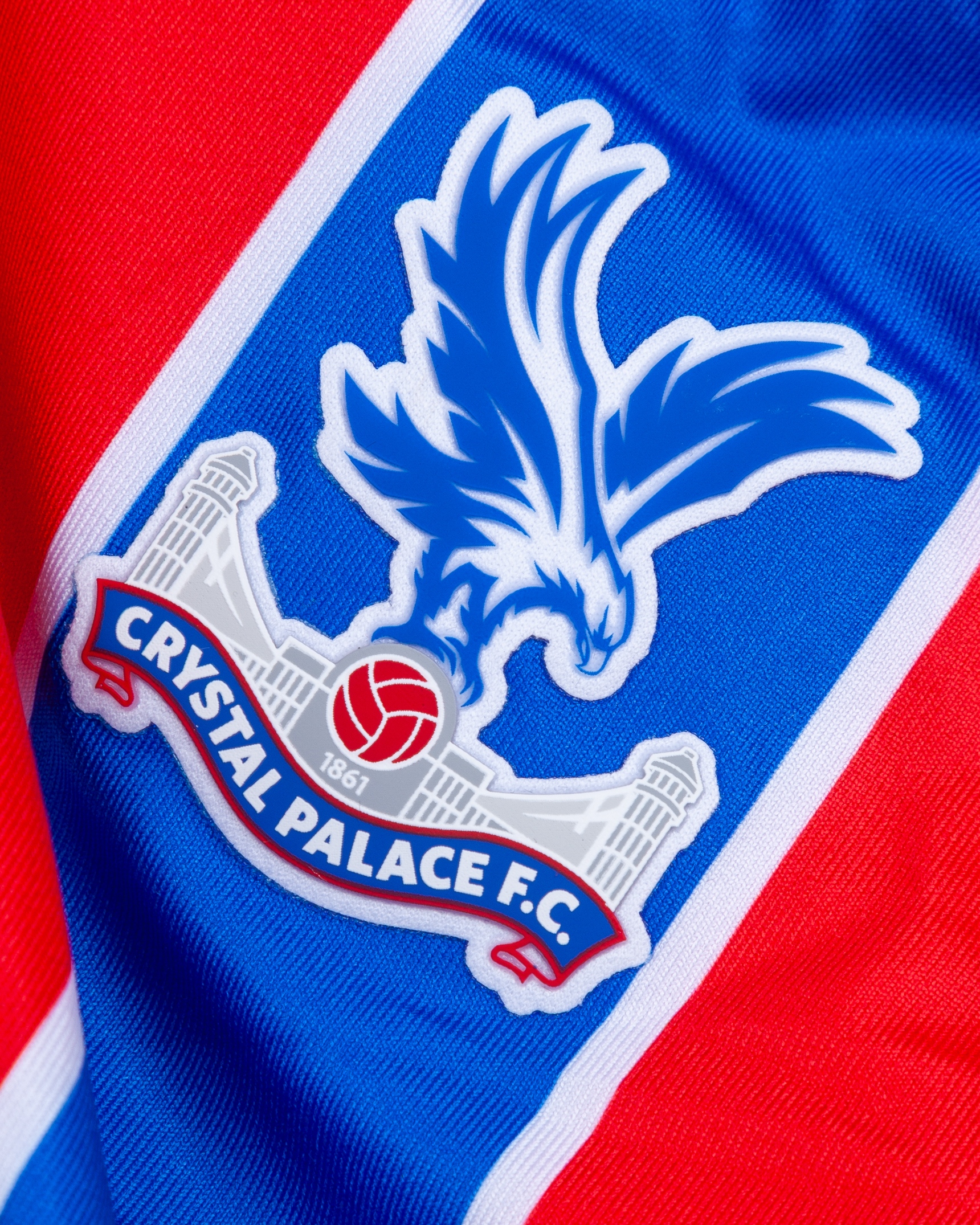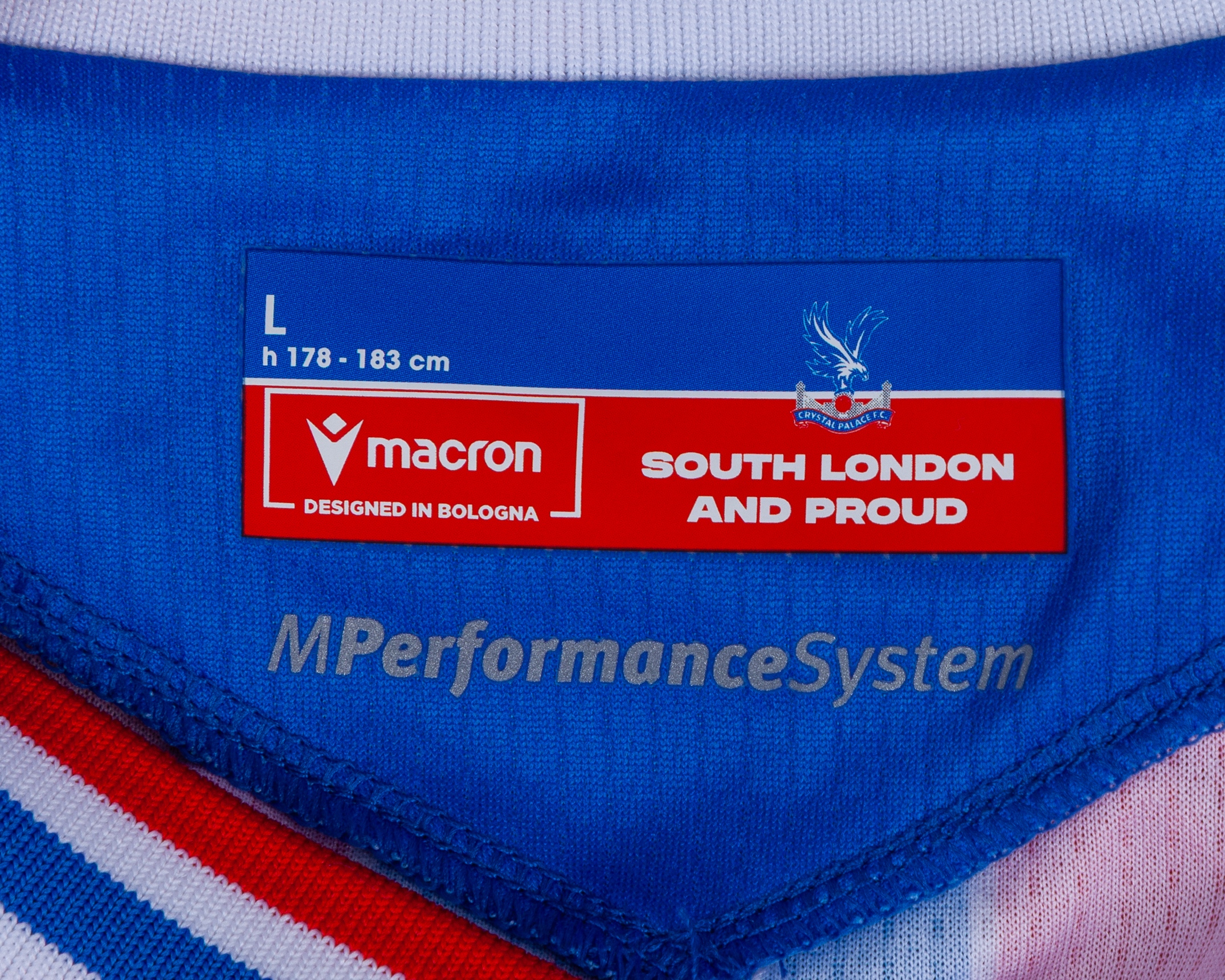 Tyrick Mitchell red and blue No.3 Crystal Palace v. AEK Larnaca match worn short-sleeved shirt, UEFA Conference League 2025, Macron, with crew-neck collar and printed badge, the reverse lettered MITCHELL, the right sleeve with UEFA flash