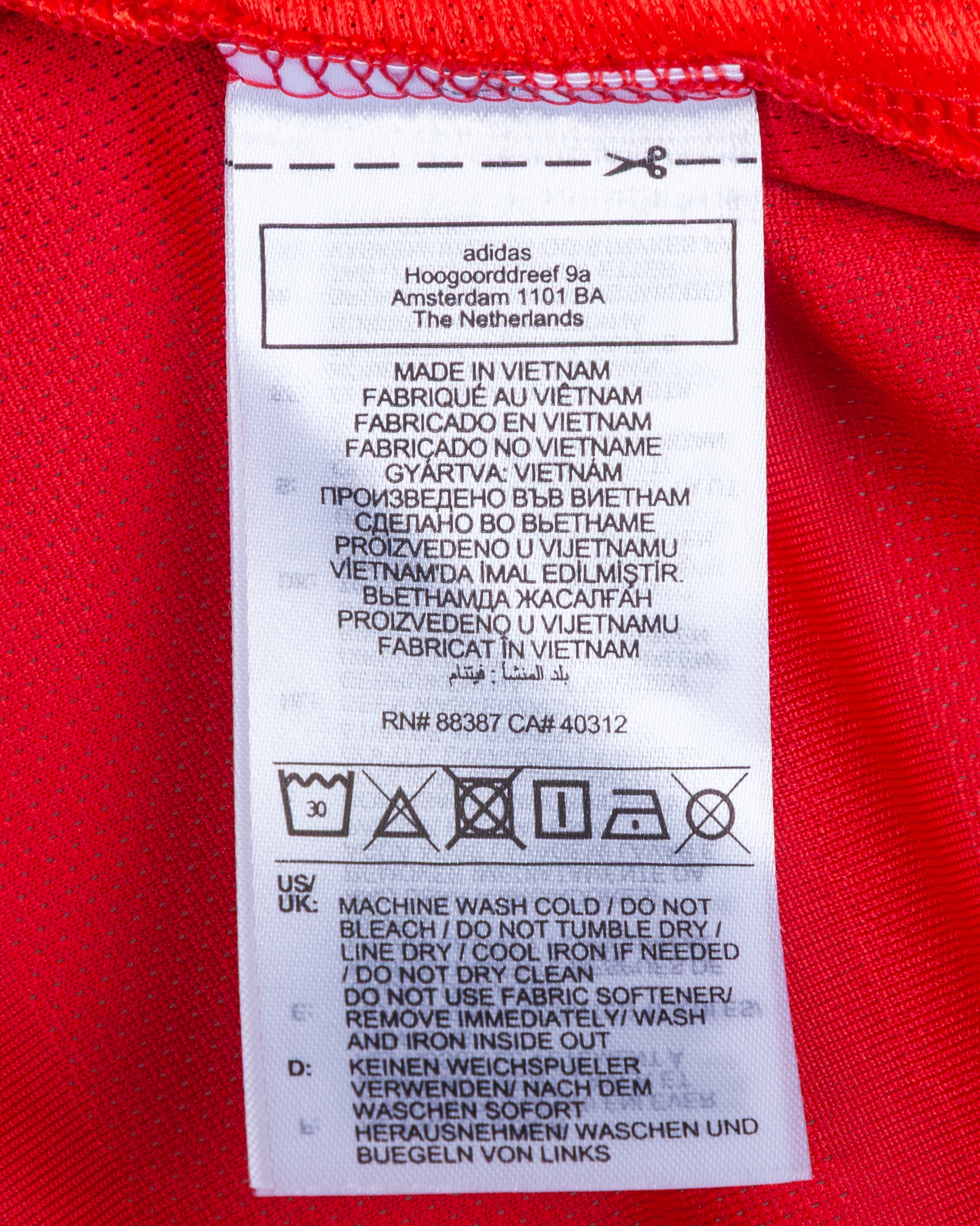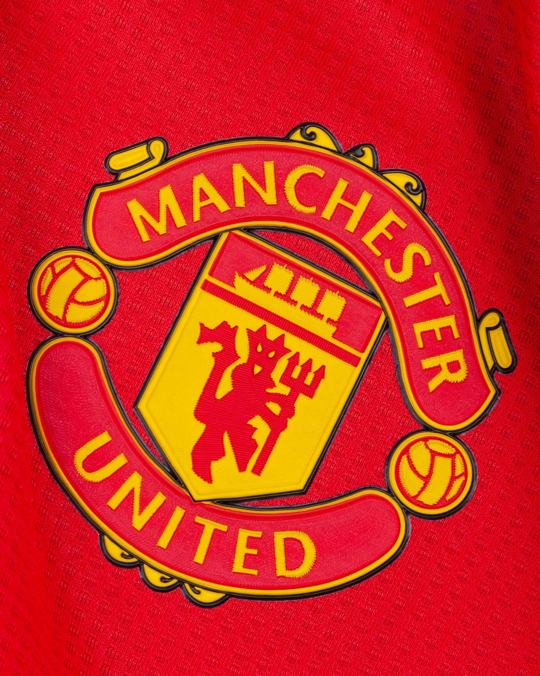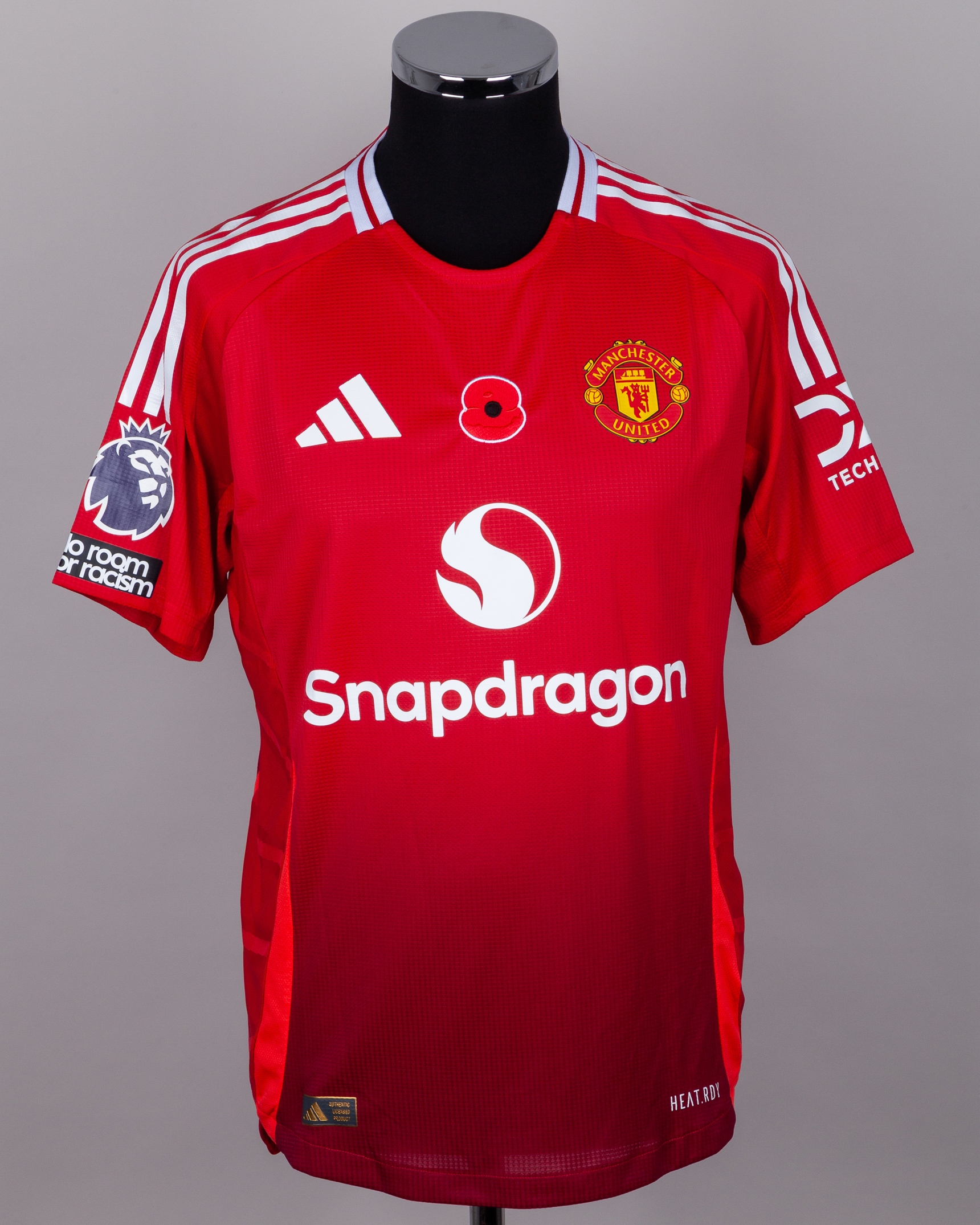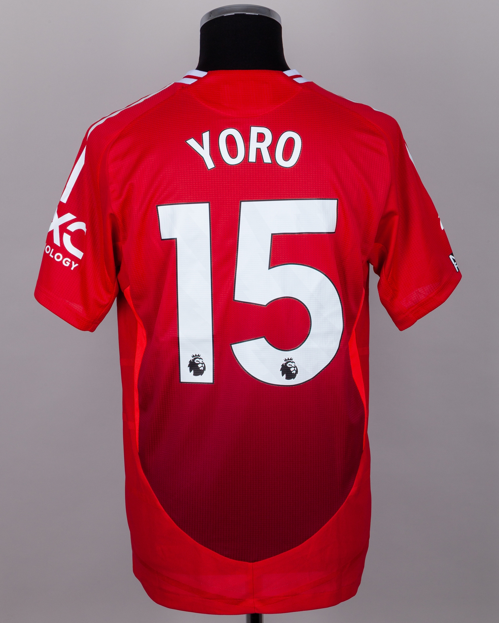 Leny Yoro red No.15 Manchester United v. Leicester City short-sleeved shirt. 2024, Adidas, L, with crew-neck collar and printed badge, with embroidered poppy badge, the reverse lettered YORO, the right sleeve with Premier league flash