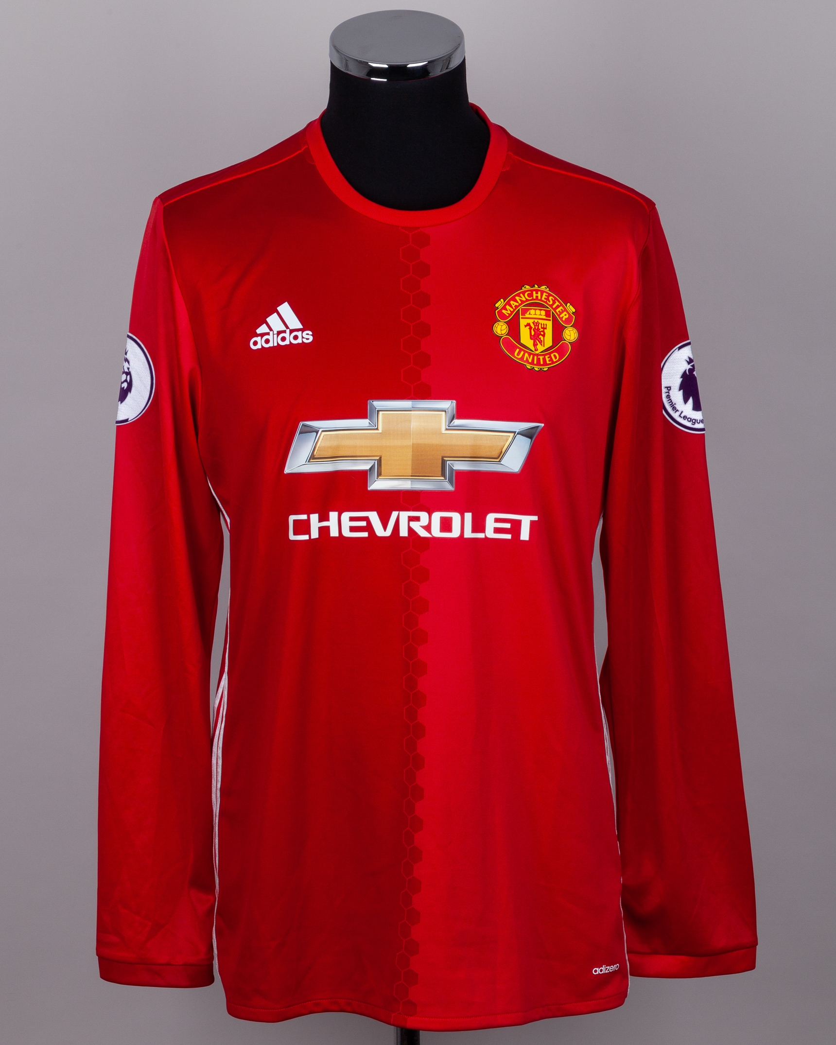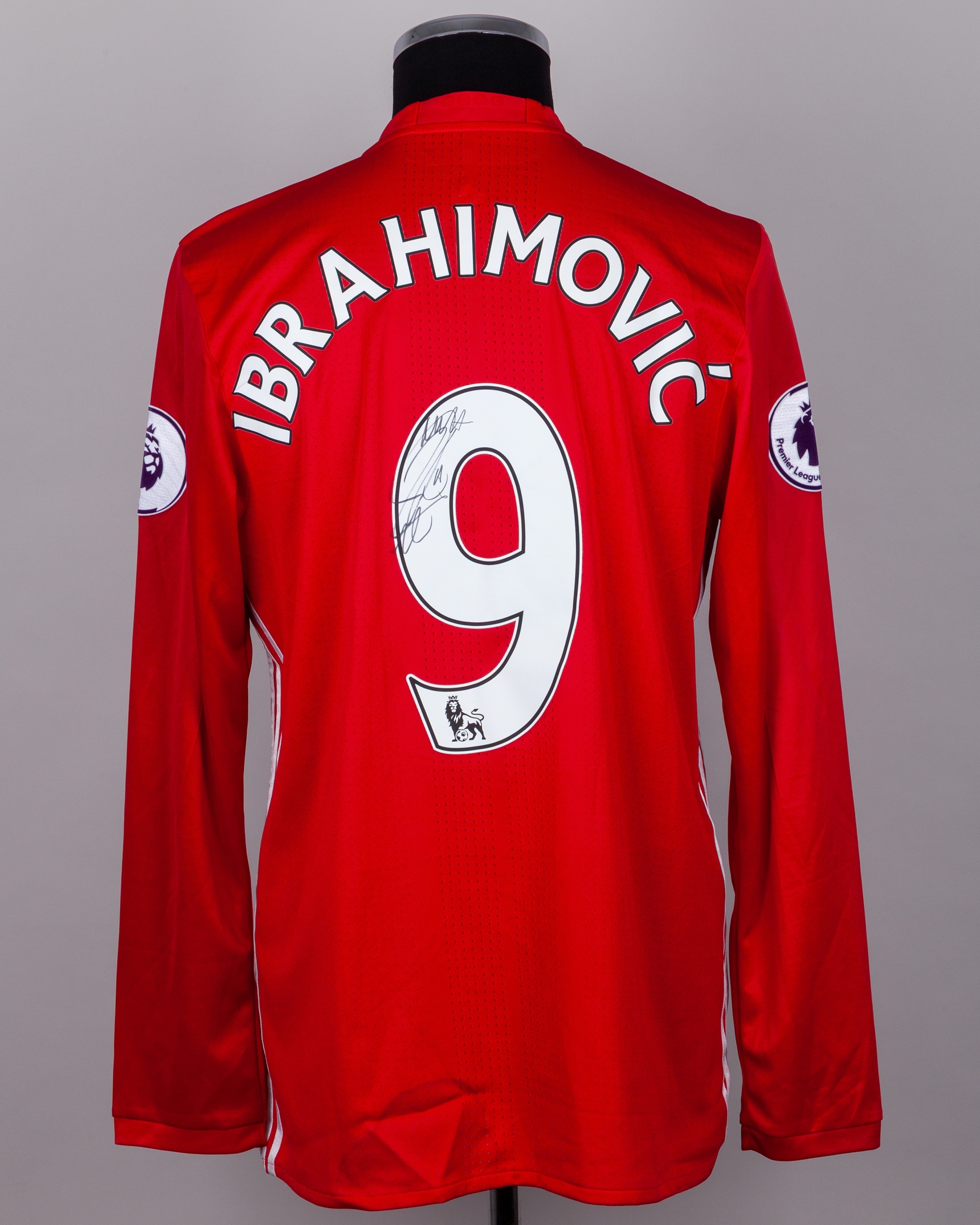 Zlatan Ibrahimovic red No.9 Manchester United v. Sunderland autographed long-sleeved shirt, 2016, Adidas, 9, with crew-neck collar and printed badge, the reverse lettered IBRAHIMOVIC, the sleeves with Premier League flashes, autographed on the number