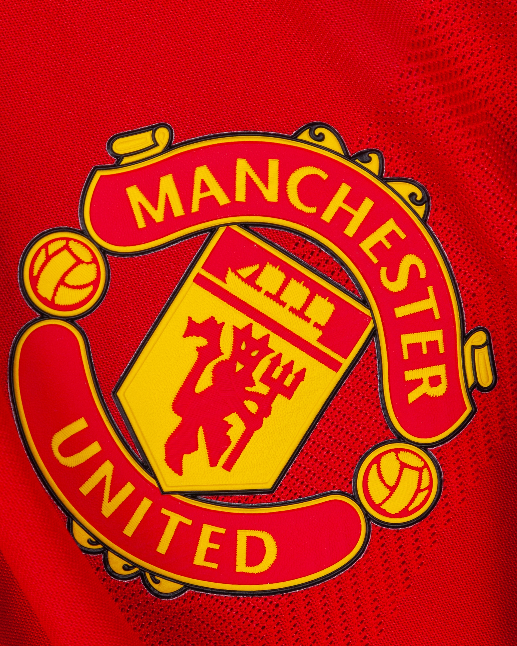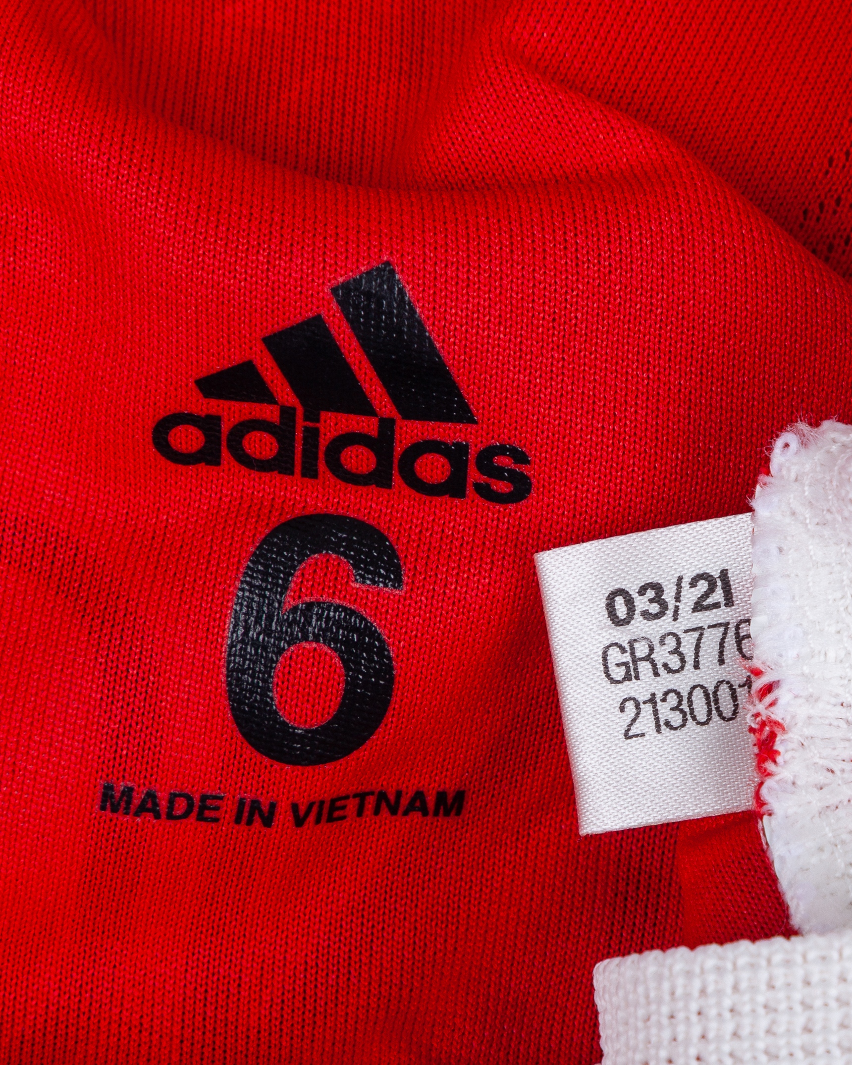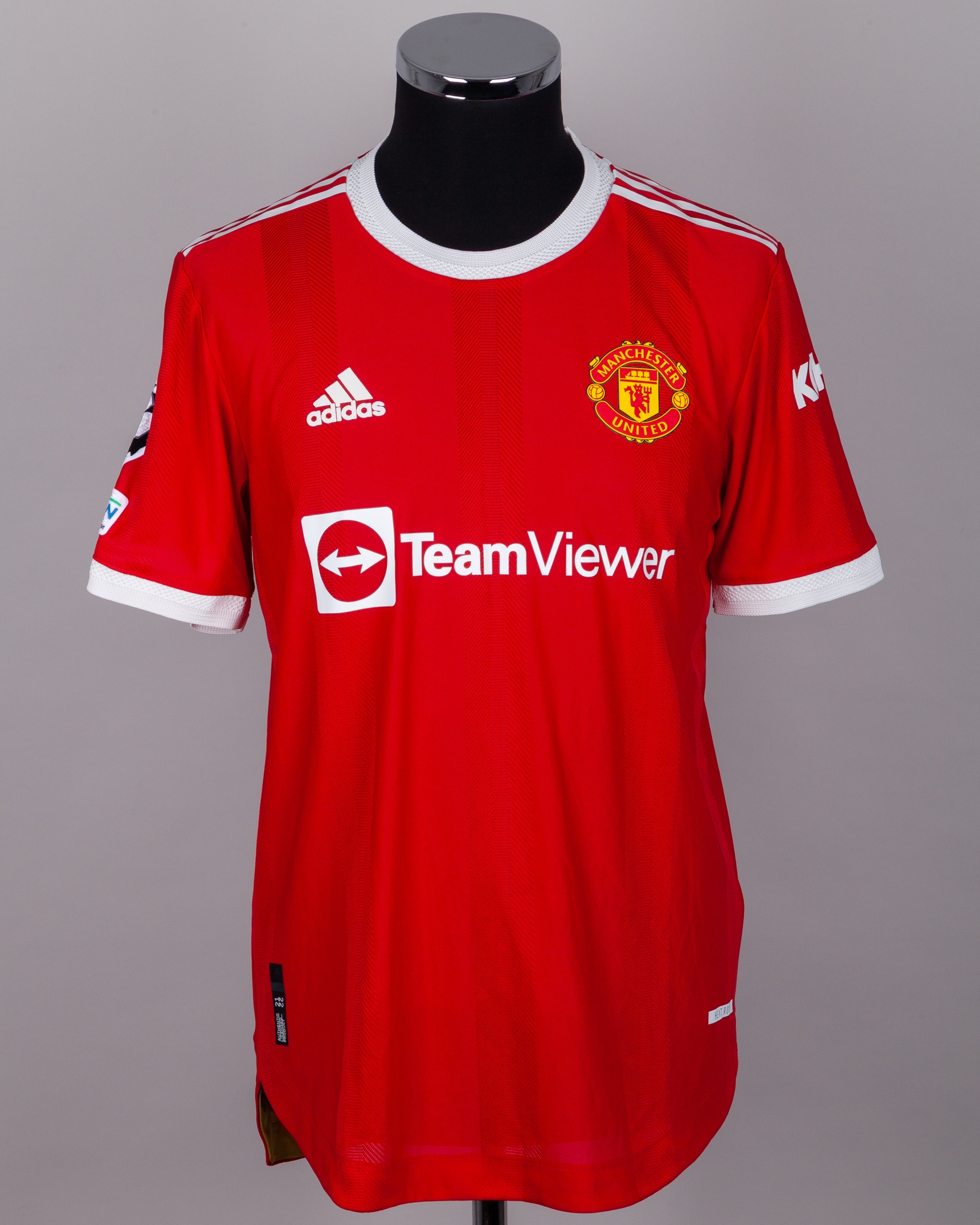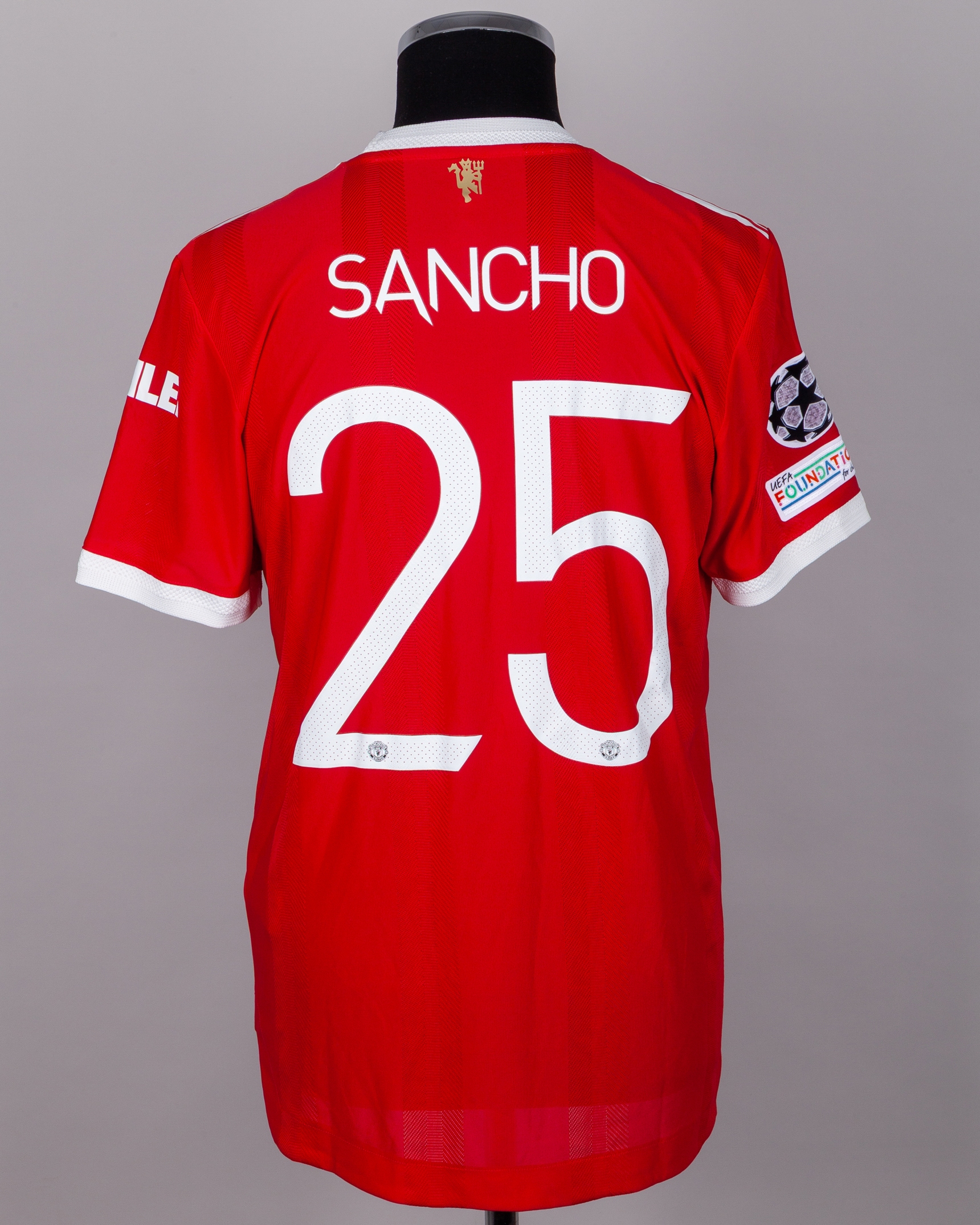 Jadon Sancho red No.25 Manchester United match worn Champions League short-sleeved shirt, 2021-22, Adidas, 6, with crew-neck collar and printed badge, the reverse lettered SANCHO, the right sleeve with Champions League and UEFA foundation flashes