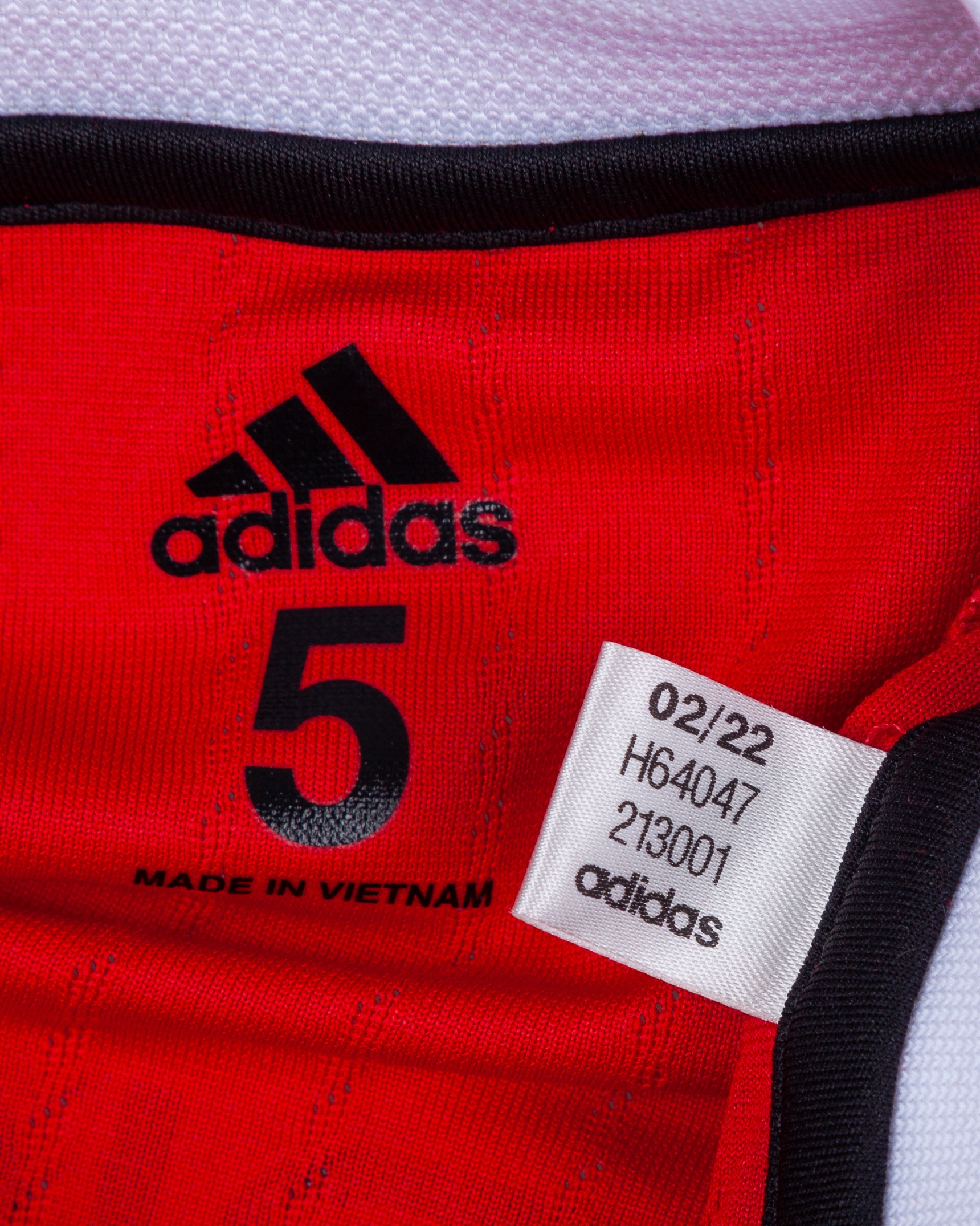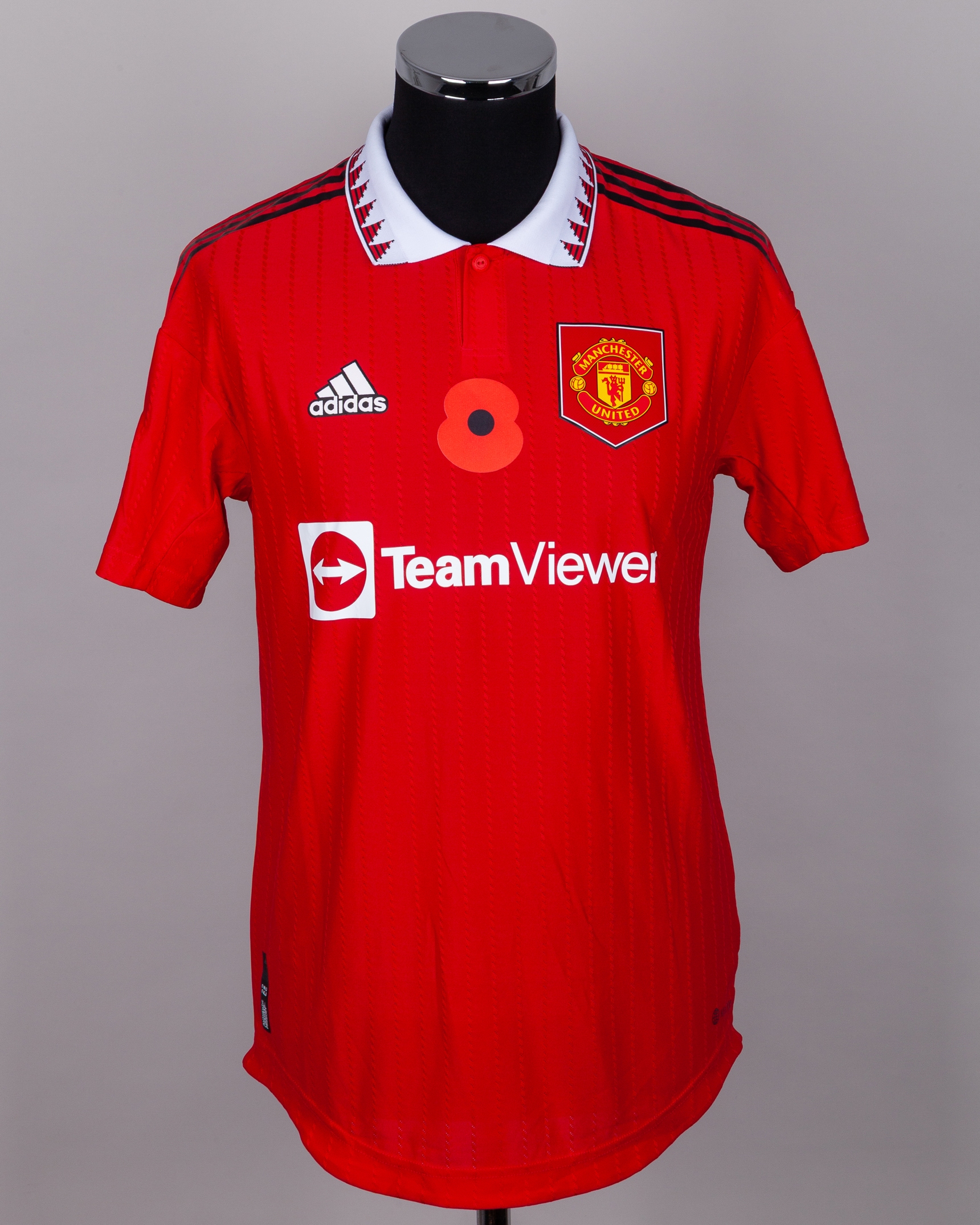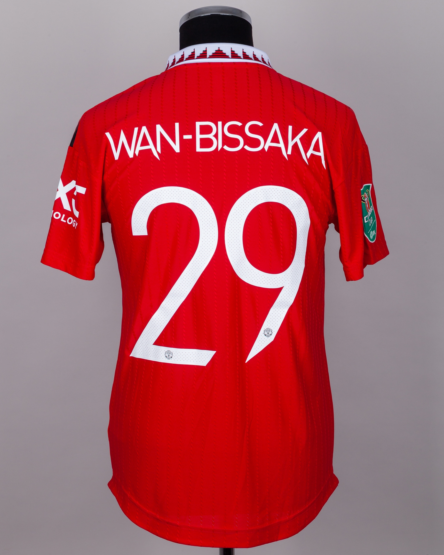 Aaron Wan-Bissaka red No.29 Manchester United v. Aston Villa short-sleeved shirt, 2022, Adidas, 5, with button-up collar and printed badge, with poppy badge, the reverse lettered WAN-BISSAKA, the right sleeve with Carabao Cup EFL flash