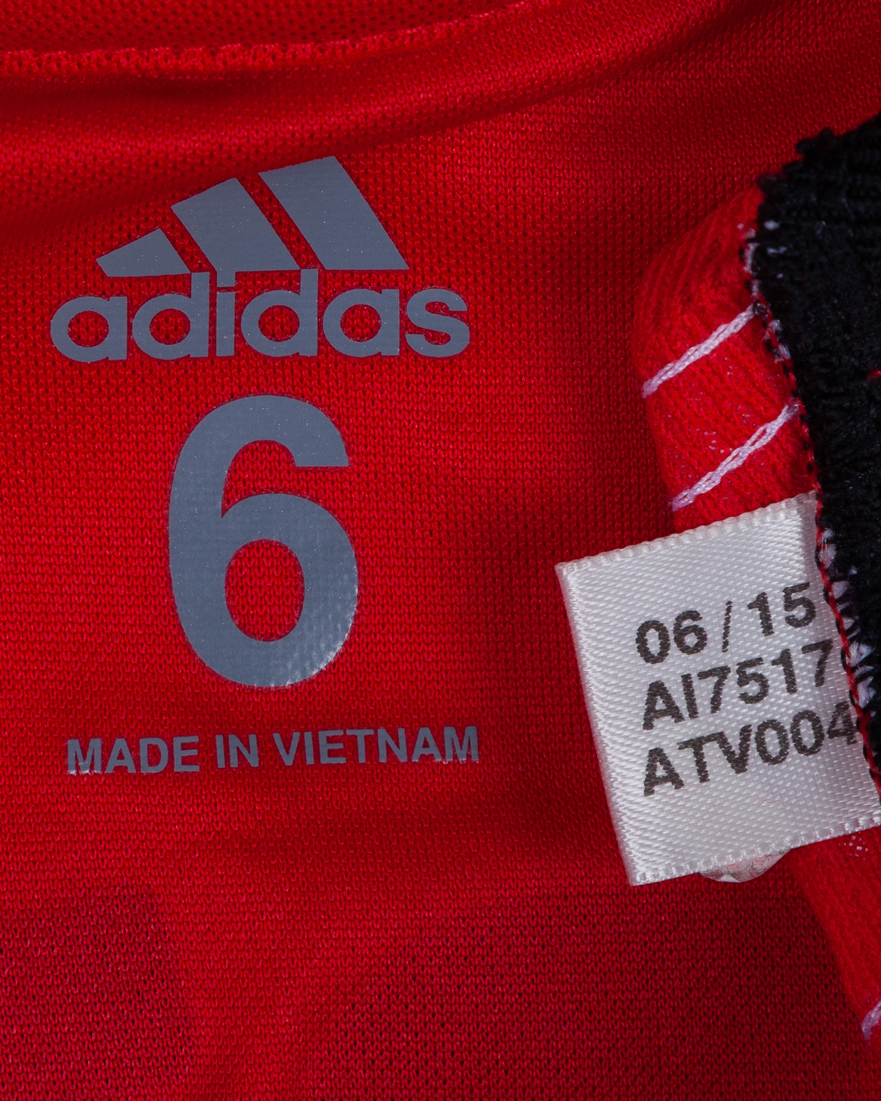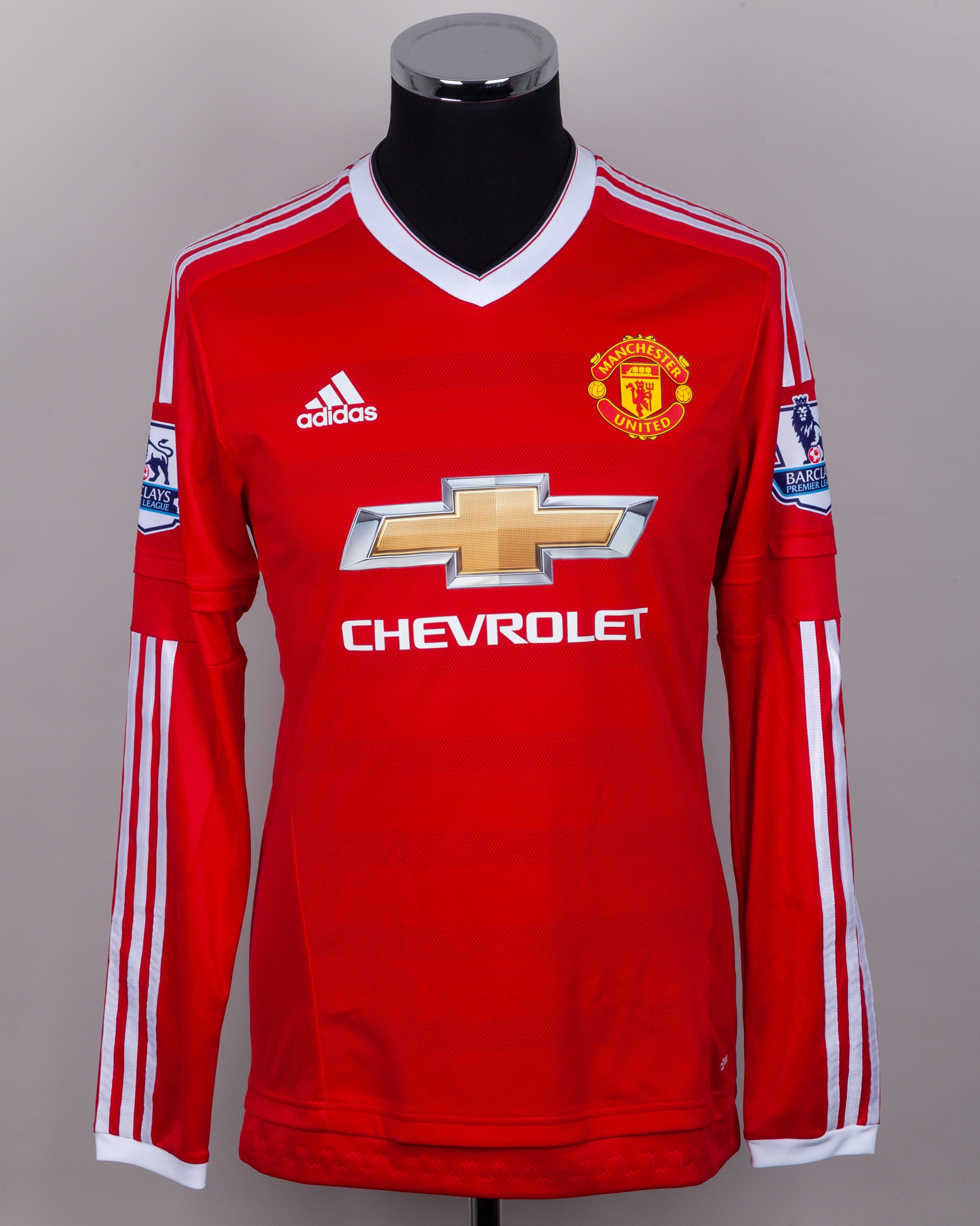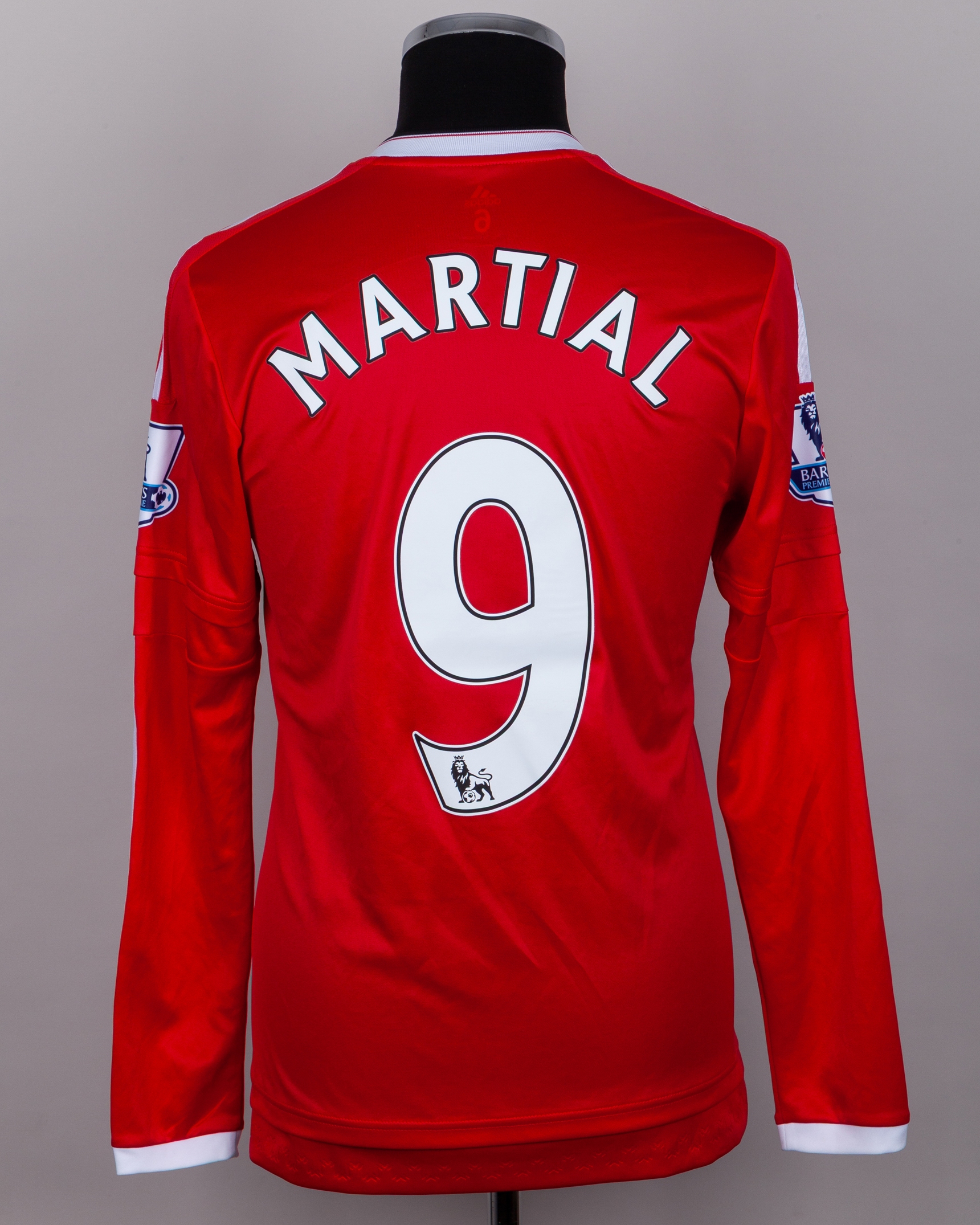 Anthony Martial red and white No.9 Manchester United match issued long-sleeved shirt, 2015-16, Adidas, 6, with v-neck collar and printed badge, the reverse lettered MARTIAL, the sleeves with Barclays Premier League flashes