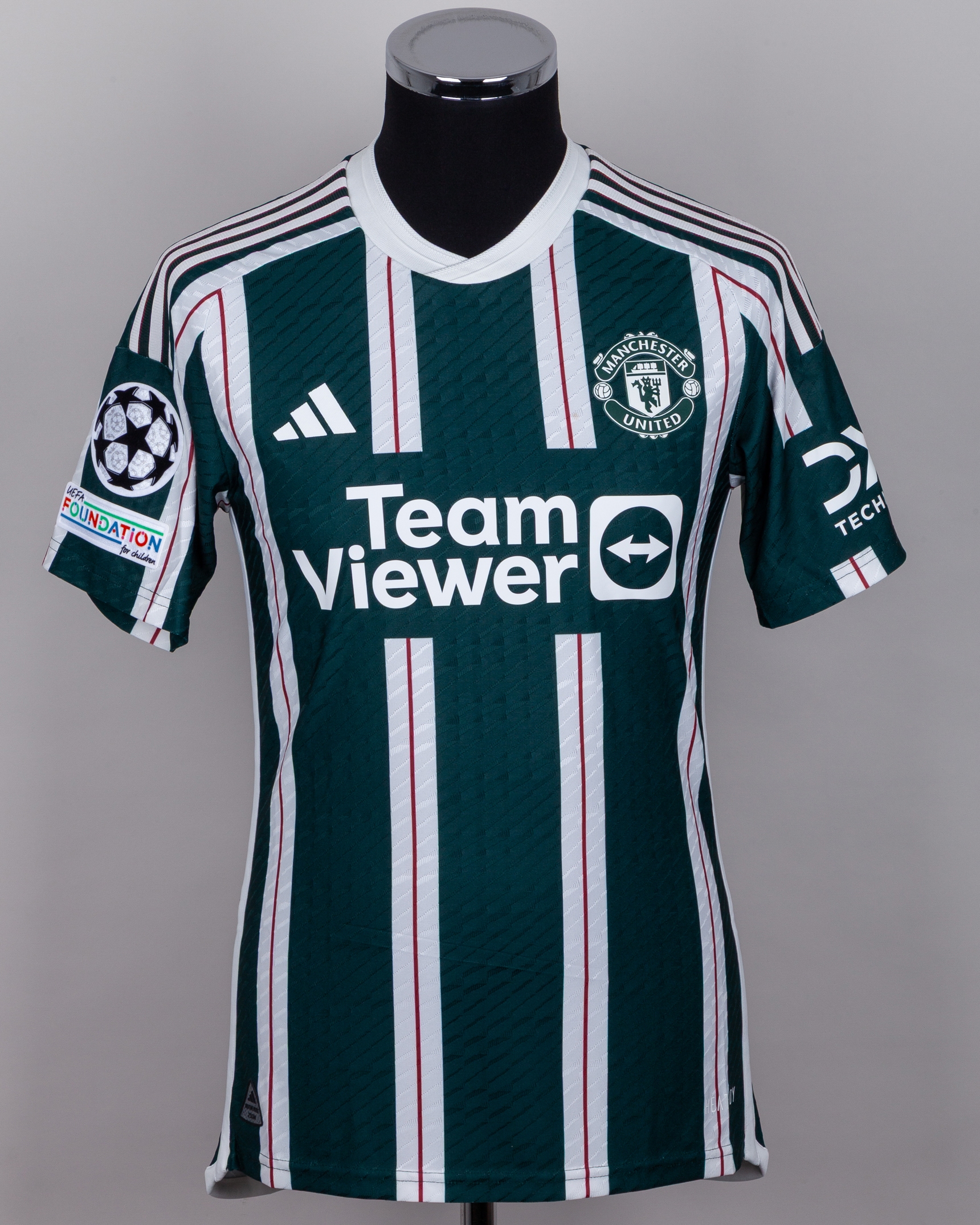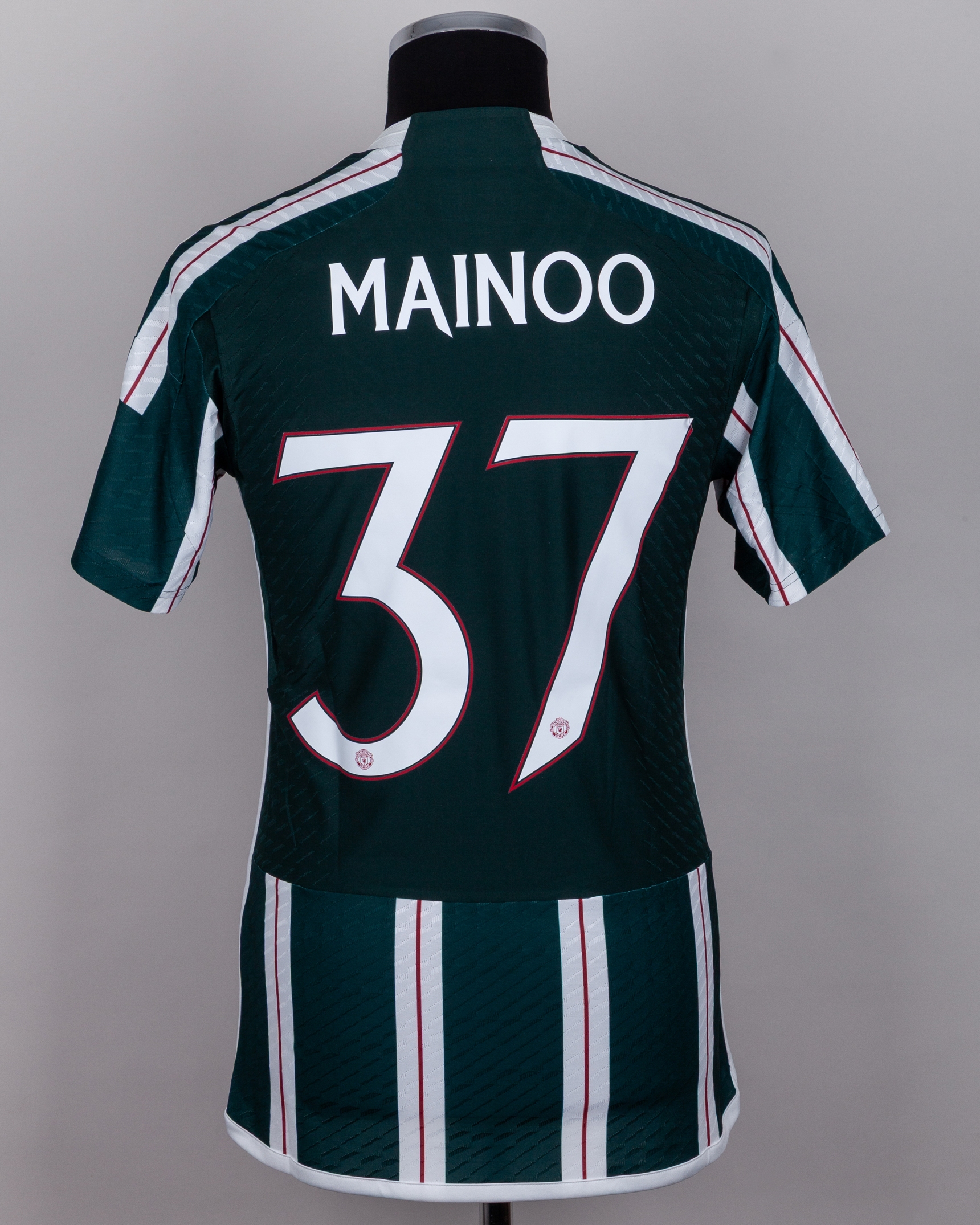 Kobbie Mainoo green and white No.37 Manchester United Champions League short-sleeved shirt, 2023-24, Adidas, S, with v-neck collar and printed badge, the reverse lettered MAINOO, the right sleeve with Champions League and UEFA Foundation for children flashes