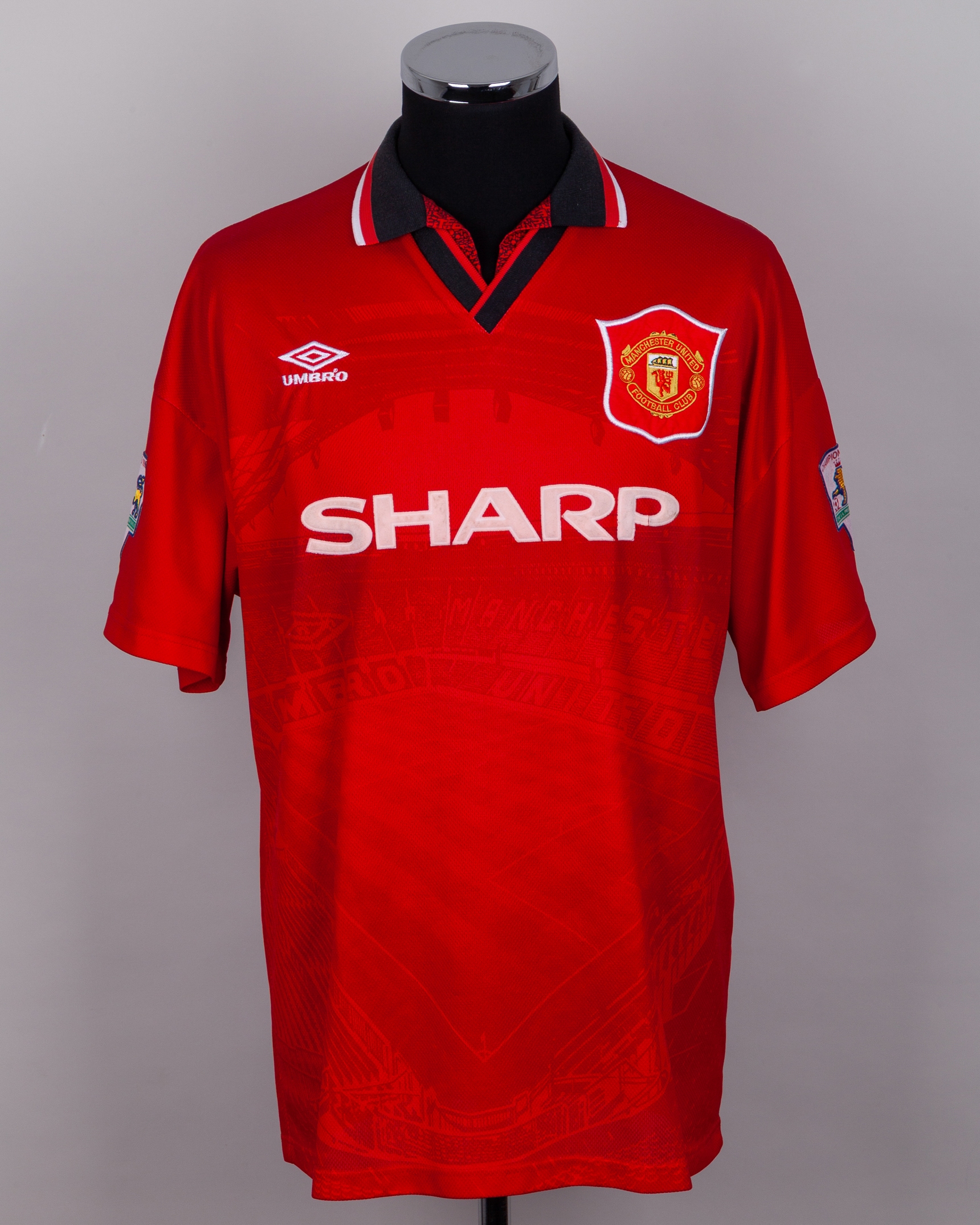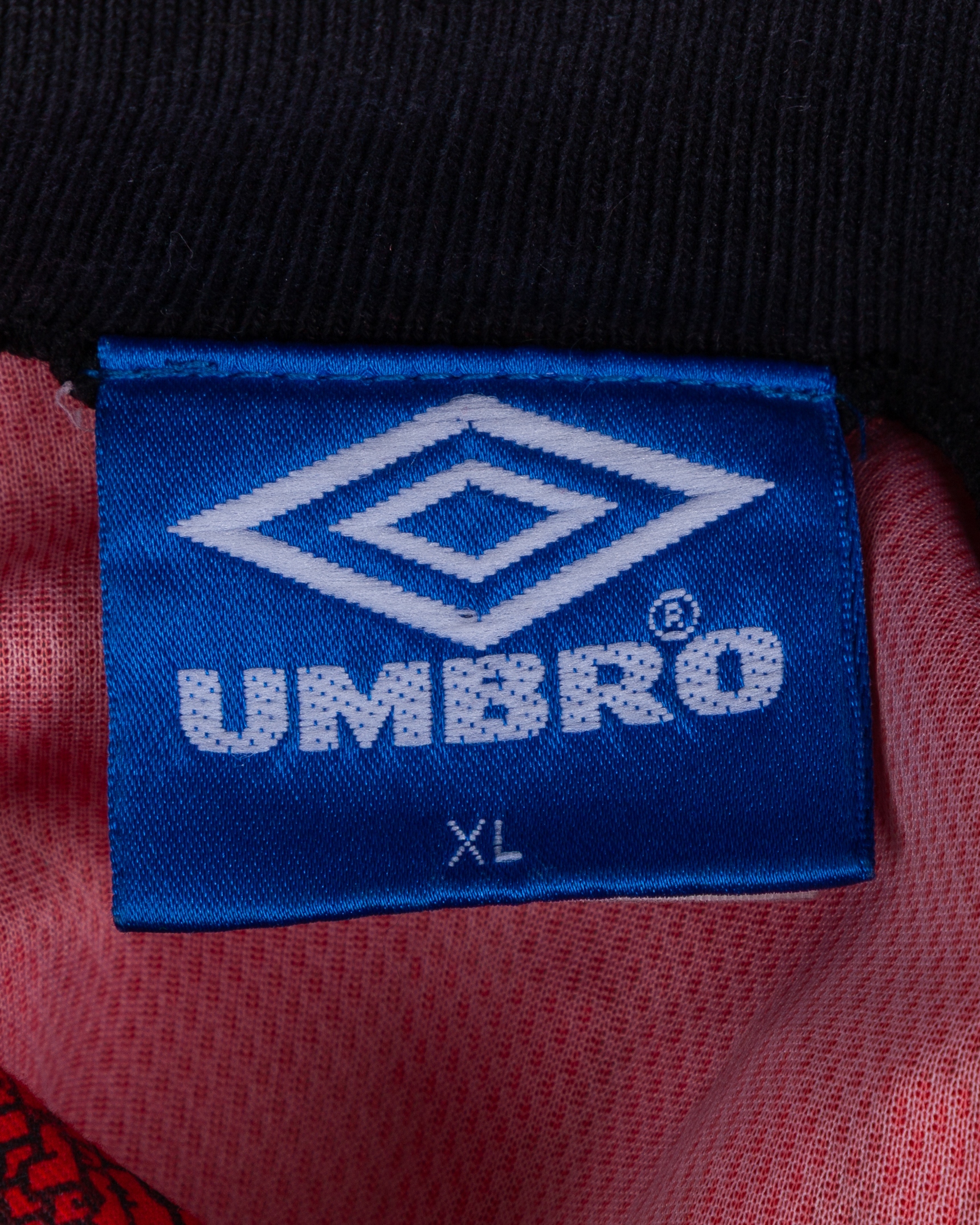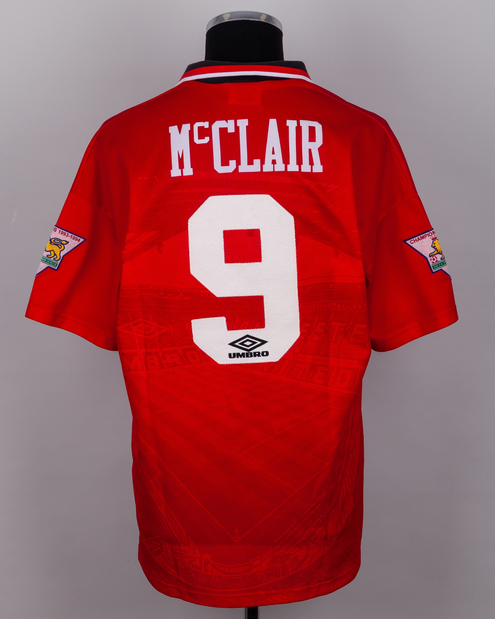 Brian McClair red, black and white No.9 Manchester United short-sleeved shirt, 1994-95, Umbro, XL, with v-neck and embroidered cloth badge inscribed MANCHESTER UNITED FOOTBALL CLUB, the reverse lettered McCLAIR, the sleeves with Champions1993-94 The F.A.Premier League
