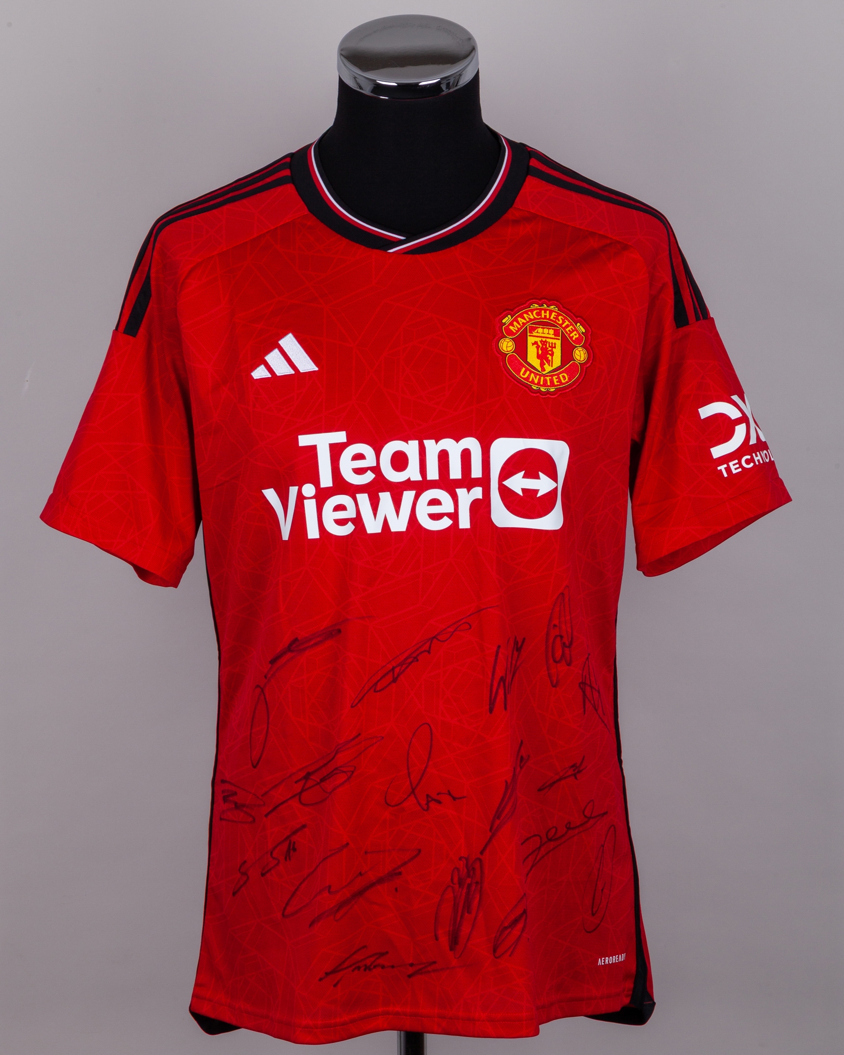Red and black Manchester United autographed replica short-sleeved shirt, 2023-24, Adidas, L, with crew-neck collar and embroidered cloth badge inscribed MANCHESTER UNITED, with seventeen autographs including Bruno Fernandes, Harry Maguire, Amad Diallo and Jonny Evans etc.