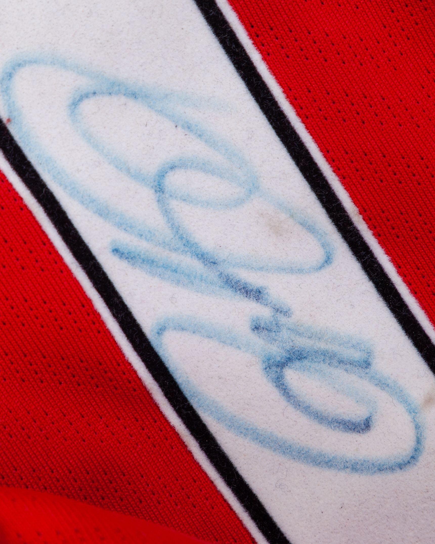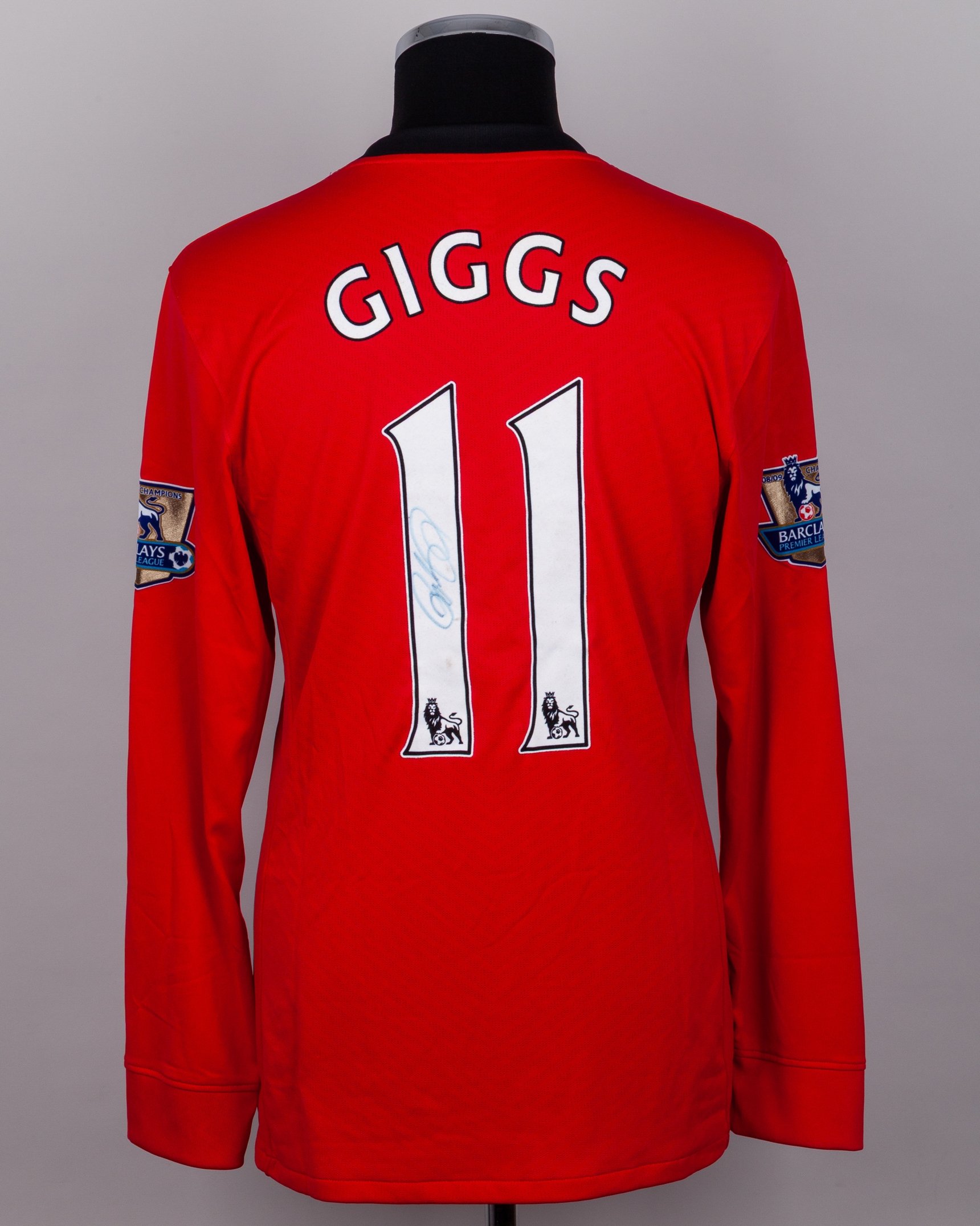 Ryan Giggs red and black No.11 Manchester United long-sleeved shirt, 2009-10, Nike, L. with crew-neck collar and embroidered cloth badge inscribed MANCHESTER UNITED, the reverse lettered GIGGS, the number autographed, the sleeves with 08/09 Champions Barclays Premier league flashes, with COA