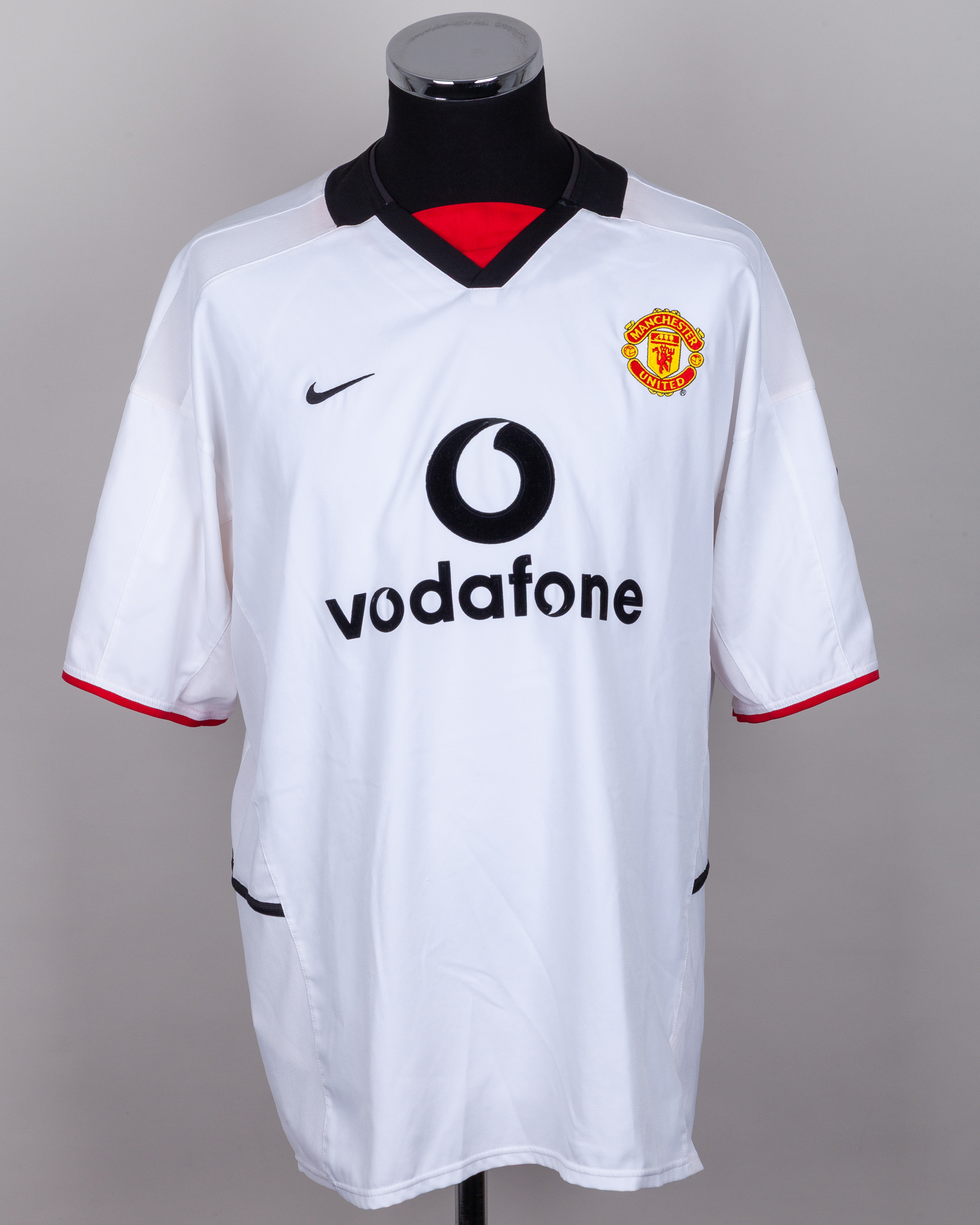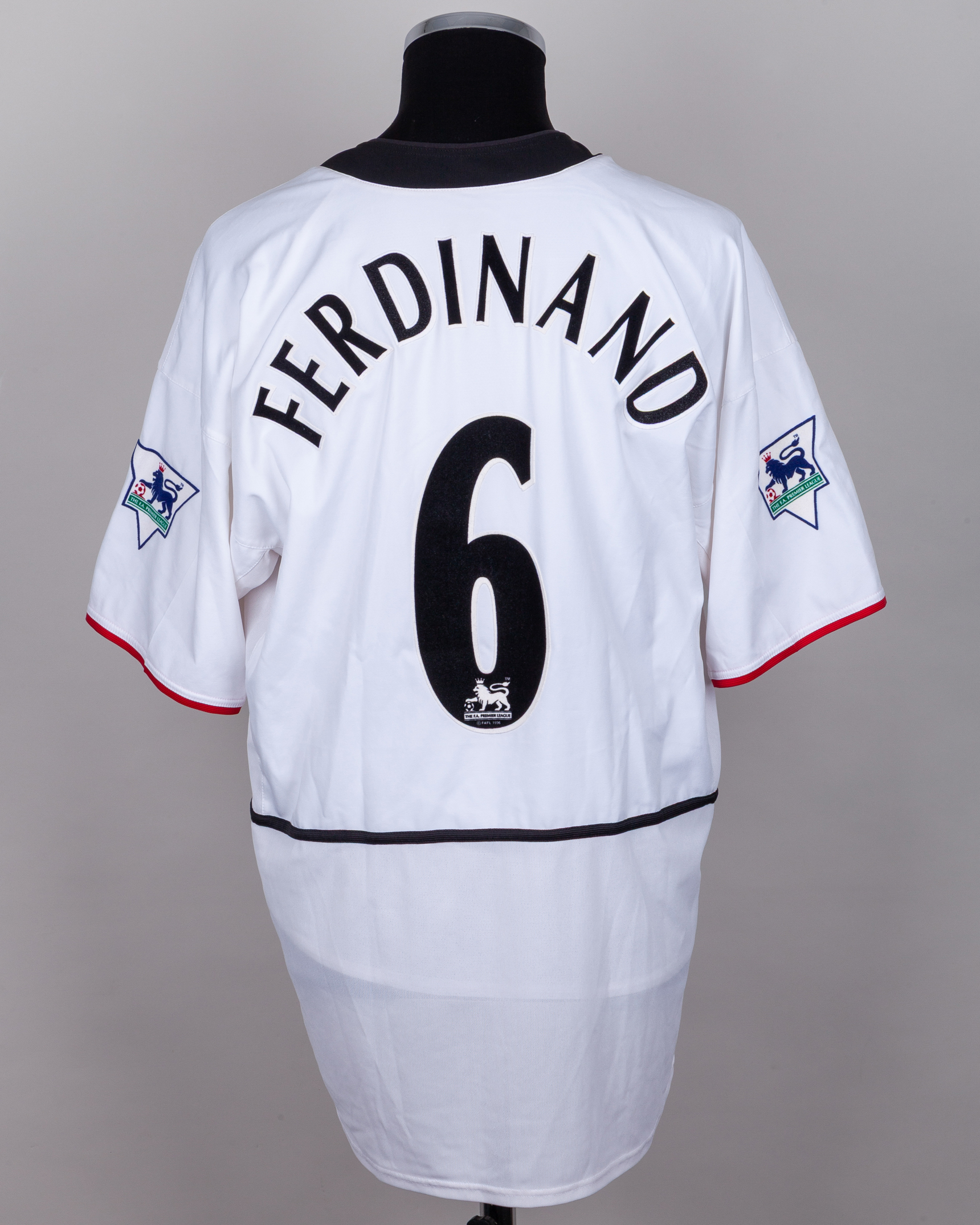 Rio Ferdinand white, red and black No.6 Manchester United short-sleeved shirt, 2002-03, Nike, XL. with v-neck collar and embroidered badge inscribed MANCHESTER UNITED, the reverse lettered FERDINAND, the sleeves with The F.A. Premier League flashes, with COA