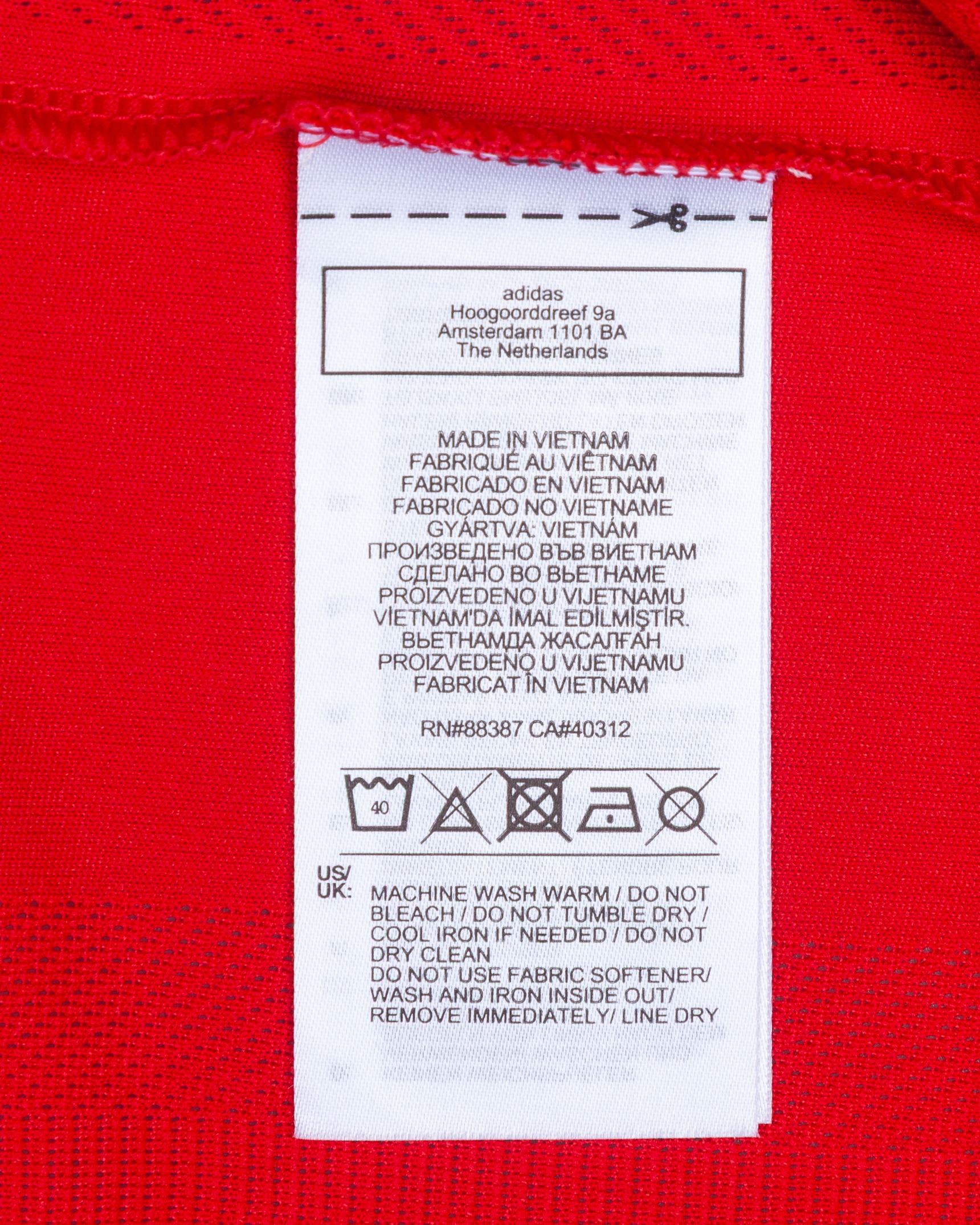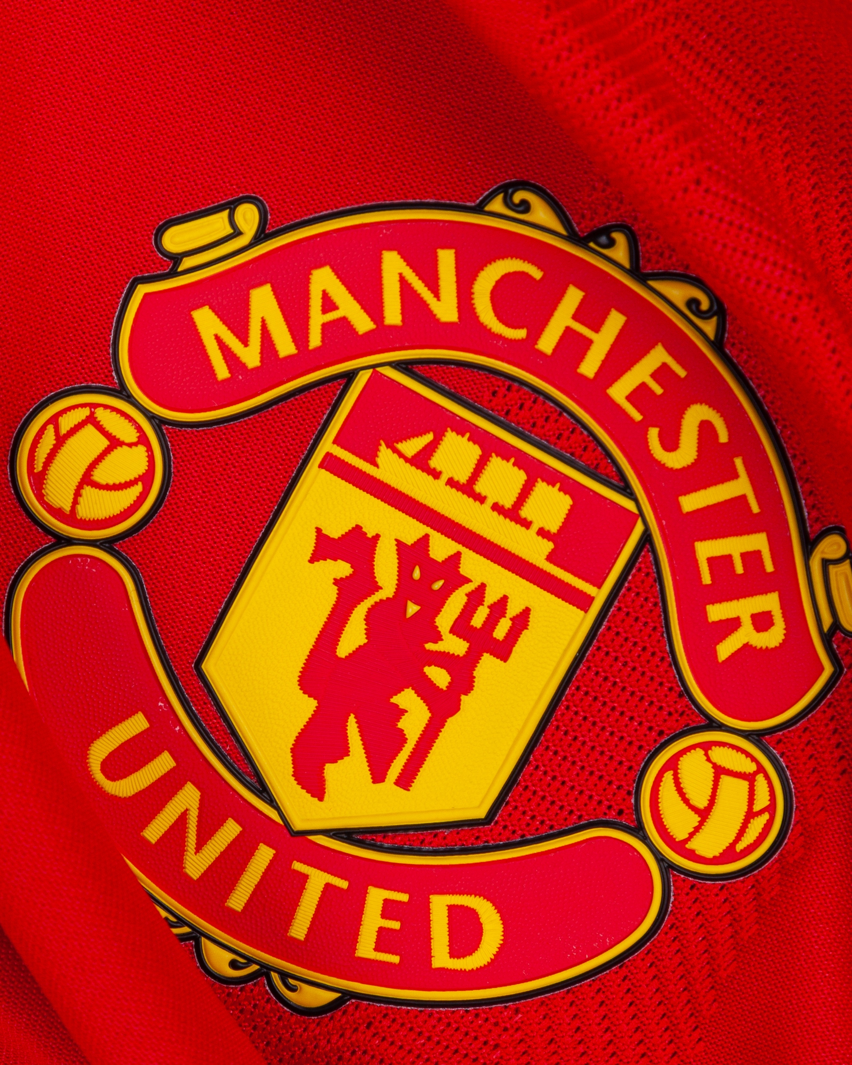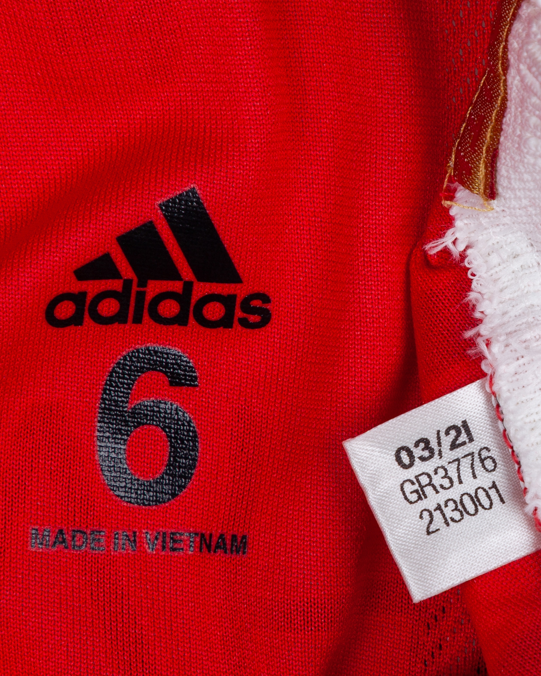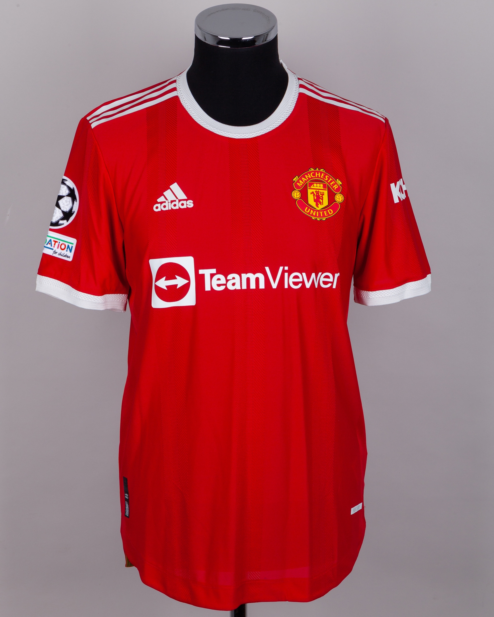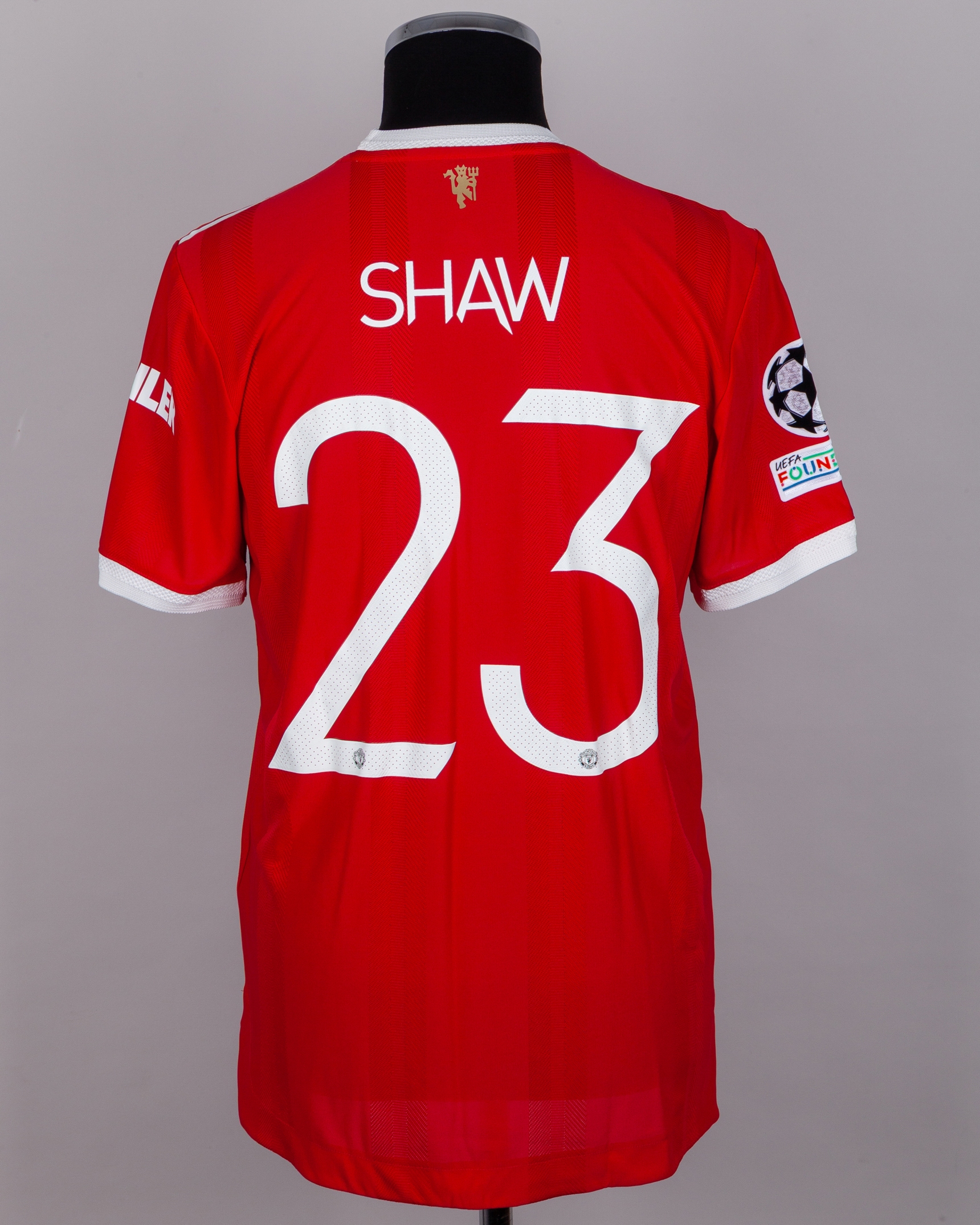 Luke Shaw red No.23 Manchester United v. Atletico Madrid short-sleeved shirt, 2022, Adidas, 6, with crew-neck collar and printed badge, the reverse lettered SHAW, the right sleeve with Champions League and UEFA foundation flash, with damp smell