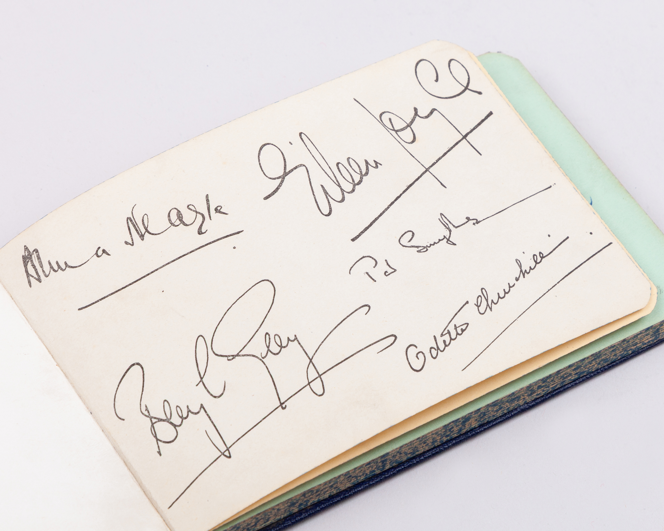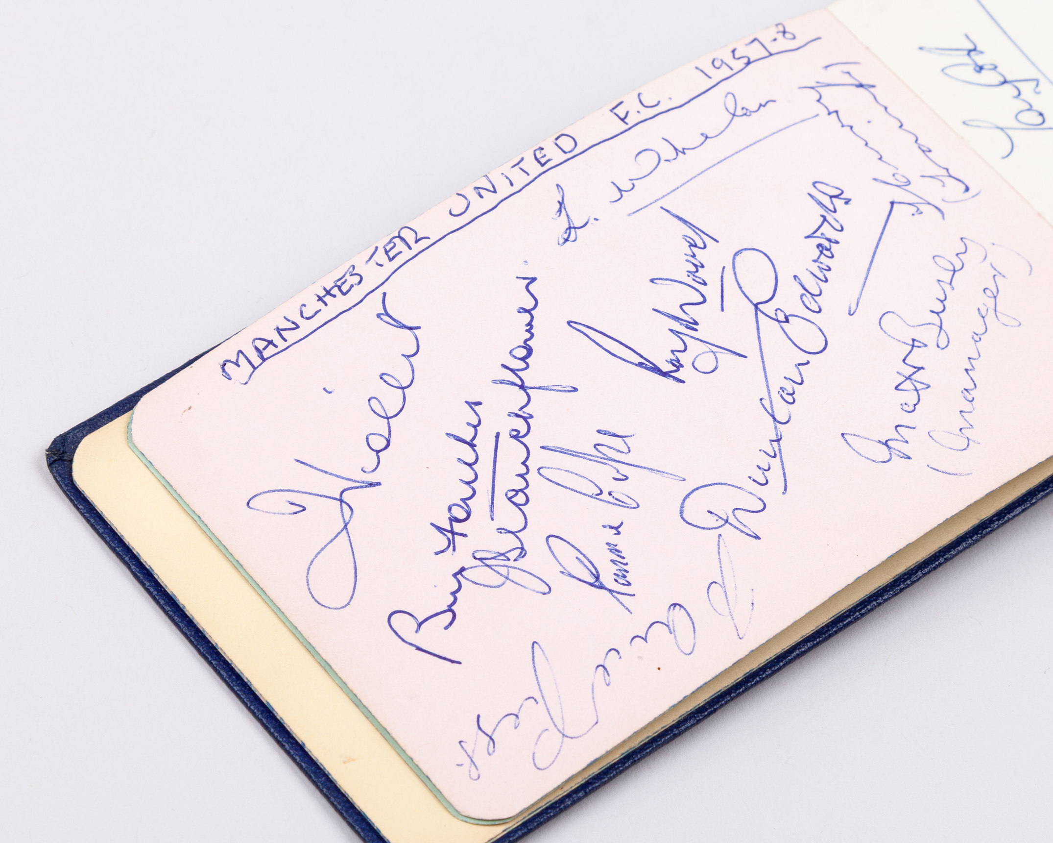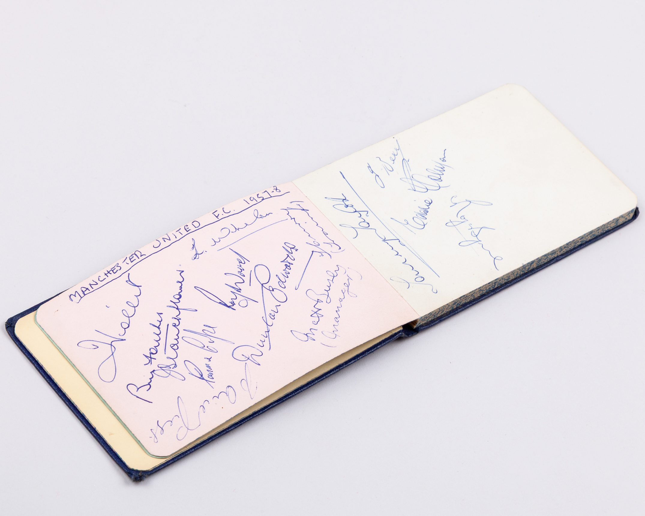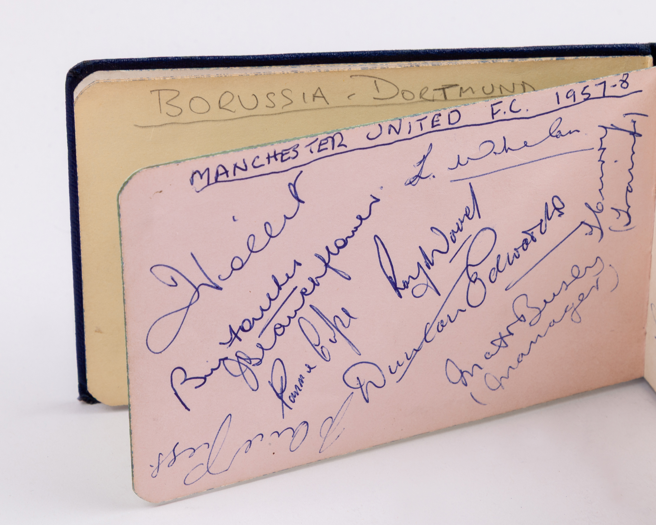 Manchester United - 1957-58 autographs, the double pages signed by Edwards, Wood, Blancheflower, Busby, Whelan, Foulkes, Pegg, Taylor, Byrne, Colman, Berry Violett, Cope and Tom Curry