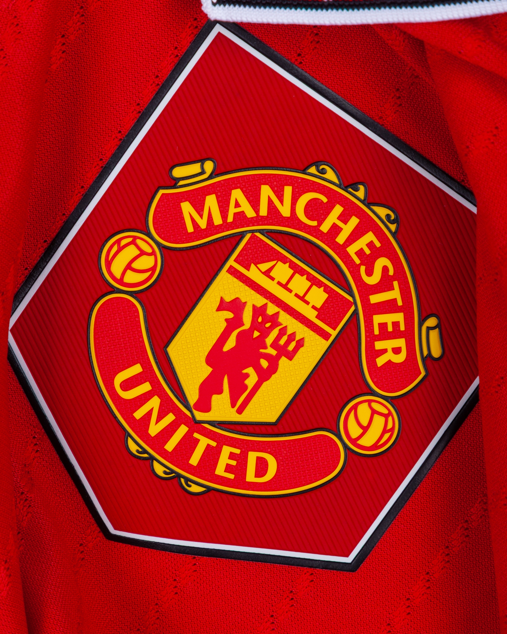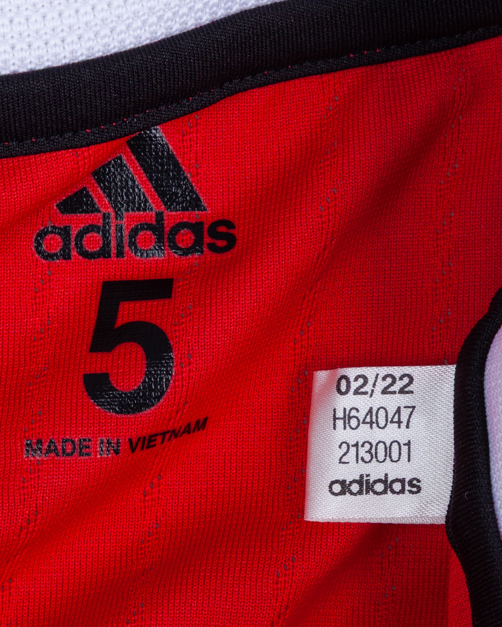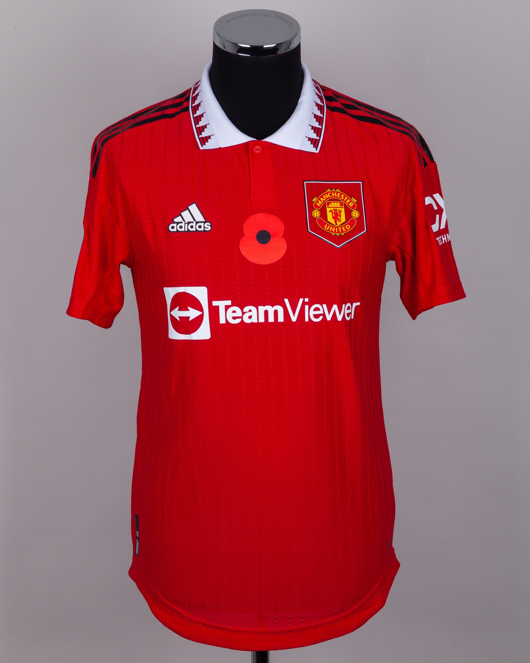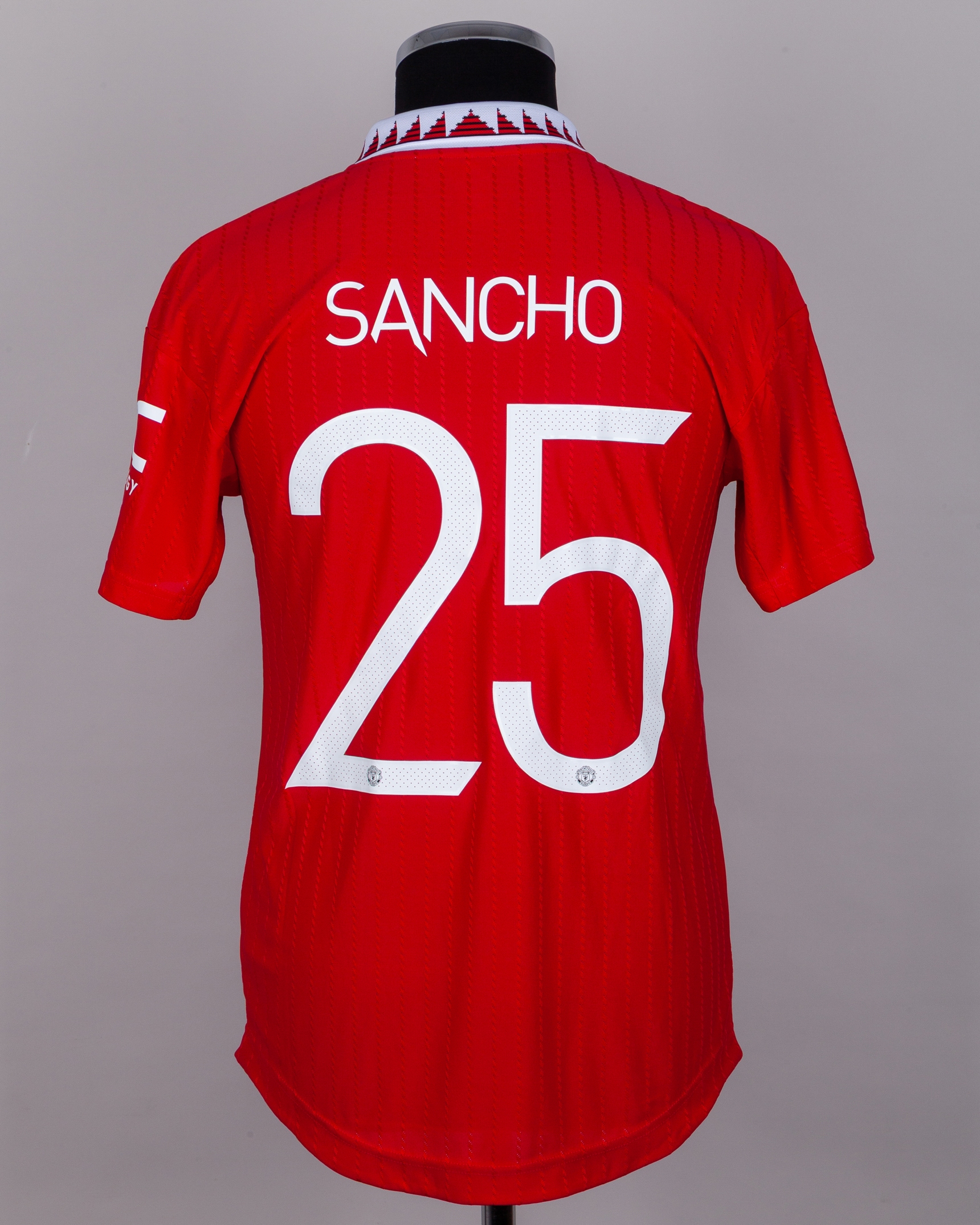 Jadon Sancho red No.25 Manchester United v. Aston Villa short-sleeved shirt, 2022, Adidas, 5, with button-up collar and printed badge, with poppy badge, the reverse lettered SANCHO, the right sleeve with Carabao Cup EFL flash, with damp smell