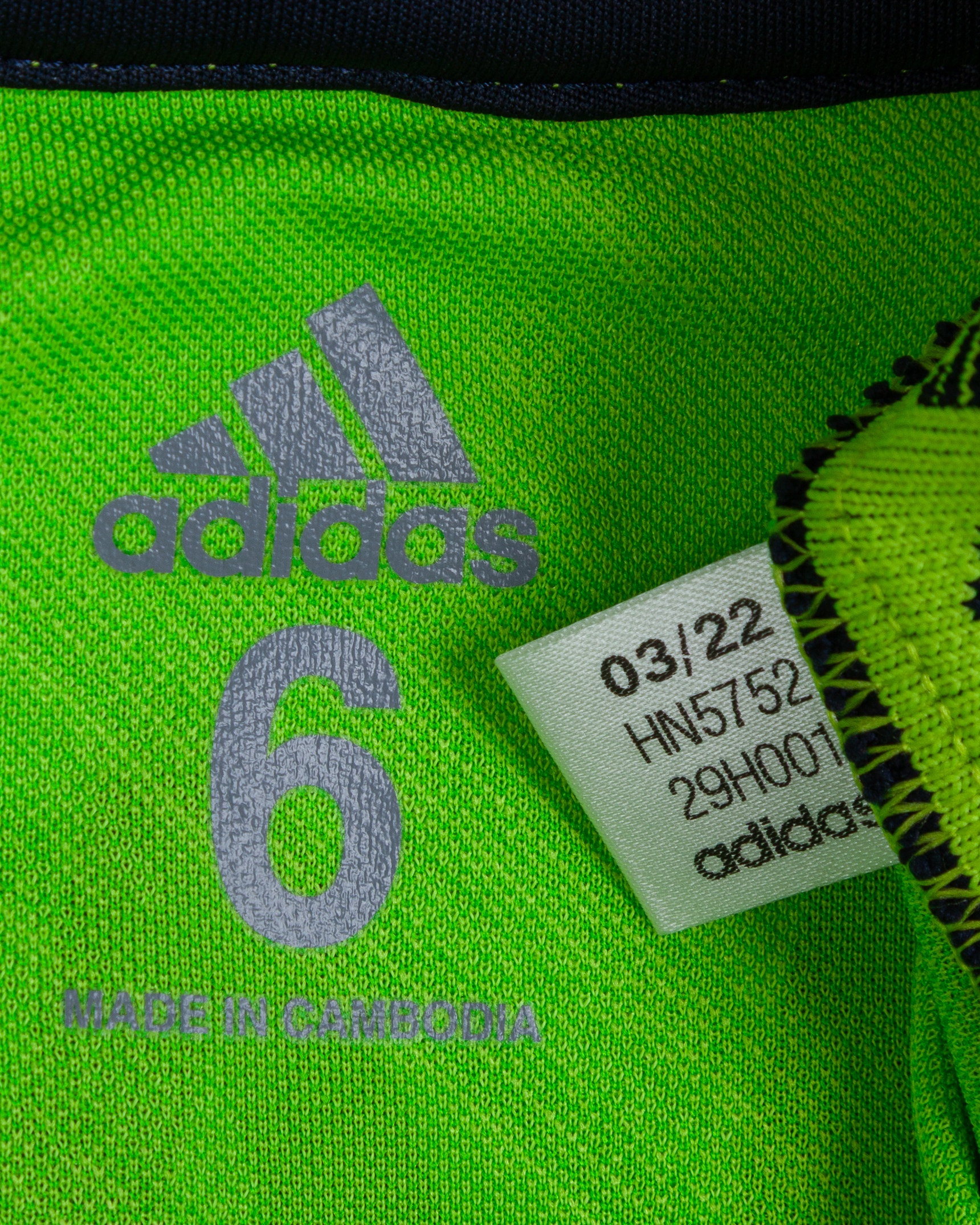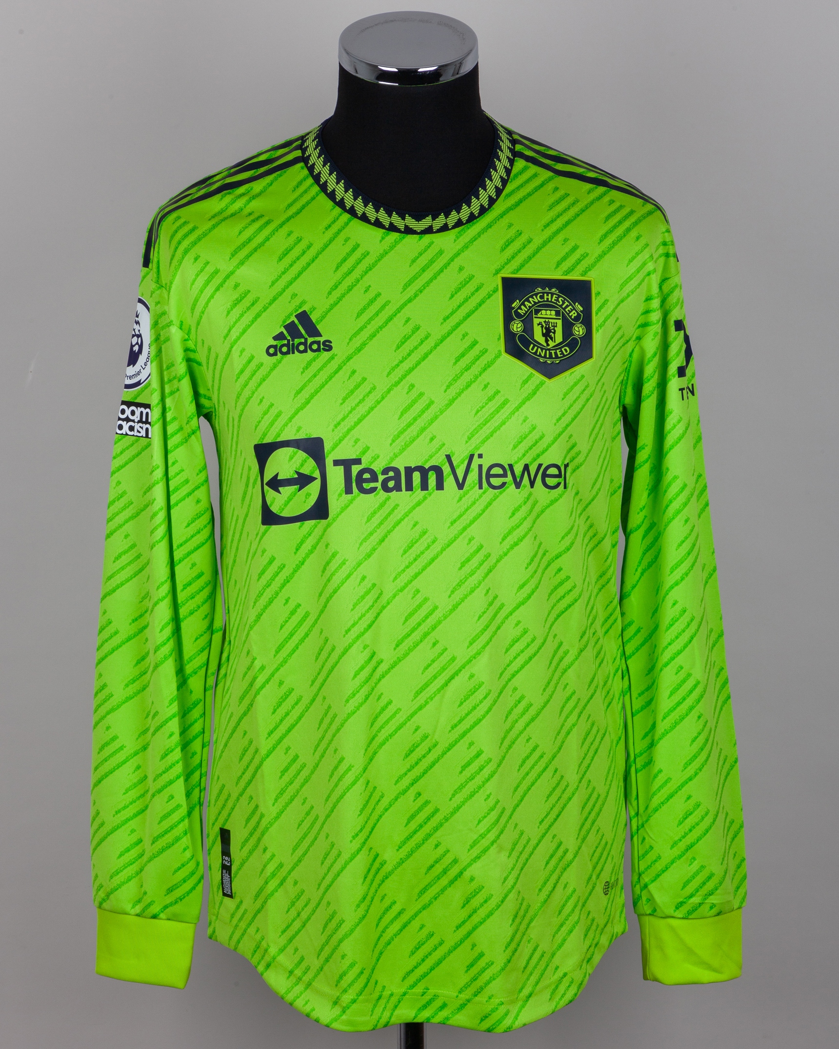 Cristiano Ronaldo green No.7 Manchester United v. Brentford long-sleeved shirt, 2022, Adidas, 6, with crew-neck collar and printed badge, the reverse lettered RONALDO, the right sleeve with Premier League flash, with slight damp smell