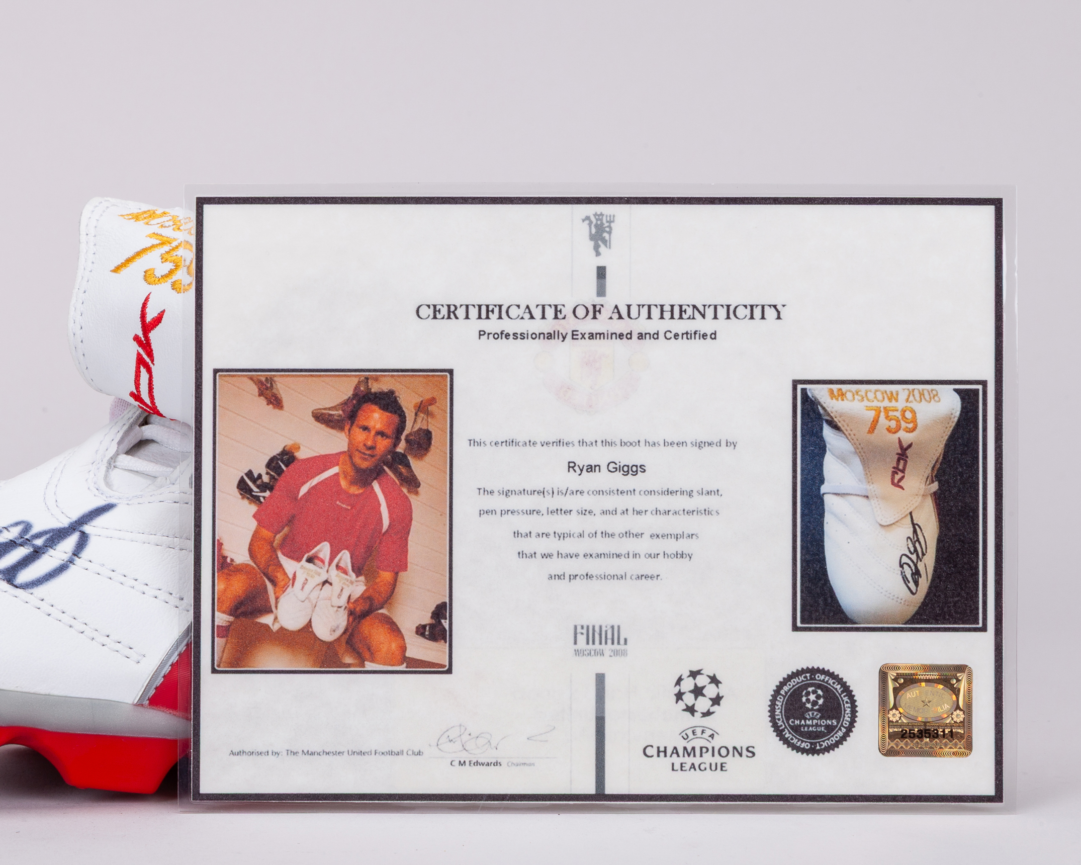 Ryan Giggs a pair of white and red Reebok Moscow 2008 759 Sprintfit autographed football boots, the left boot autographed by Ryan Giggs with COA