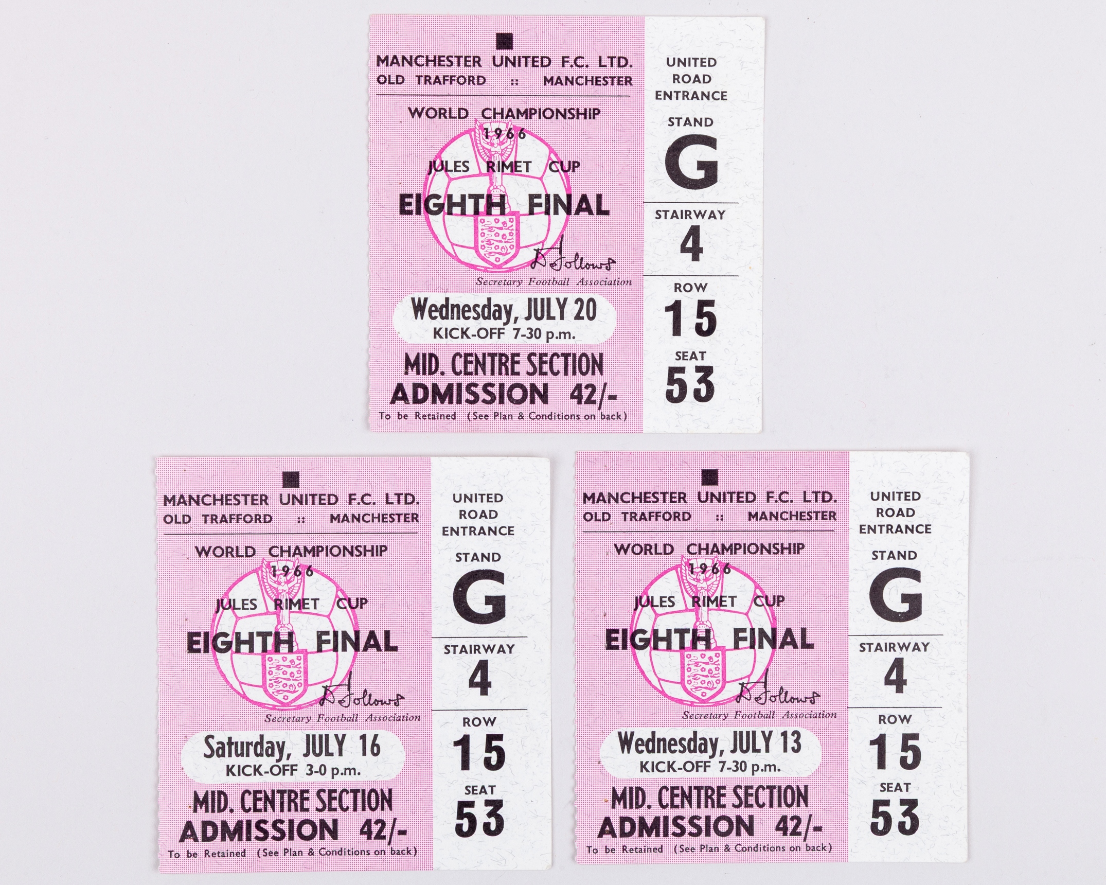Three Old Trafford 1966 World Cup tickets, 13th July, 16th July and 20th July (3)