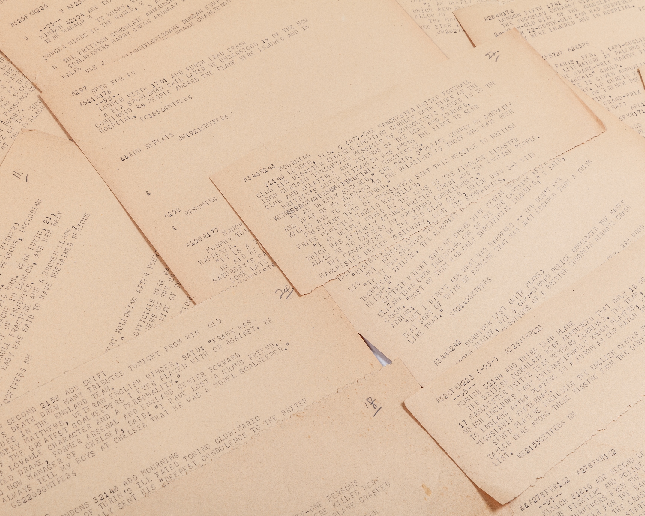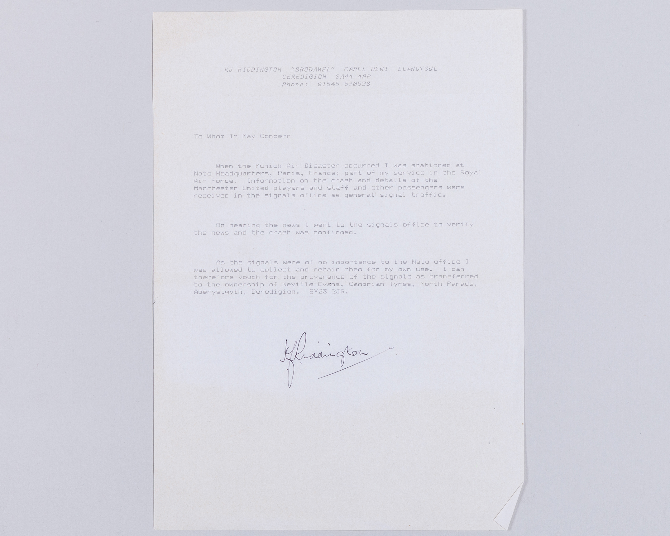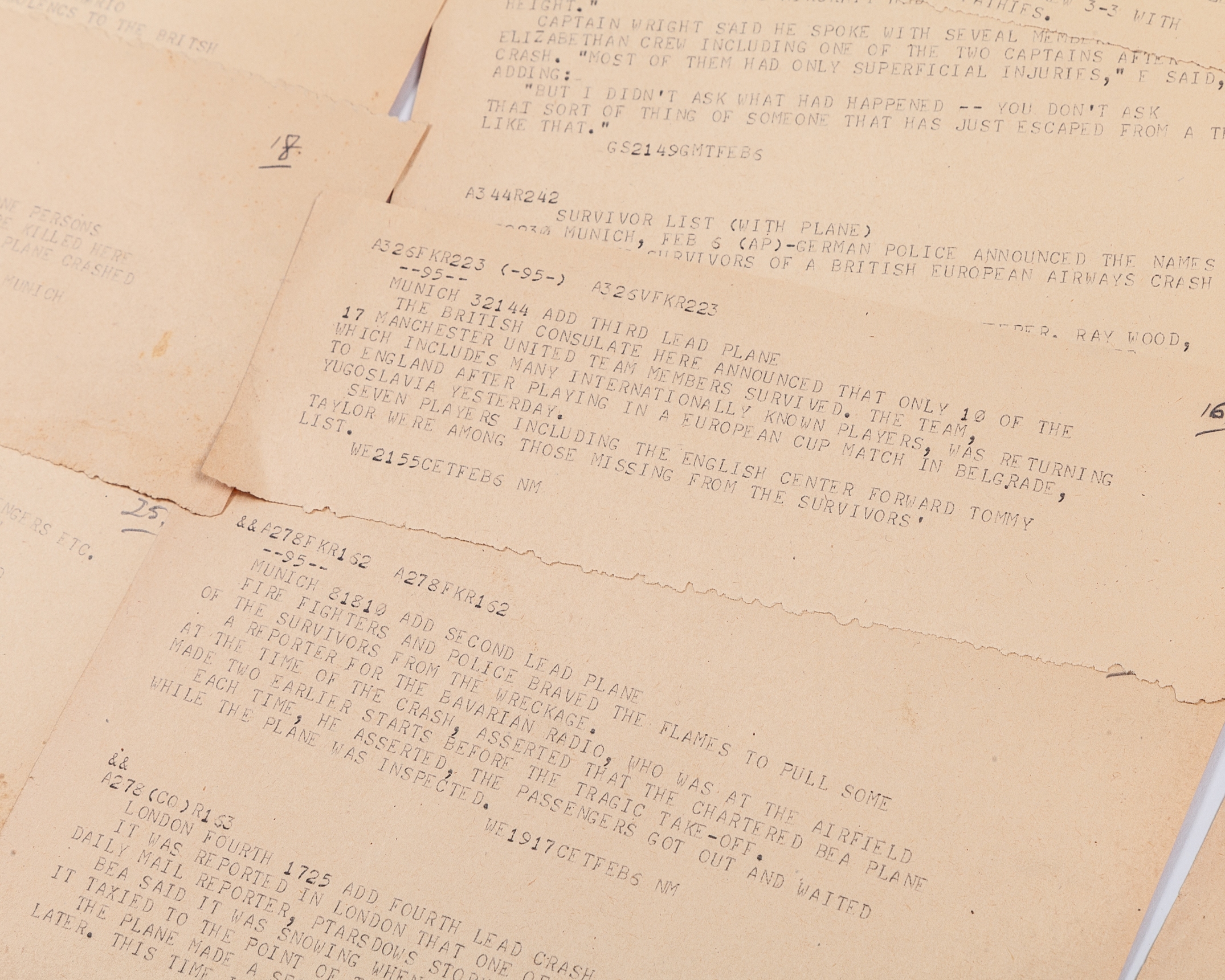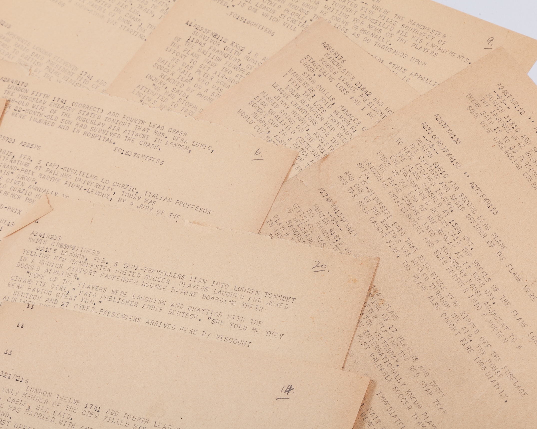 Munich Air Disaster - a rare and interesting group of NATO signals regarding the Munich Air Disaster, comprising twenty-five brown paper sheets covering updates as information of the tragic events became clear, with letter from a then serving RAF staff member stationed at NATO
