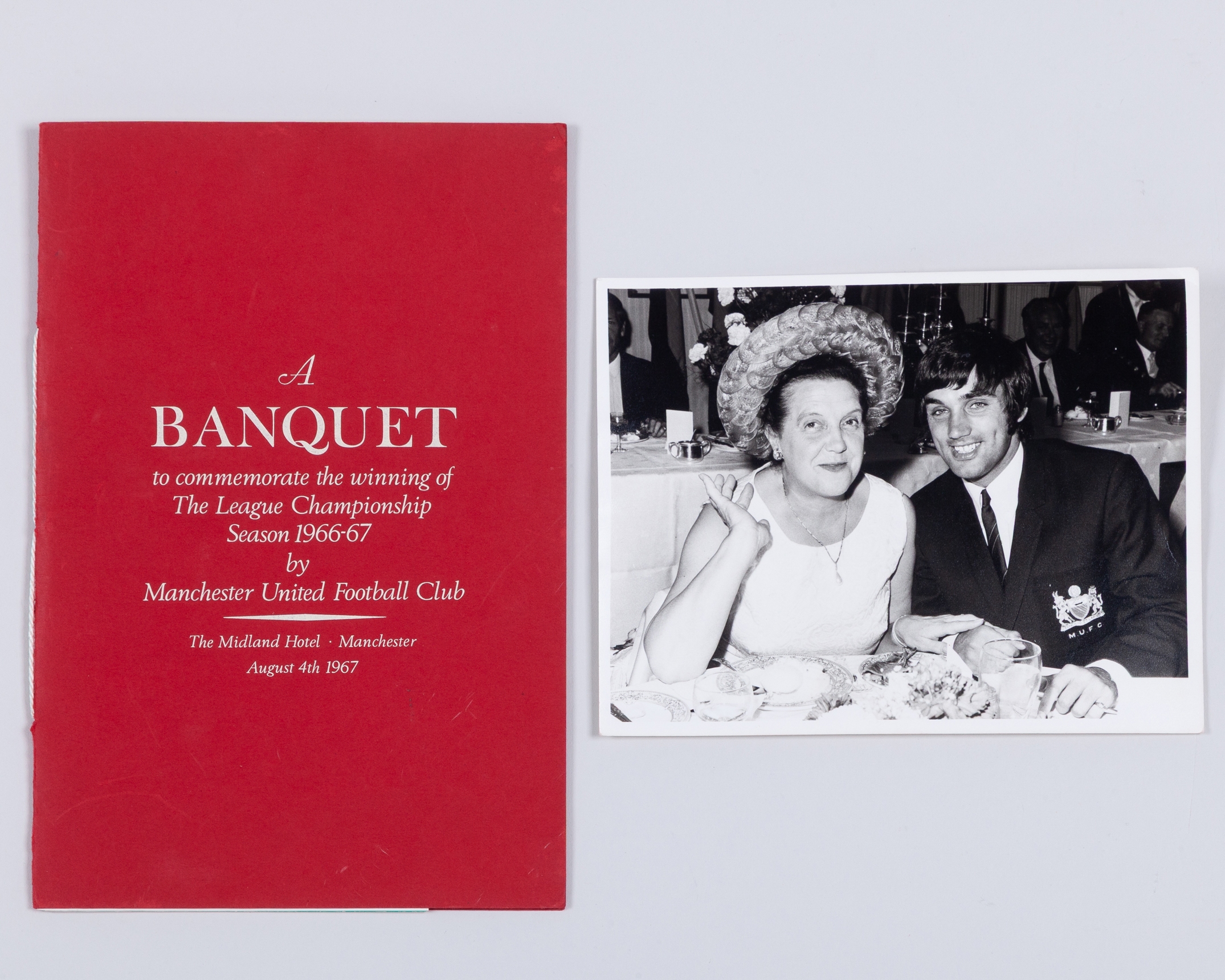 A Manchester United 1966-67 menu card to commemorate the League Championship with press photograph of George Best