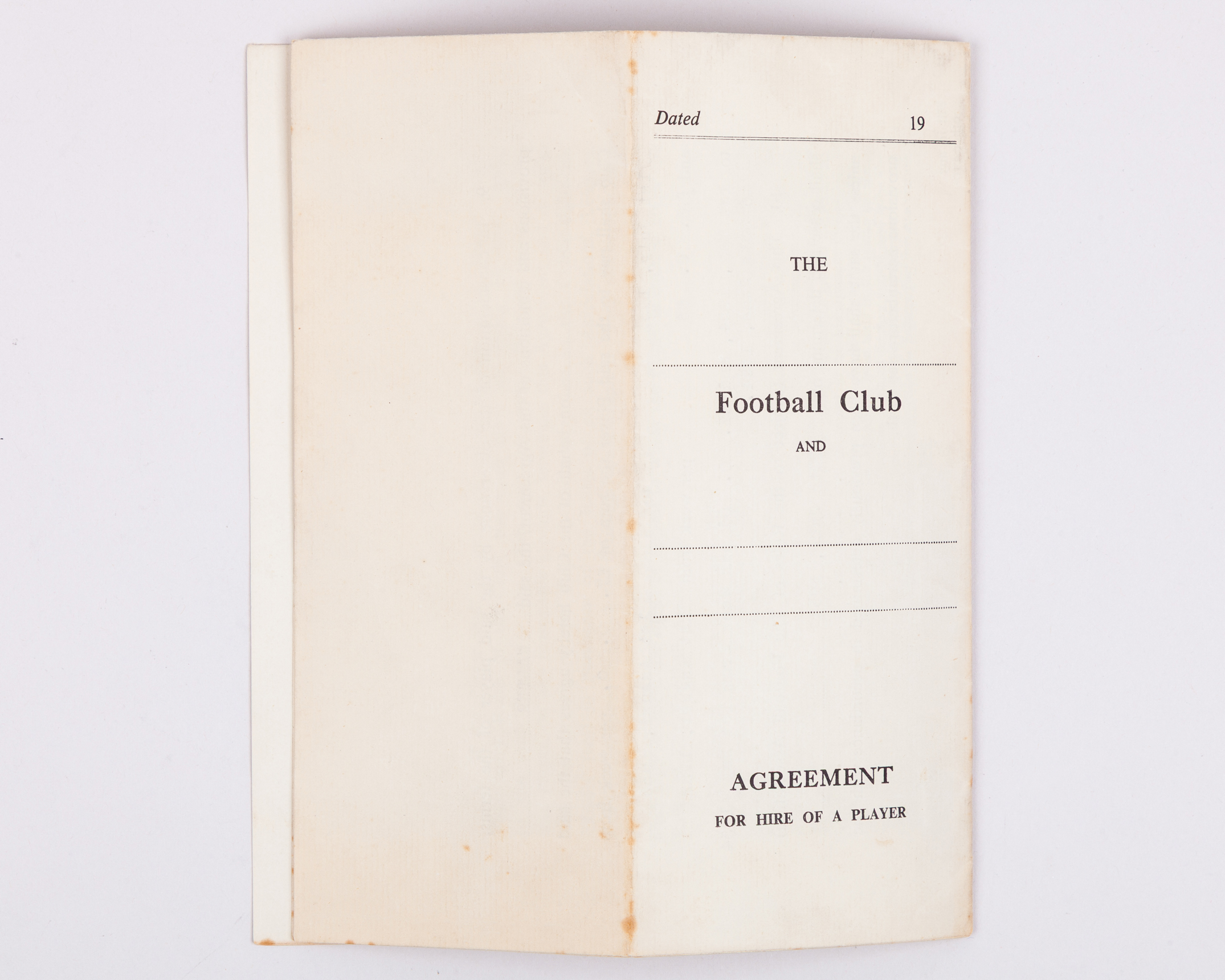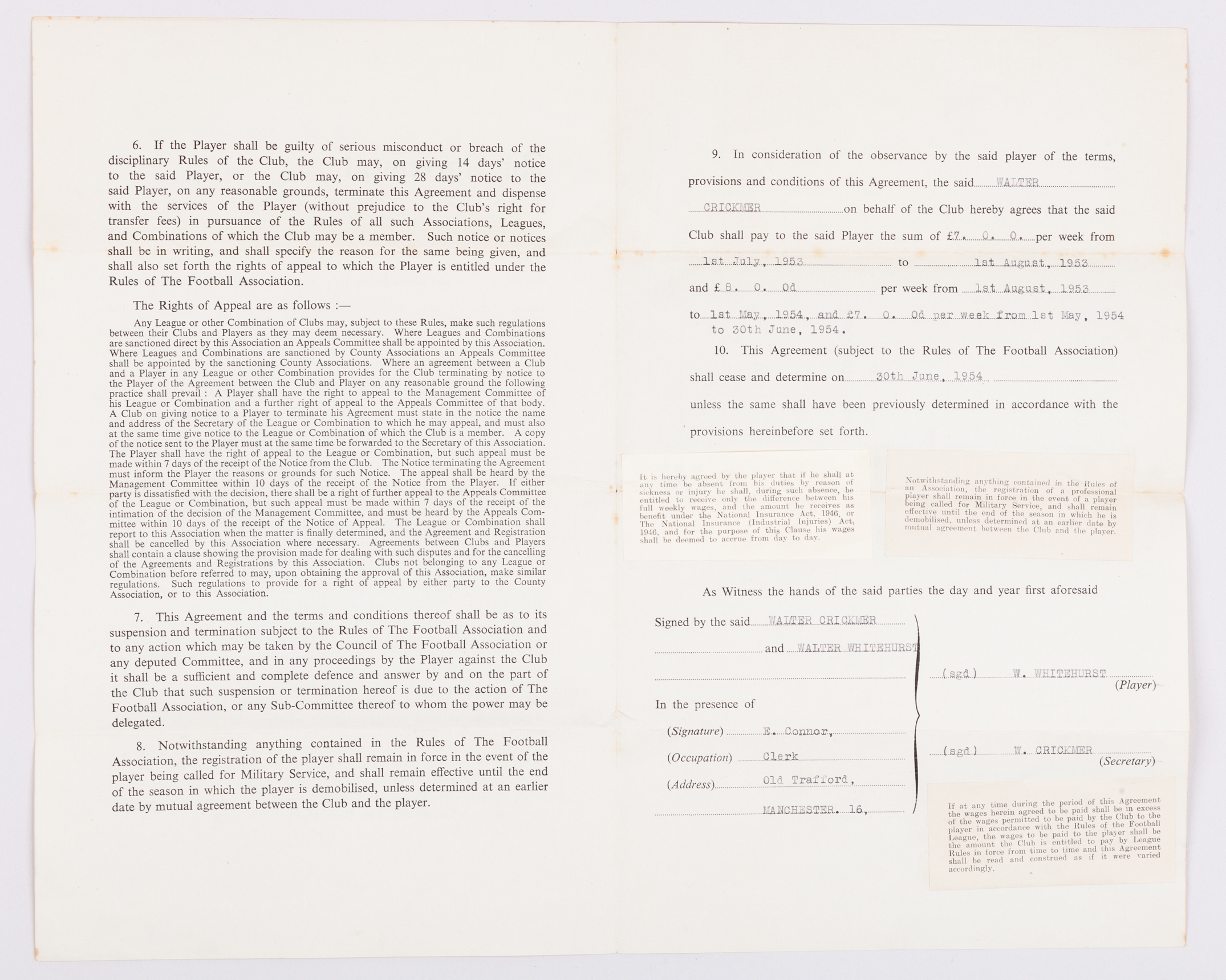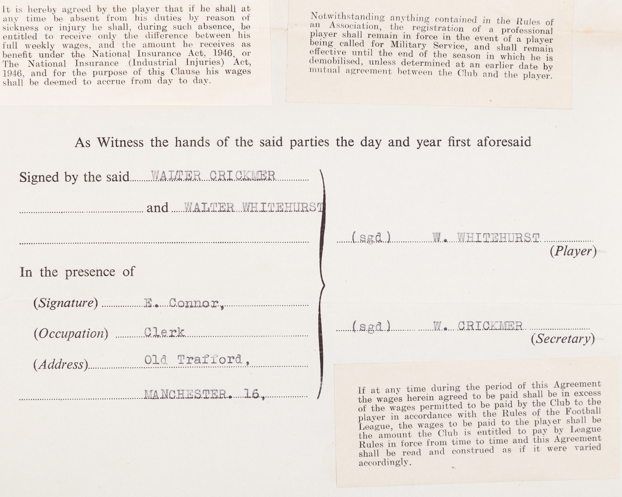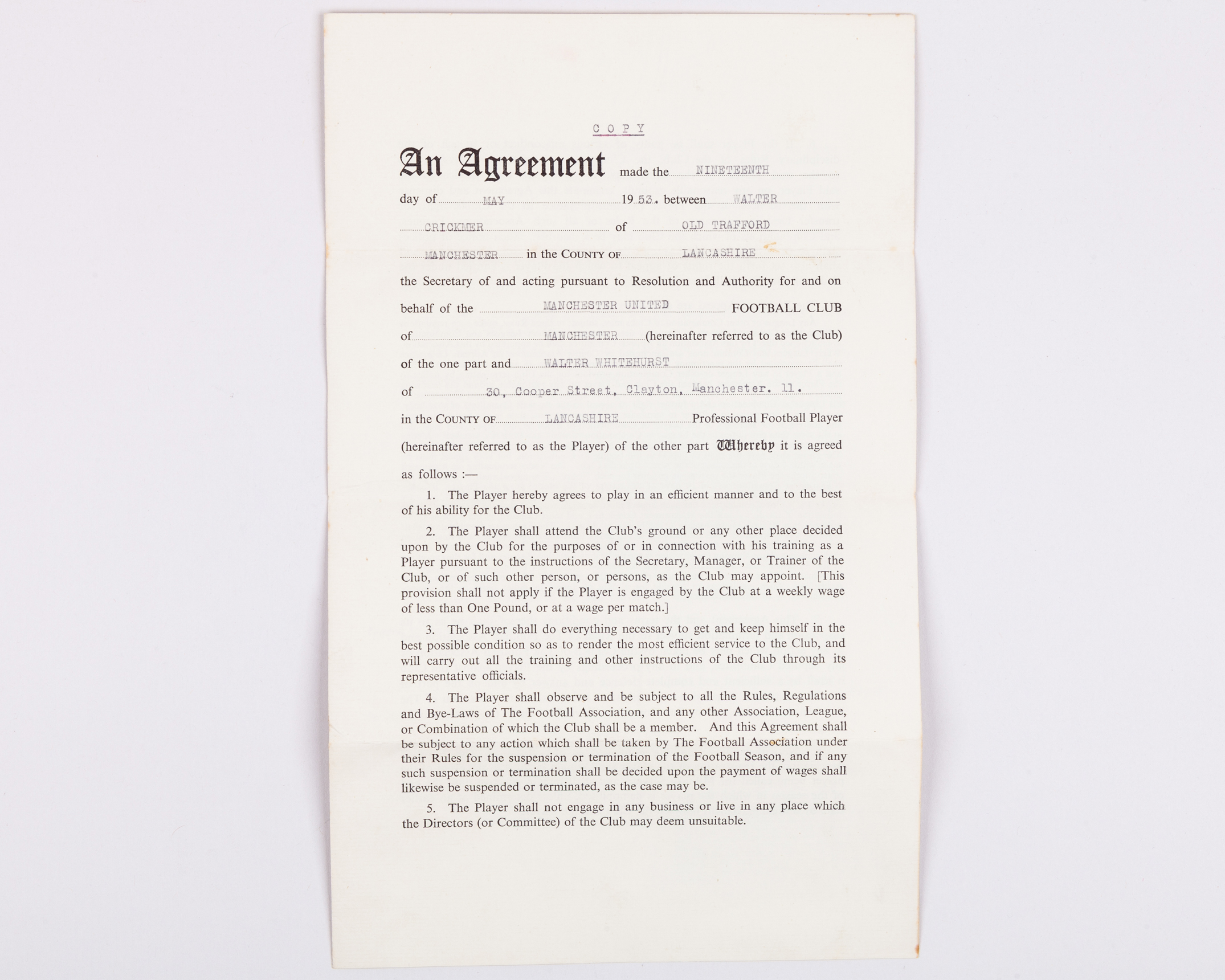 Manchester United Player's Contract for Walter Whitehurst in season 1953-54, drawn up on behalf of MUFC by the Club Secretary Walter Crickmer