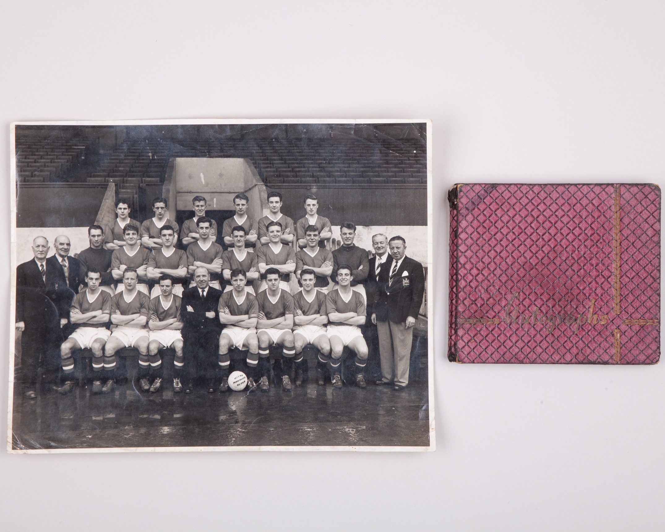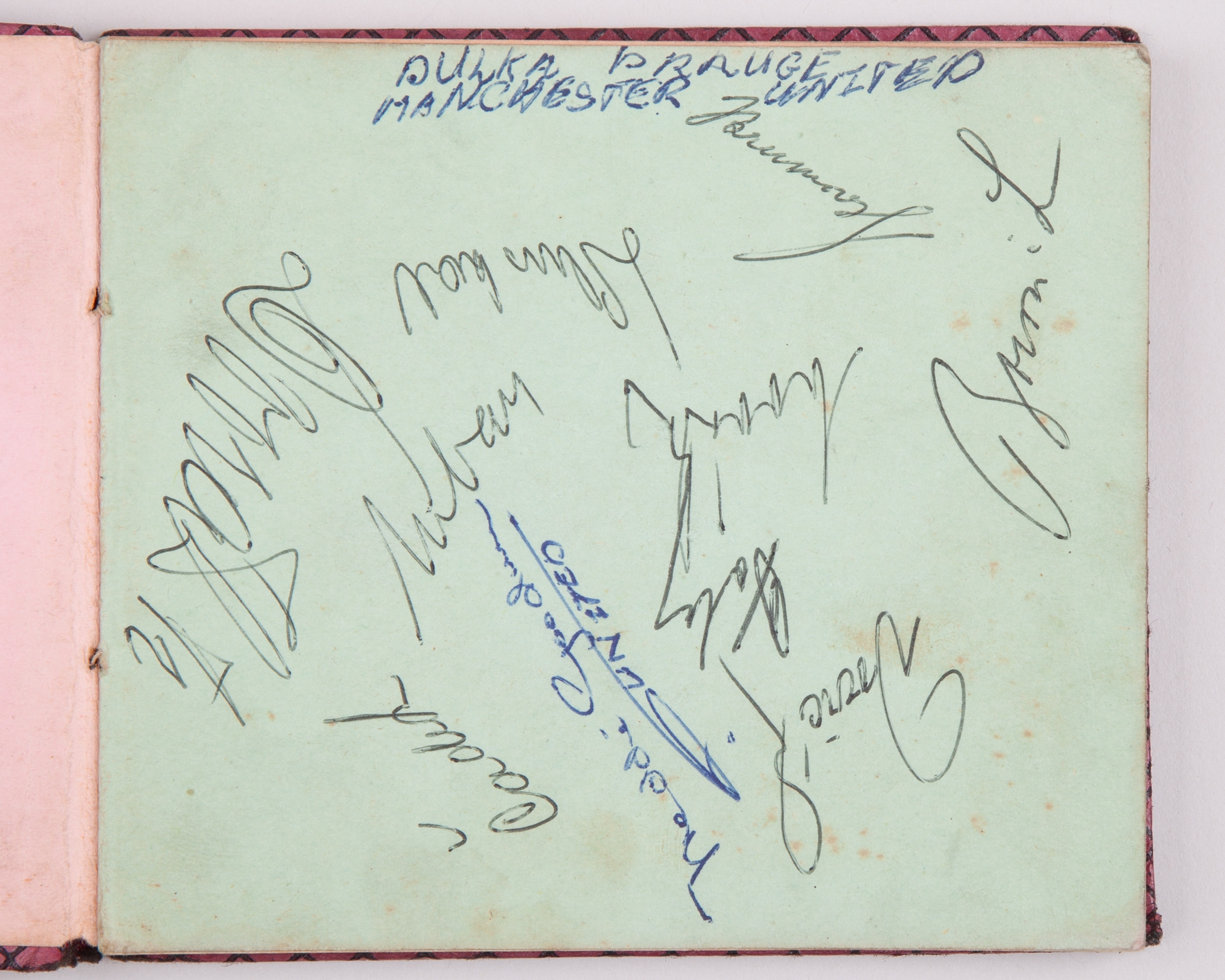Real Madrid: a page of autographs, following a match against Manchester United, bearing thirteen autographs including Puskas (signed twice), Di Stefano, Gento, Vidal etc another page bearing Dukla Prague autographs, the page alos autographed by United's Freddie Goodwin and a black and white press photograph of Manchester United team line-up, 1957