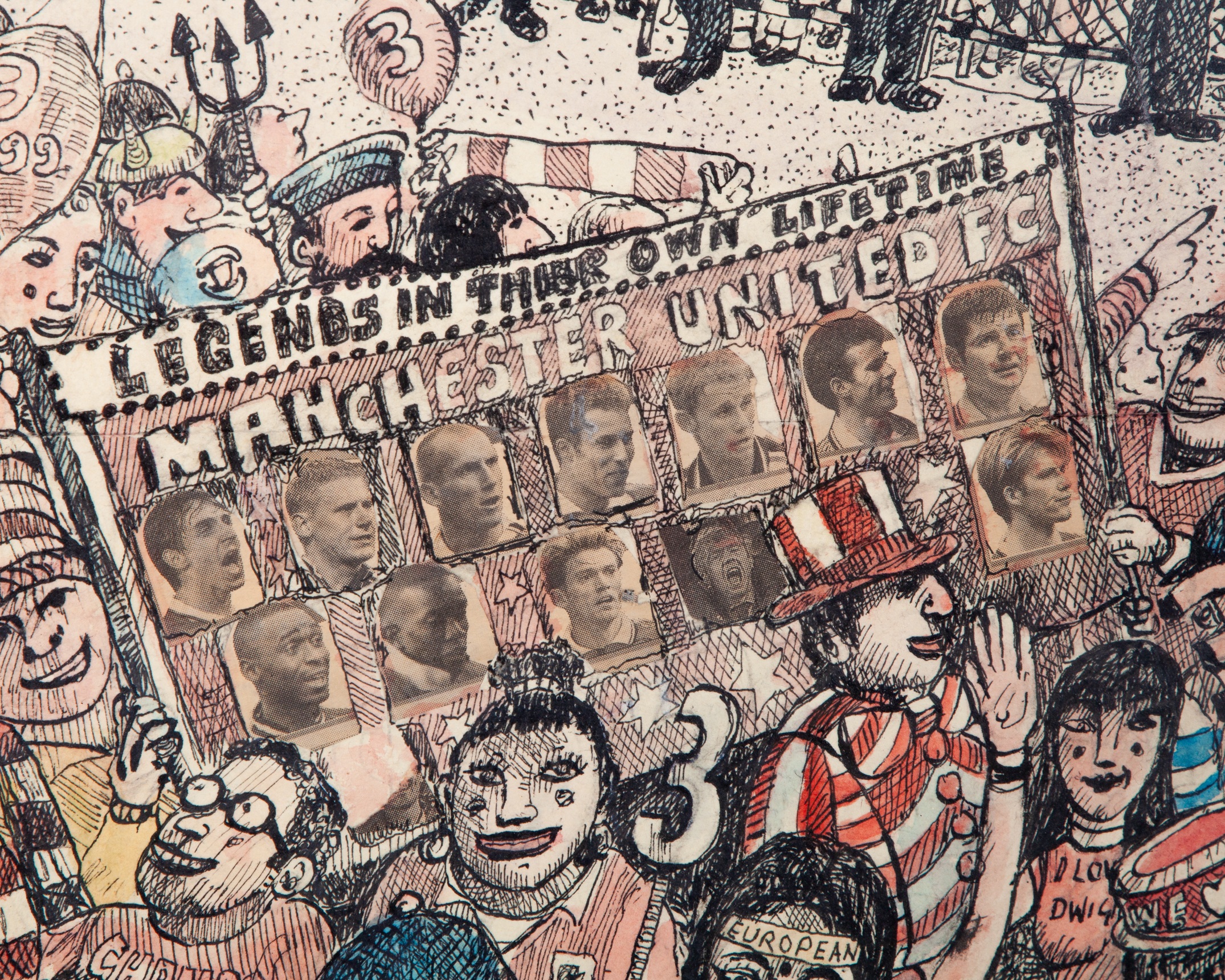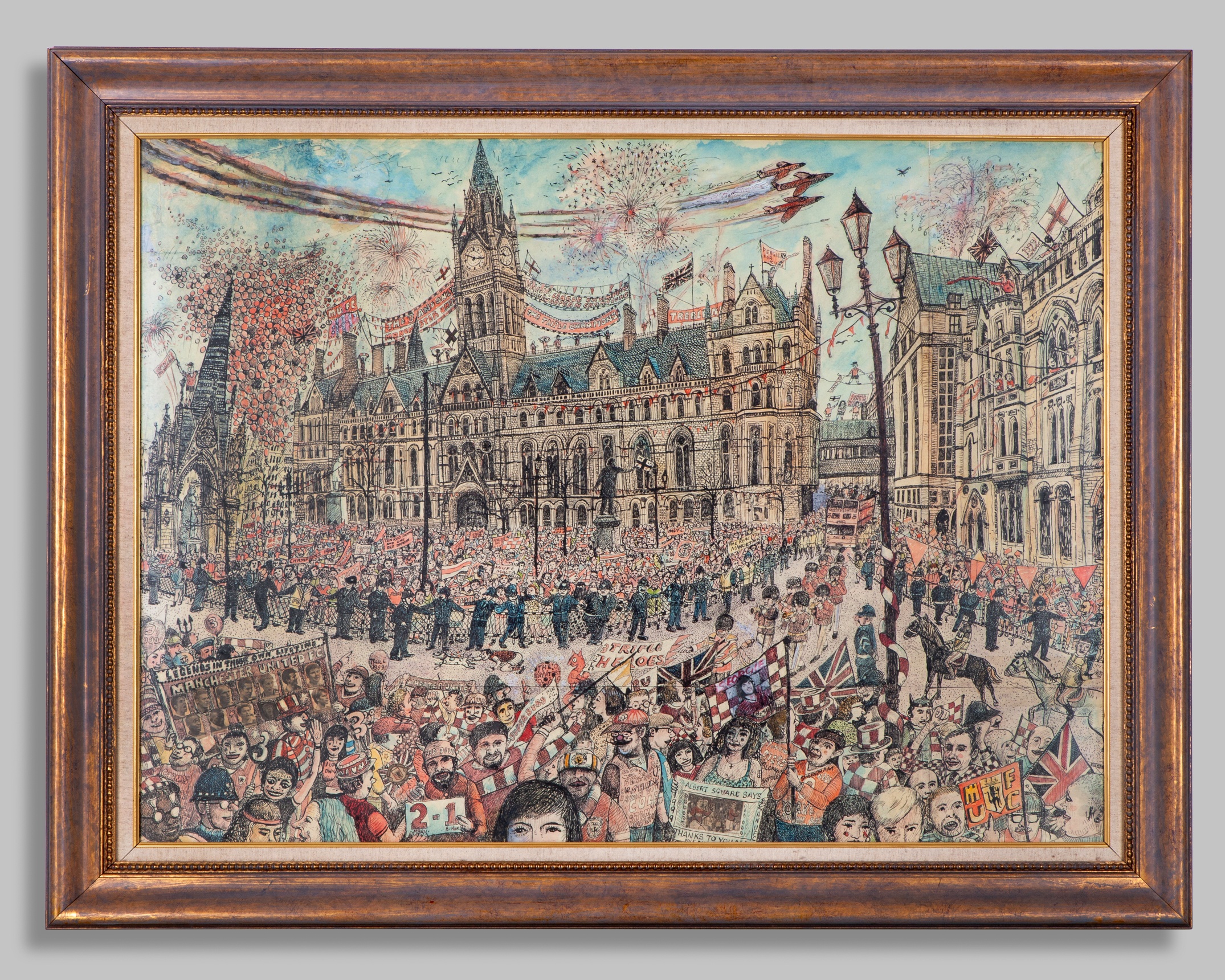 Mick Davies RBA Manchester United 1998-99 Treble Bus Parade in front of Manchester Town Hall, ink, watercolour and collage, 71 x 99cm, framed and glazed