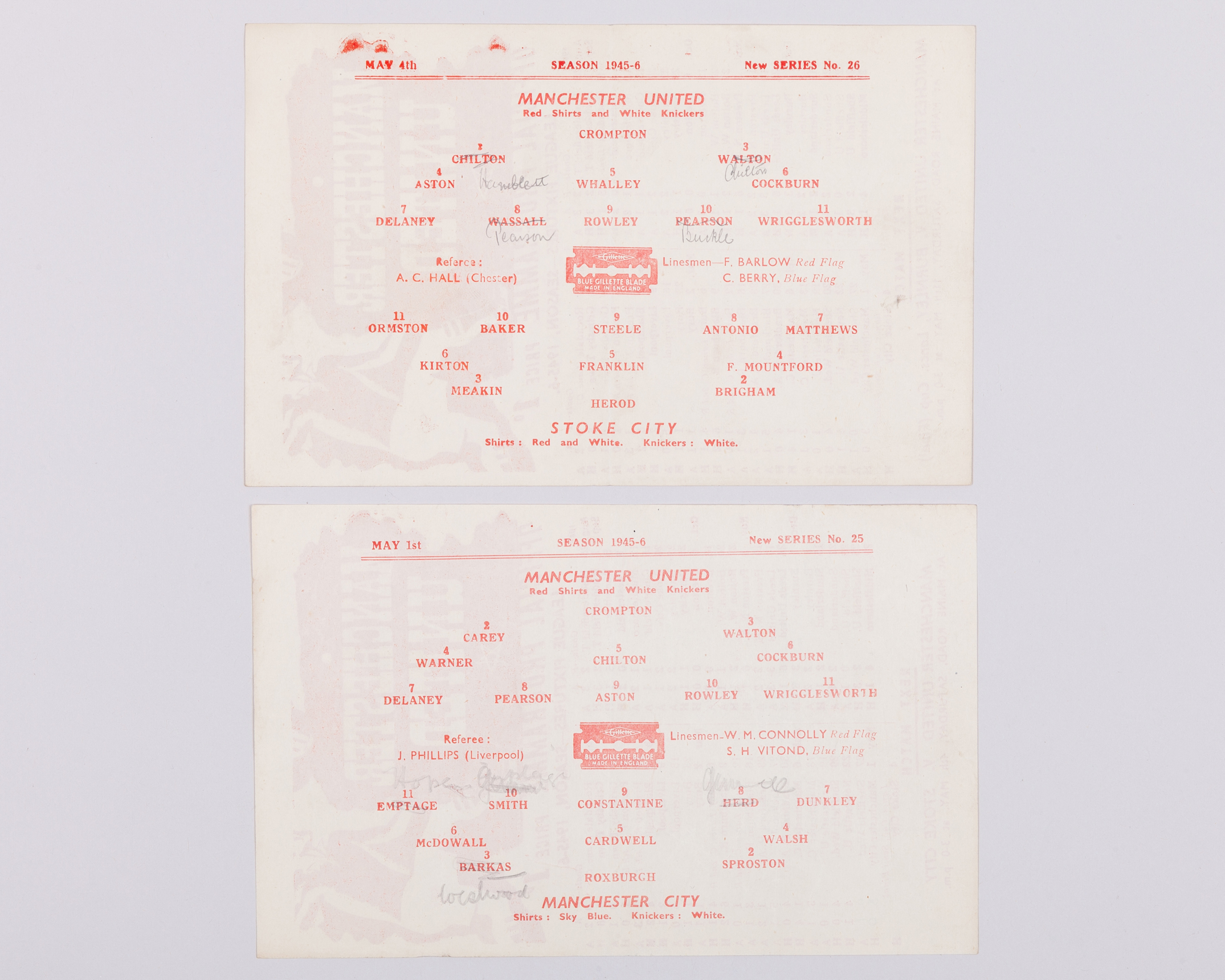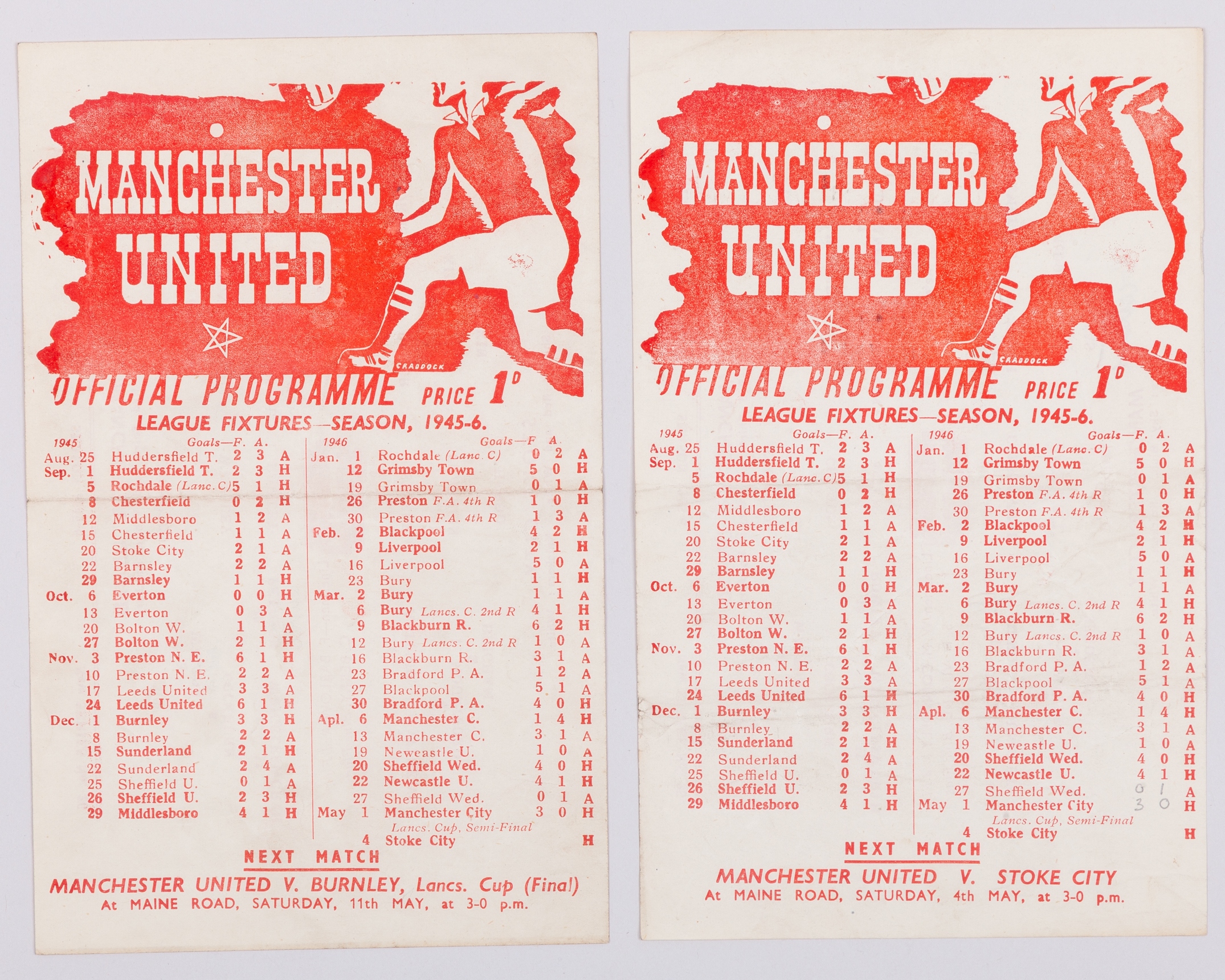 Two Manchester United single-sheet match programmes, 1945, comprising Manchester City, 1st May 1945, text on team page and Stoke City, 4th May 1945, text of team page (2)