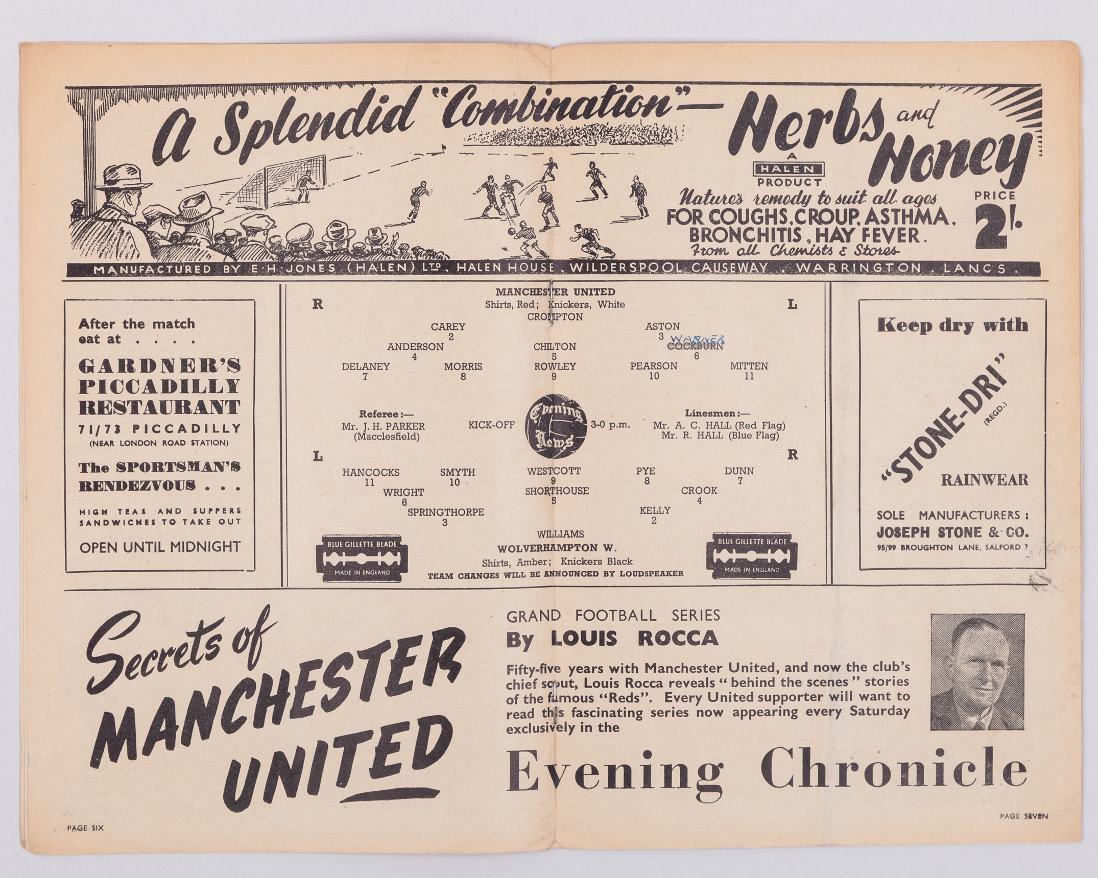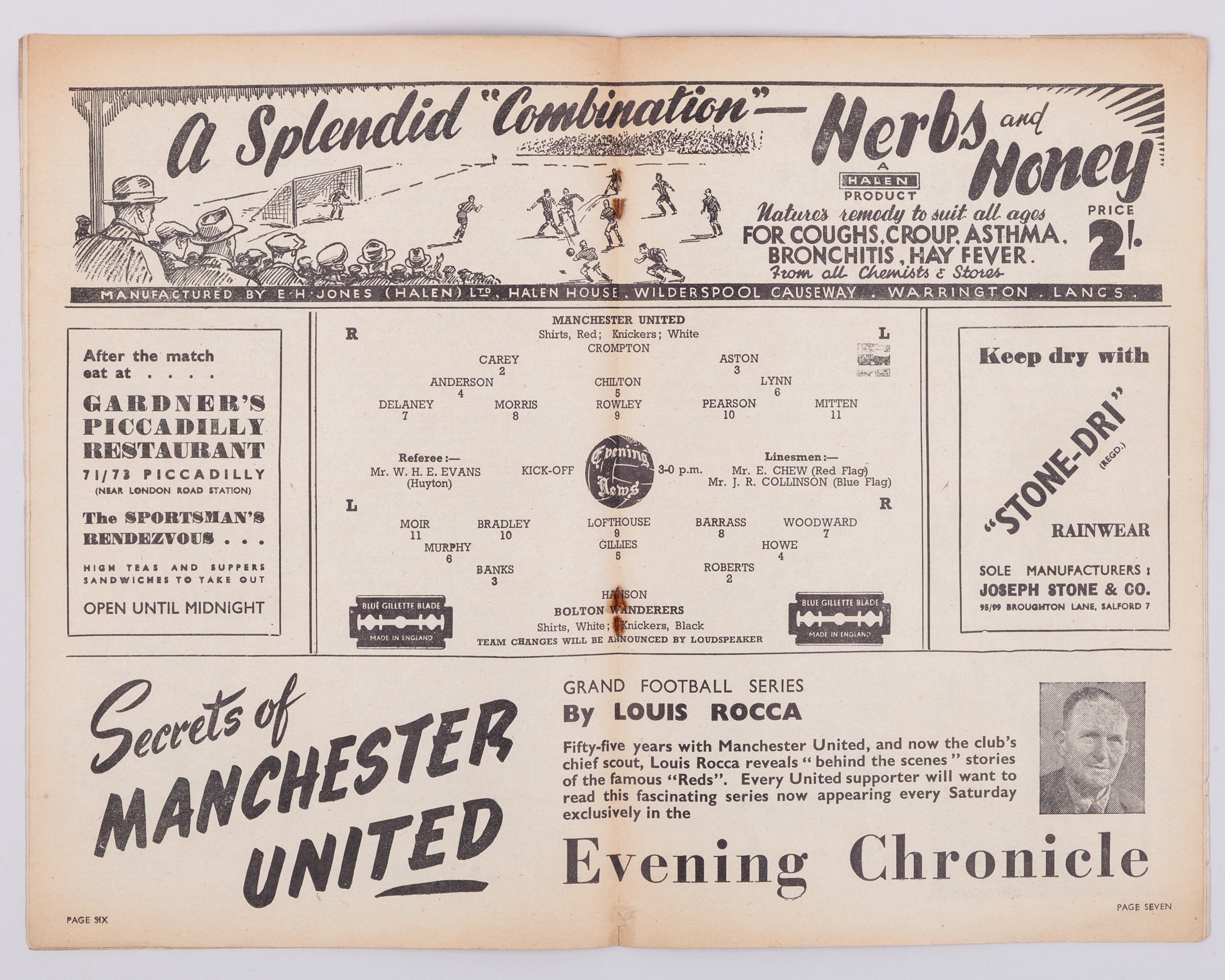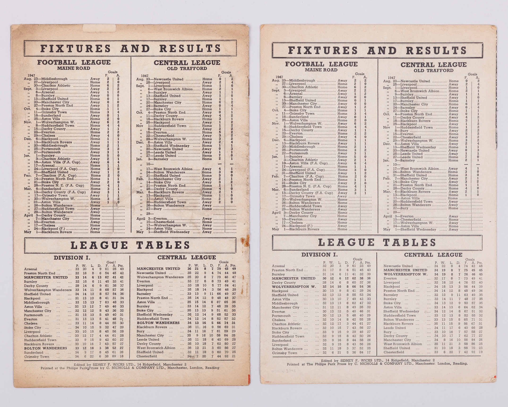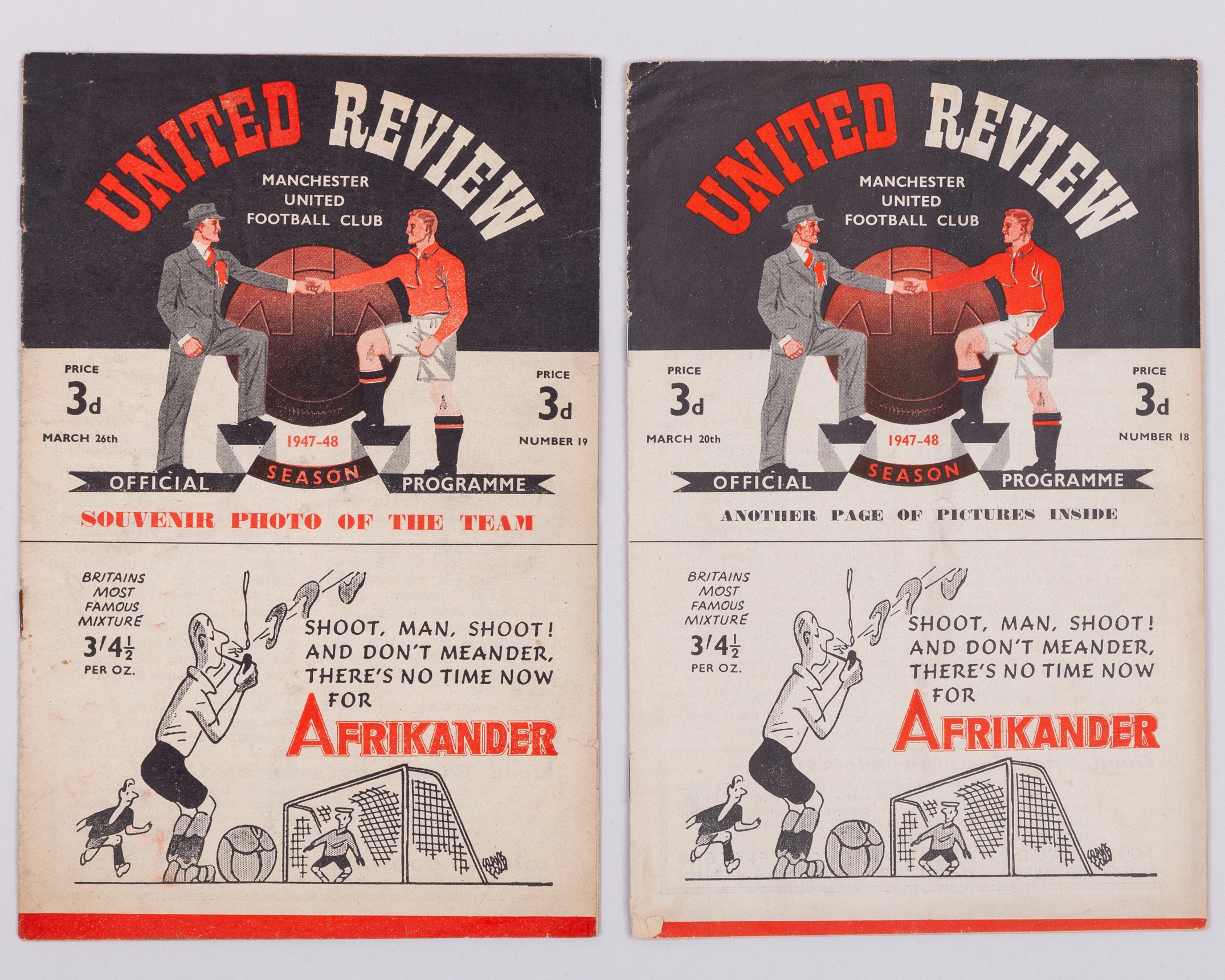 Two Manchester United home match programmes, 1948, comprising Wolverhampton Wanderers, 20th March 1948 and Bolton Wanderers, 26th March 1948, folds, text on team pages (2)