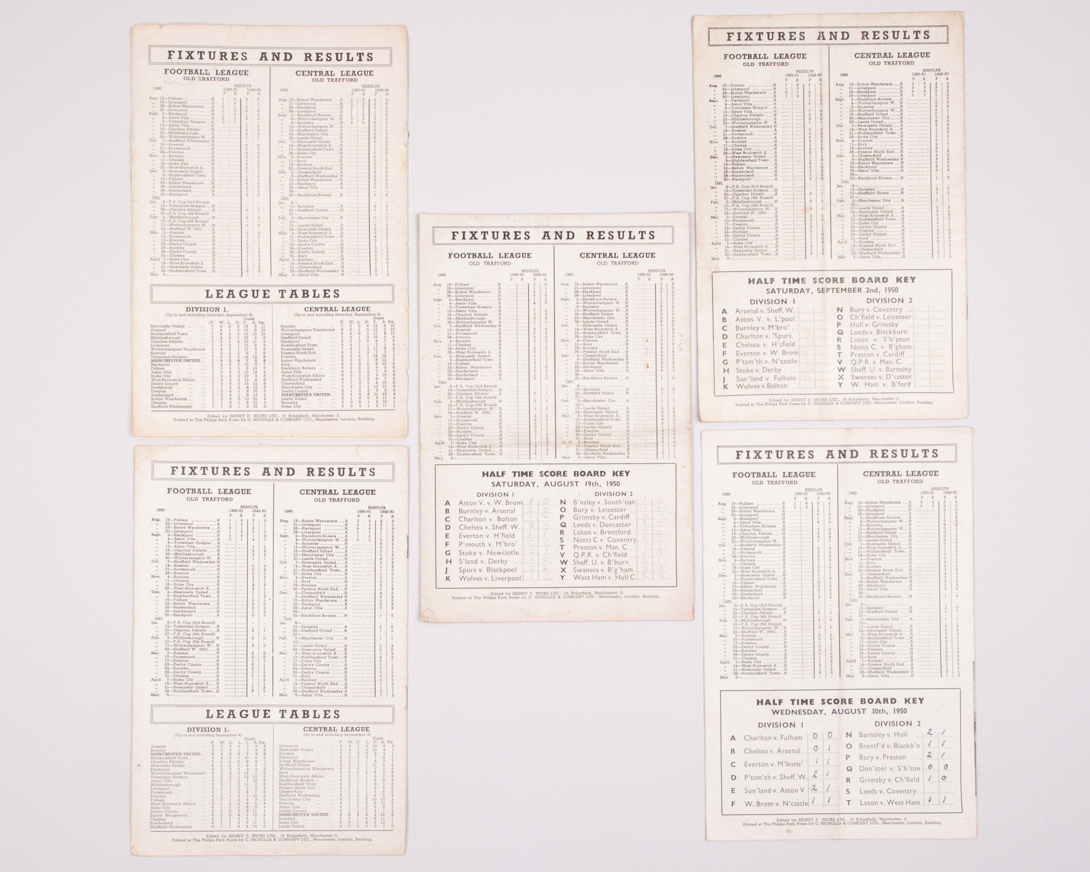 Five Manchester United home match programmes, 1950, comprising Fulham, 19th August 1950, text on team page, Liverpool, 30th August 1950, Blackpool, 2nd September 1950, Aston Villa, 13th September 1950 and Charlton, 16th September 1950s, folds (4)