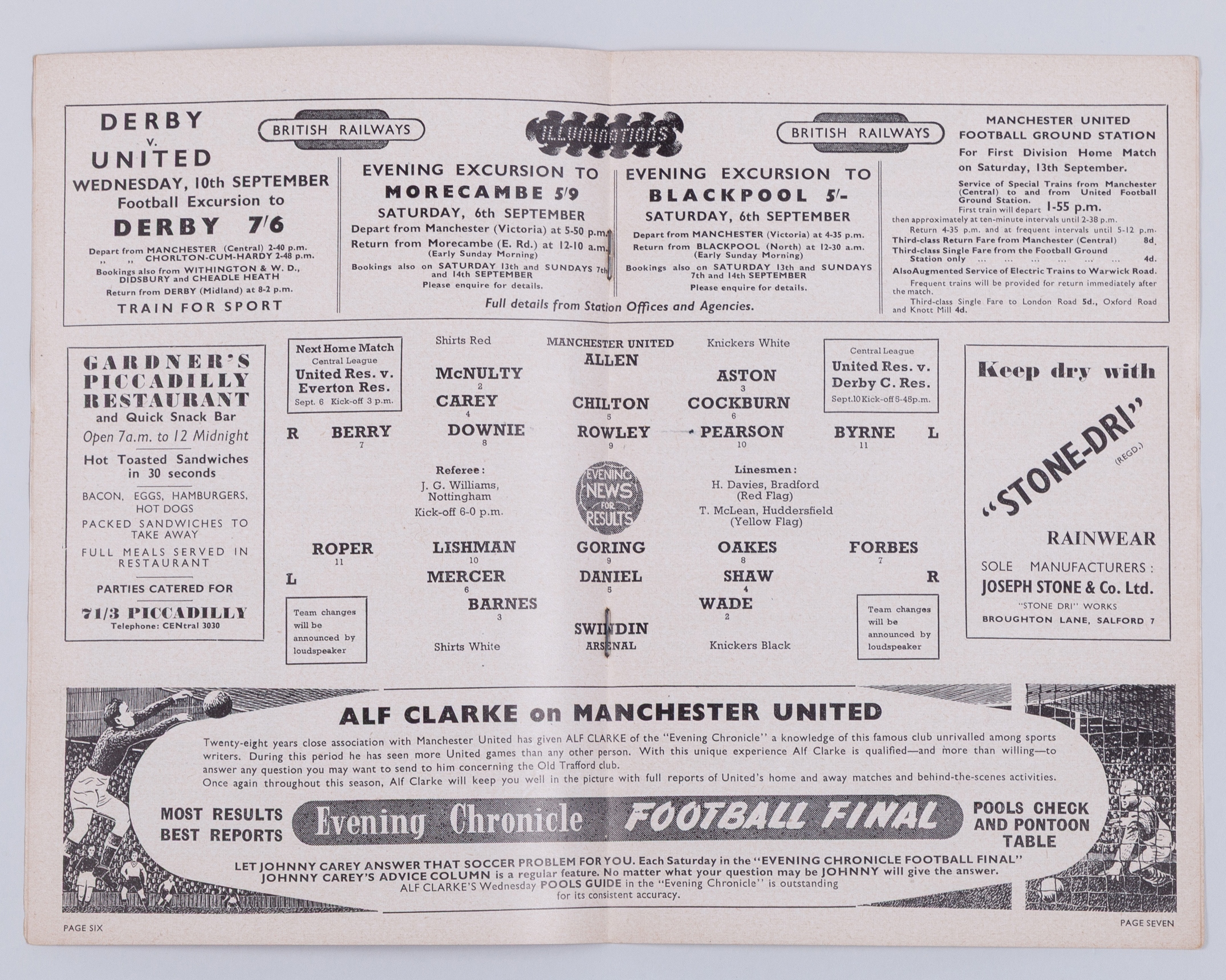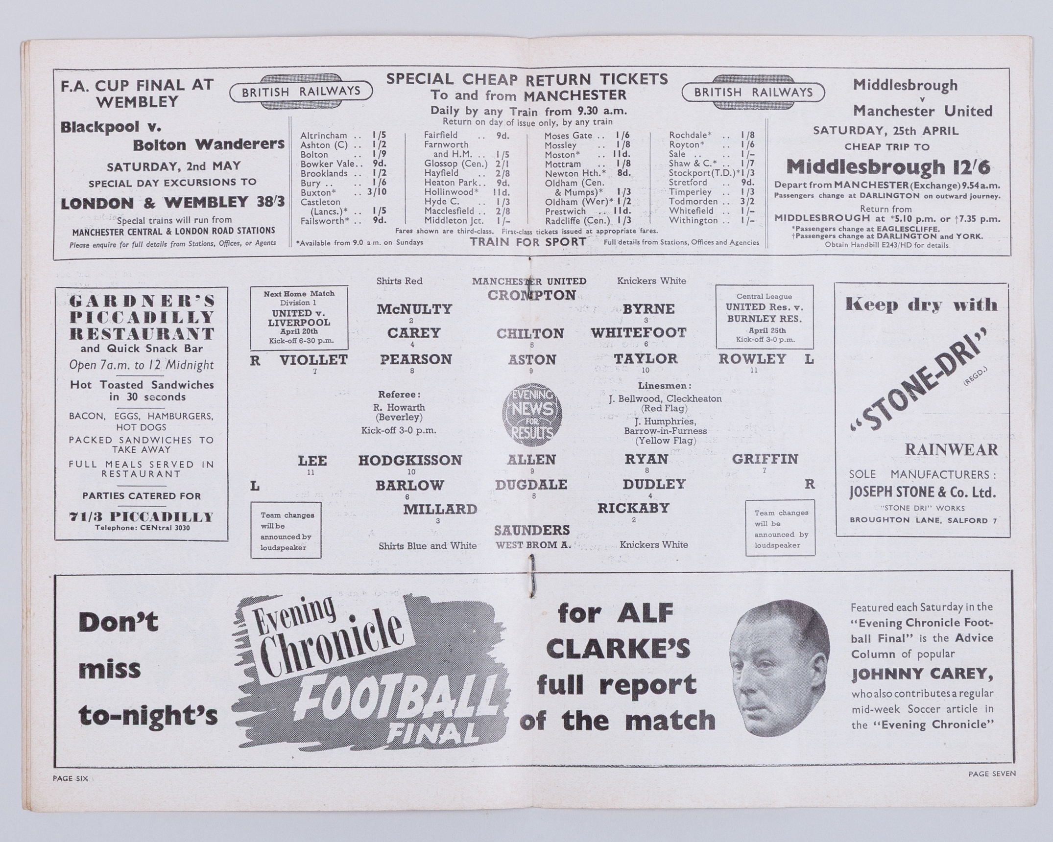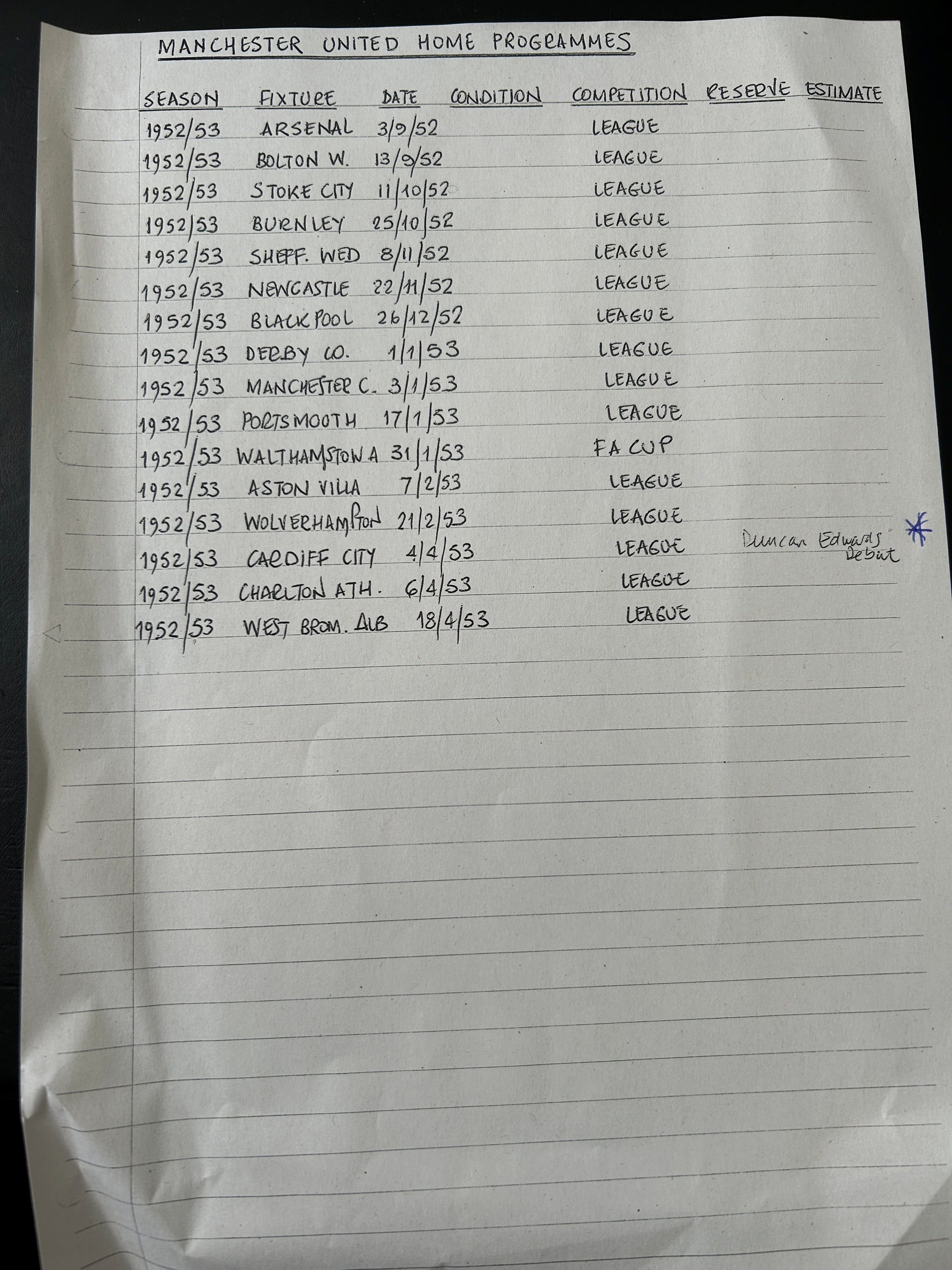 Fifteen Manchester United home league match programmes, 1952-53, including Walthamstow, F.A.Cup, 31s January 1953 and Cardiff City, Duncan Edwards debut (16)