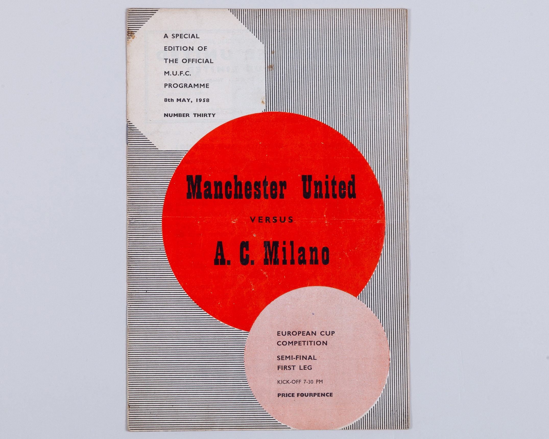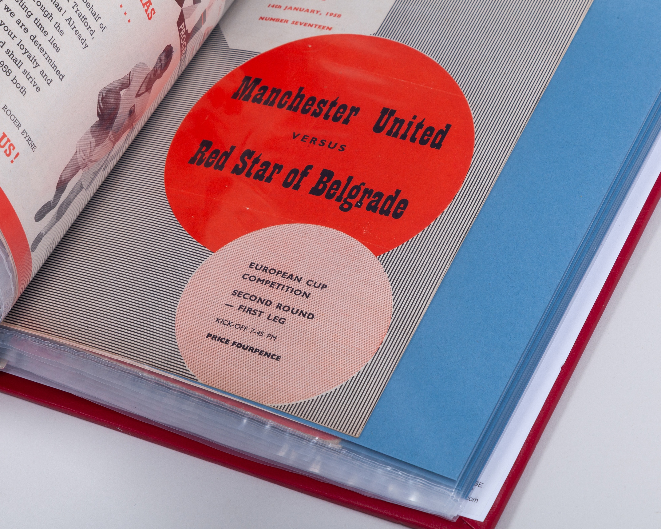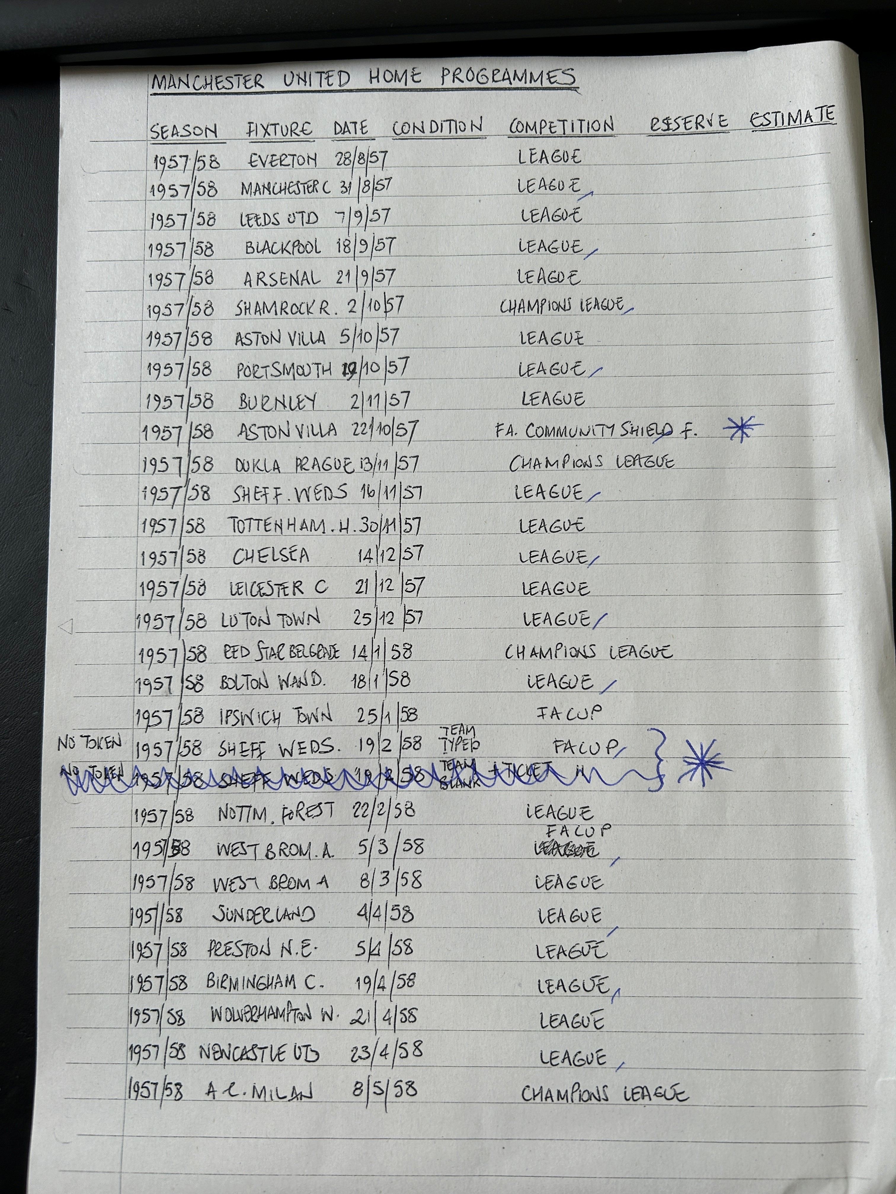 Complete run of Manchester United home league match programmes, 1957-58, lacking Birmingham City, 7th December 1957, including Charity Shield, 22nd October 1957, Shamrock Rovers, Dukla Prague, Red Star Belgrade and AC Milan, the Sheffield Wednesday programme has team neatly typed, with Barca magazine 13th February 1958 (30)