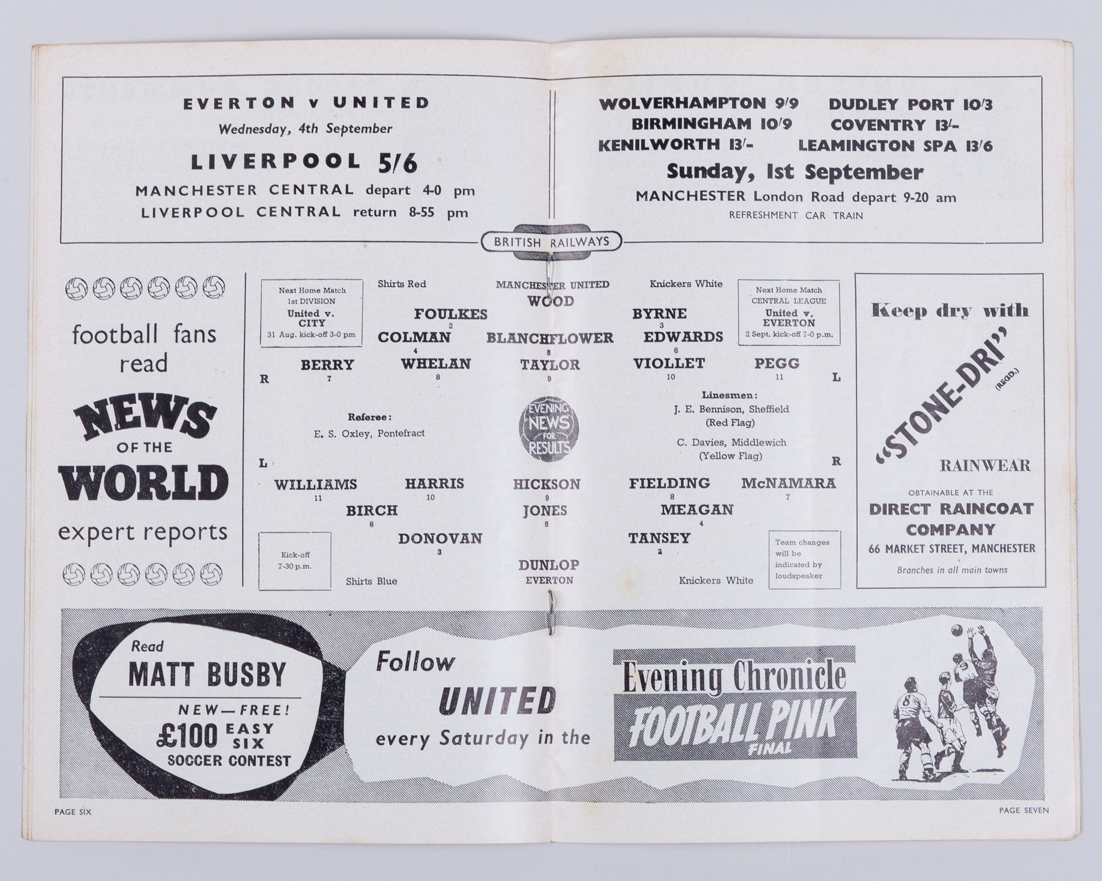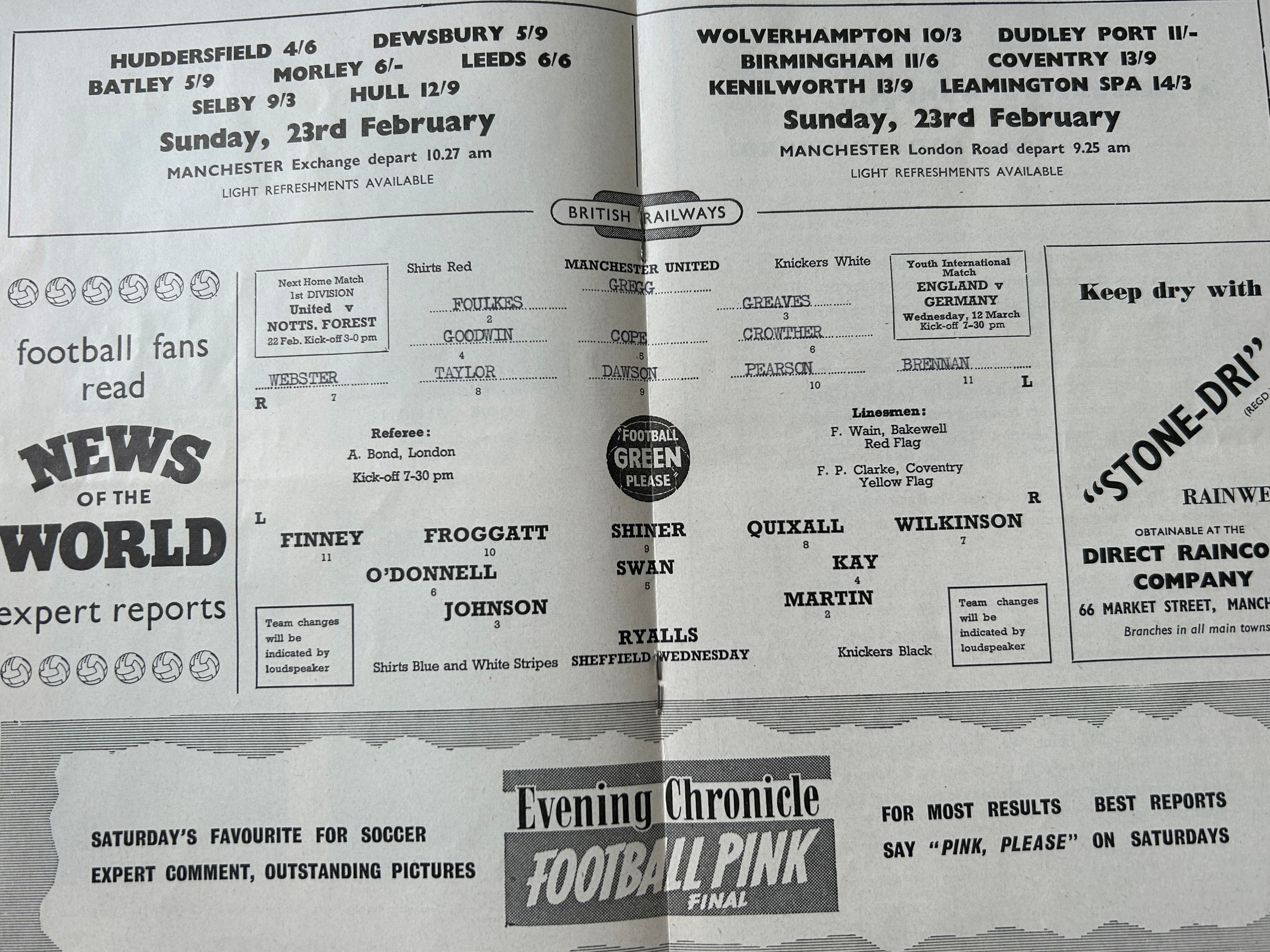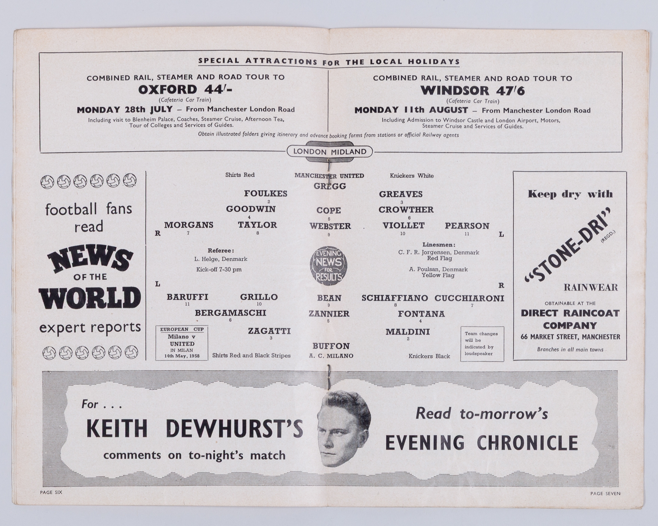 Complete run of Manchester United home league match programmes, 1957-58, lacking Birmingham City, 7th December 1957, including Charity Shield, 22nd October 1957, Shamrock Rovers, Dukla Prague, Red Star Belgrade and AC Milan, the Sheffield Wednesday programme has team neatly typed, with Barca magazine 13th February 1958 (30)